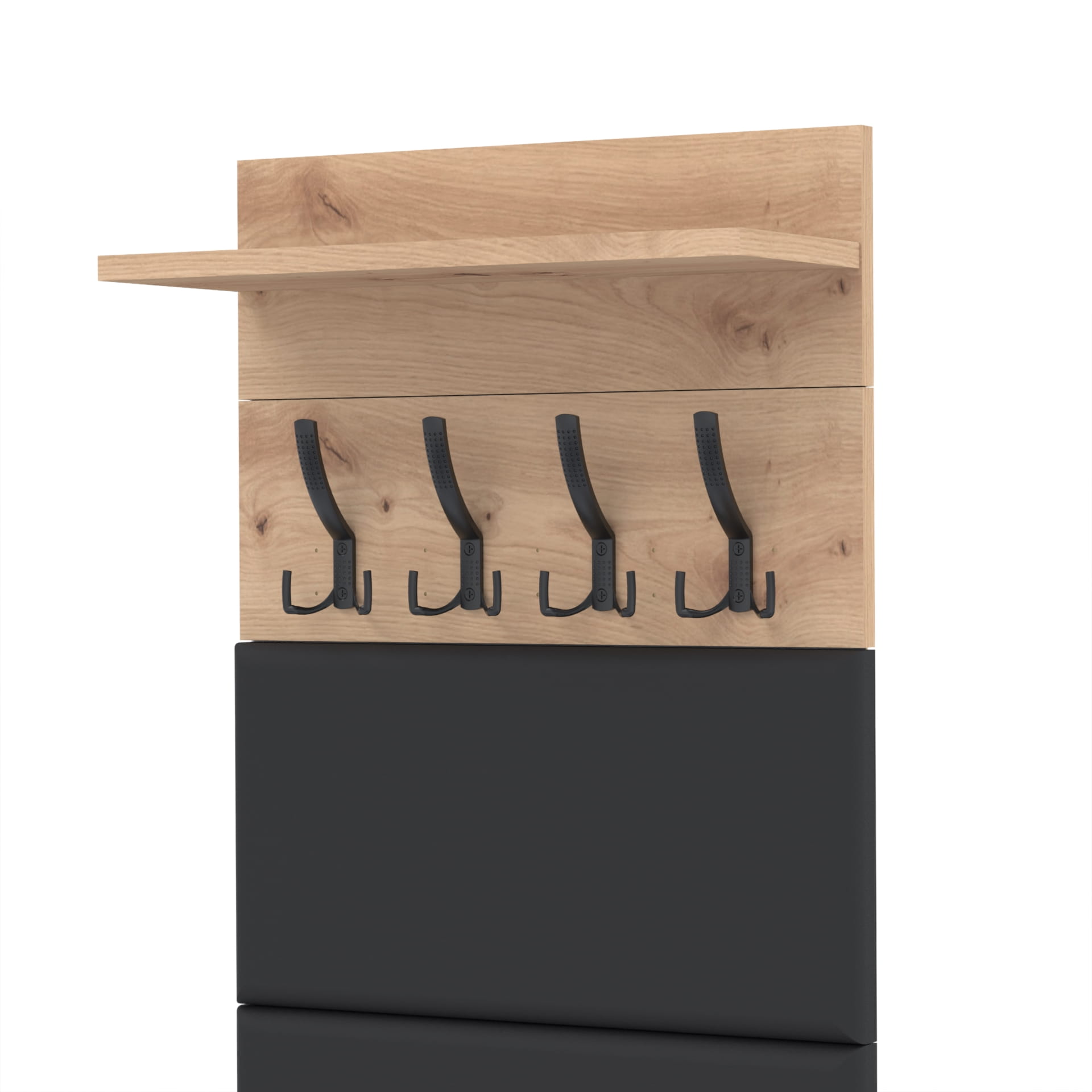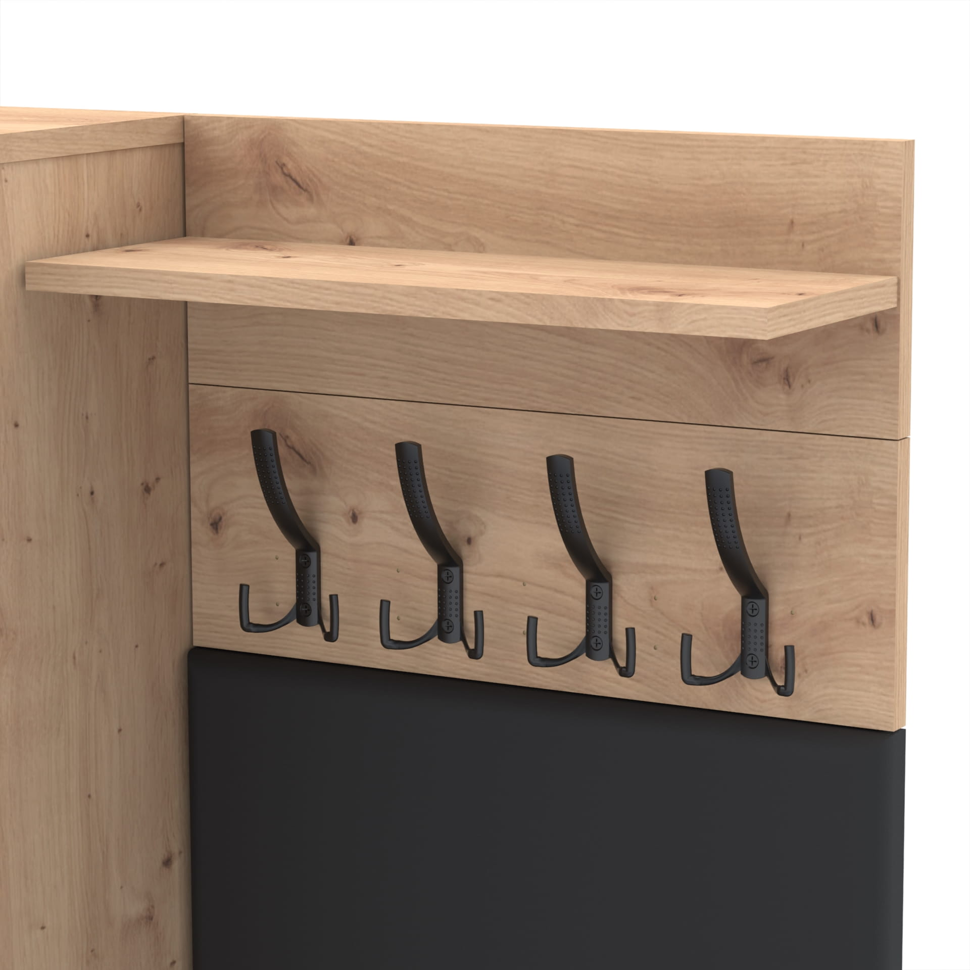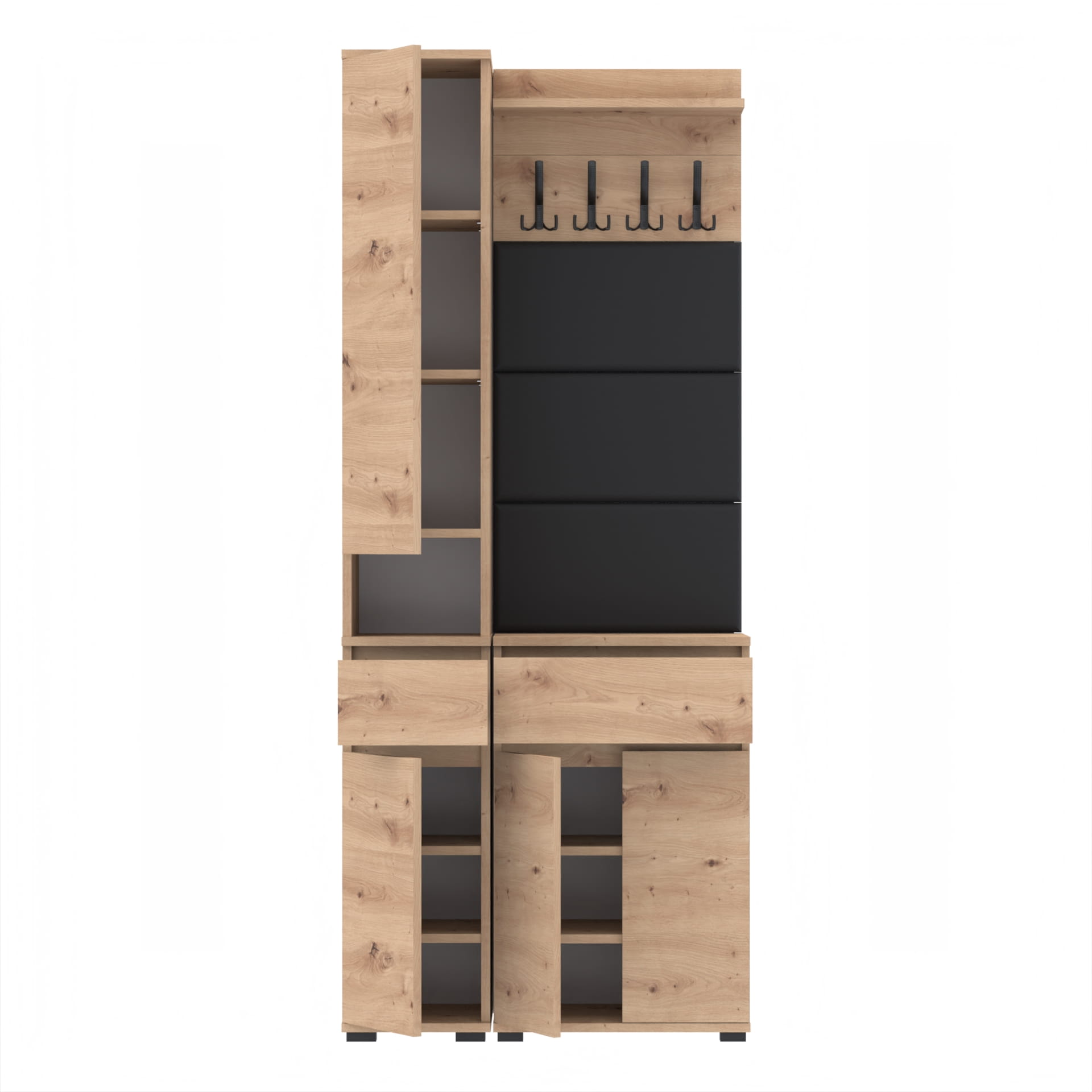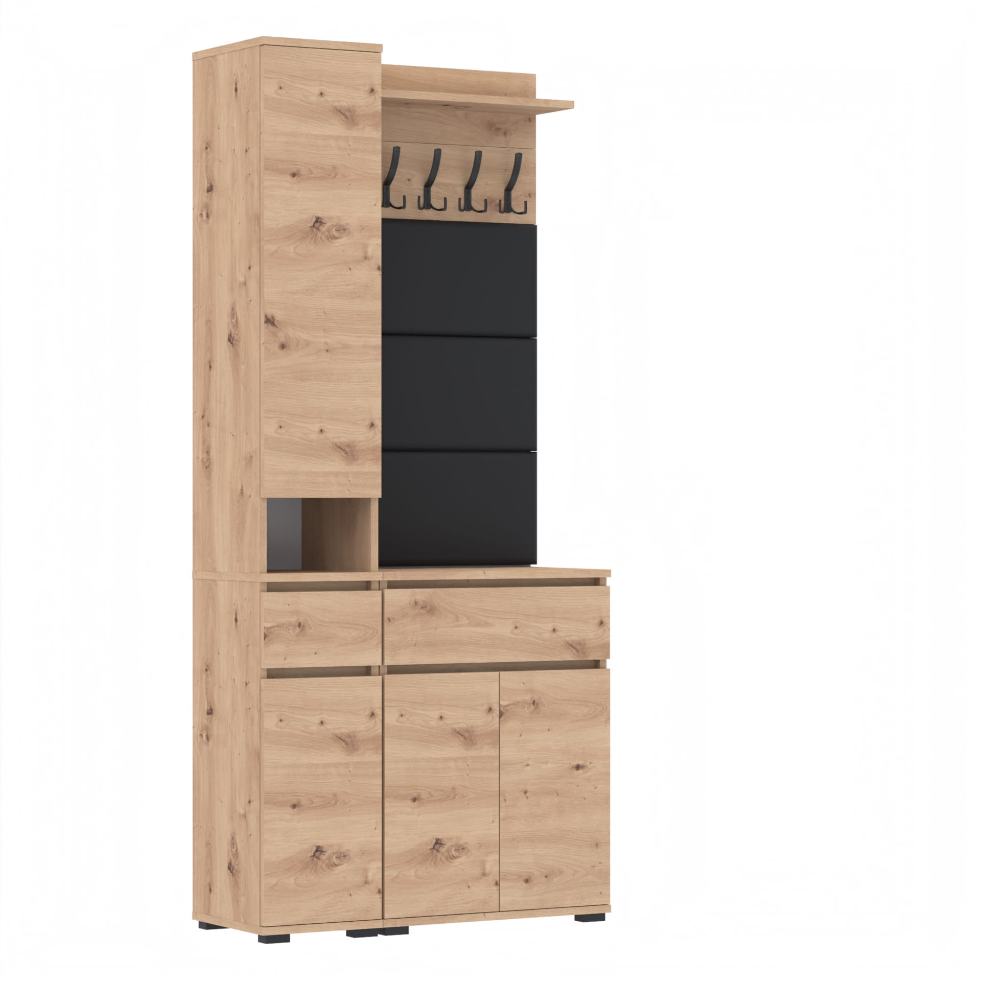 Zestaw składa się z: komody TRES z nadstawką SUPRA, komody TRES z szufladą i 3 półkami na buty, paneli ściennych oraz wieszaka.