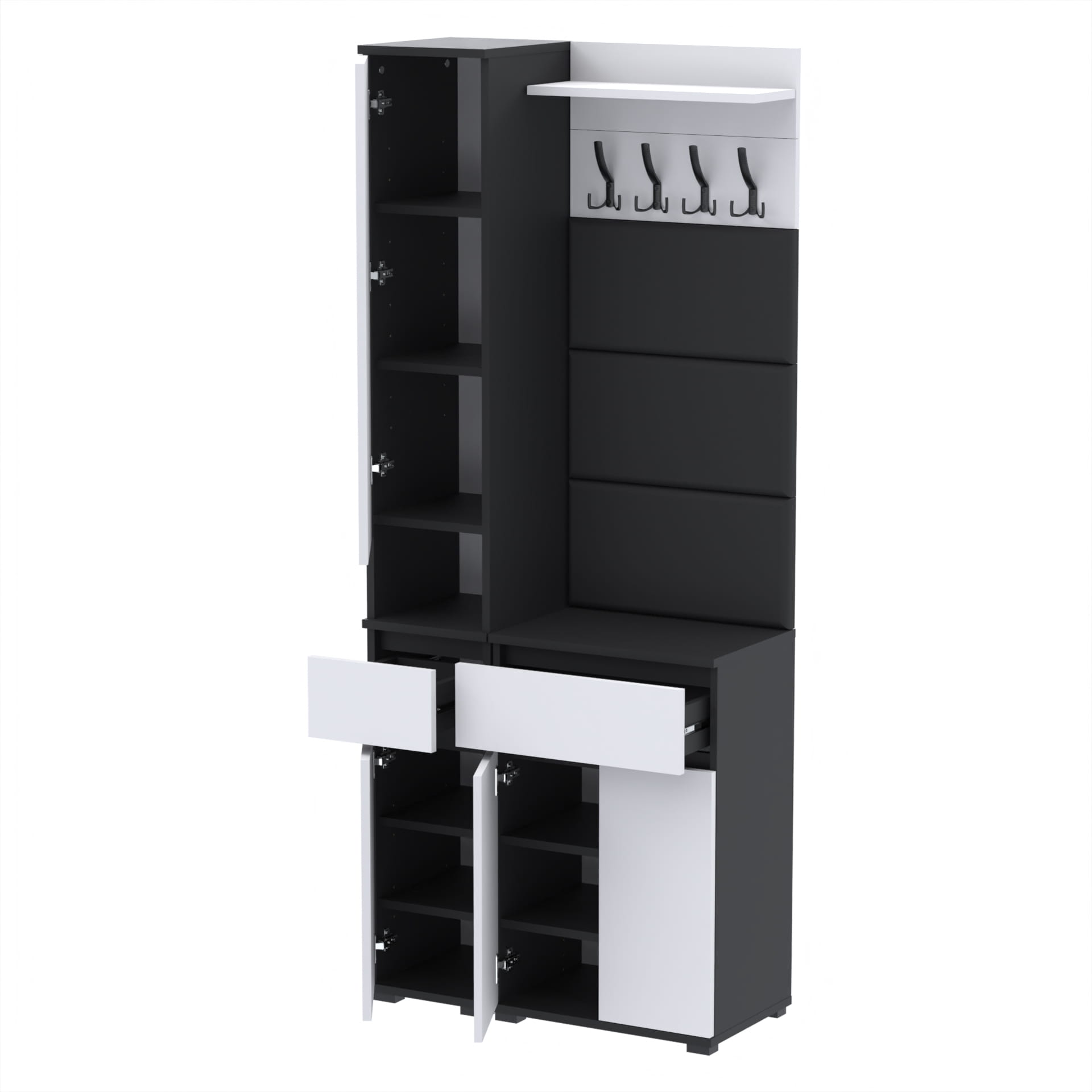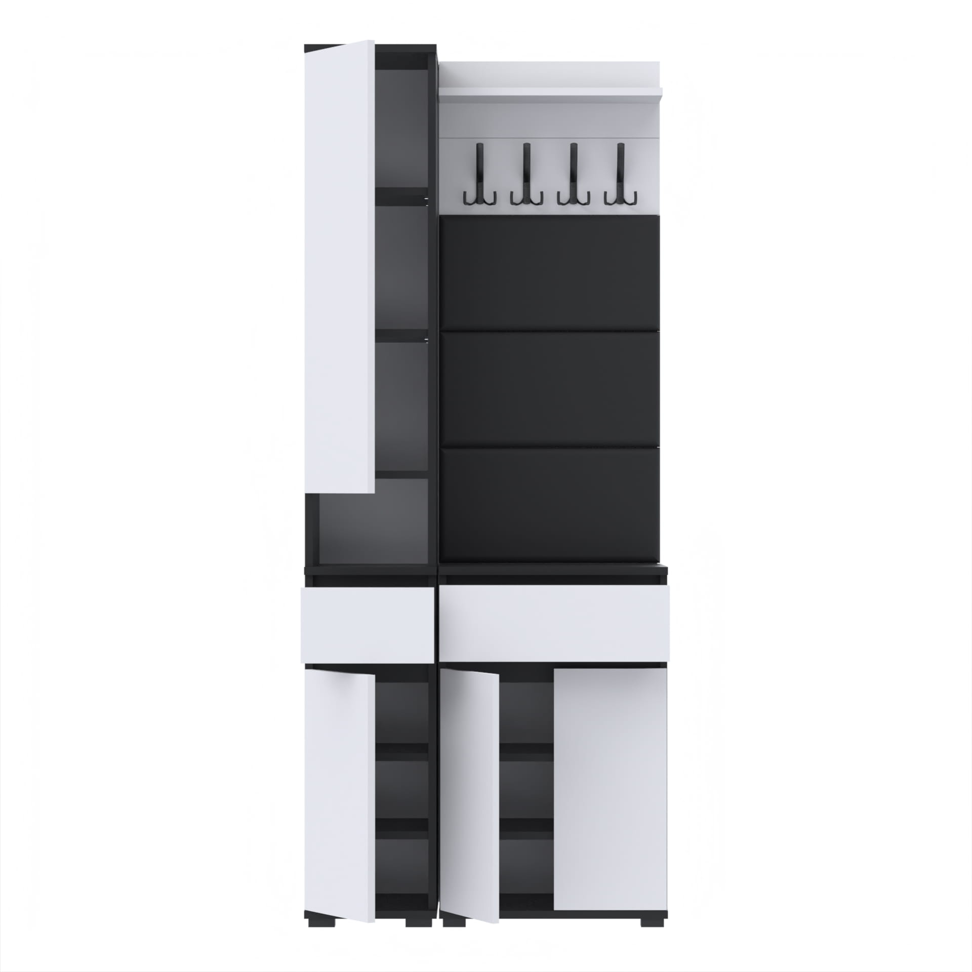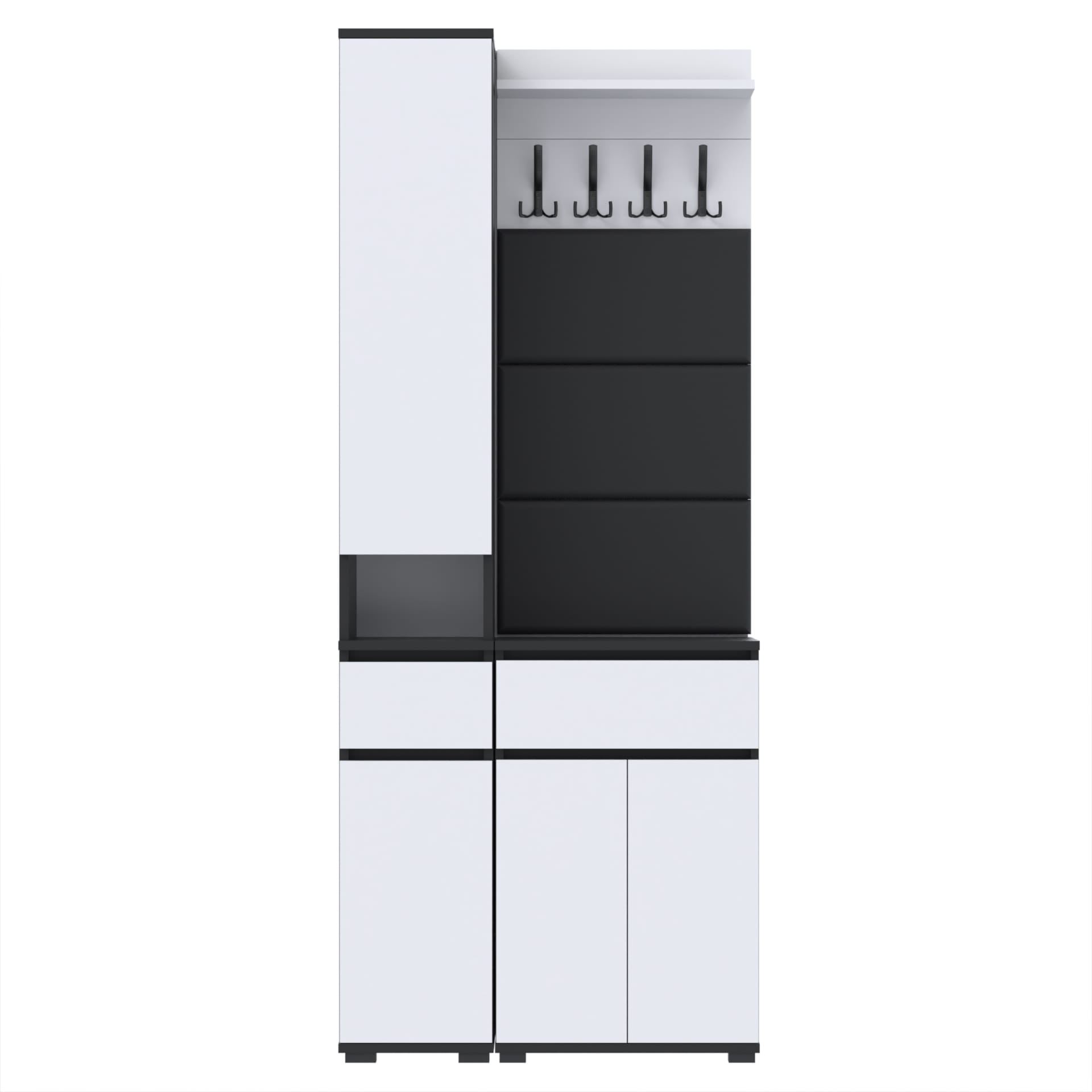 Zestaw składa się z różnorodnych elementów - komody TRES z nadstawką SUPRA, komody TRES z szufladą i 3 półkami na buty, paneli ściennych oraz wieszaka. Te elementy razem tworzą harmonijną całość, ale mogą być również ustawiane w dowolnej konfiguracji, zgodnie z indywidualnymi potrzebami i preferencjami.