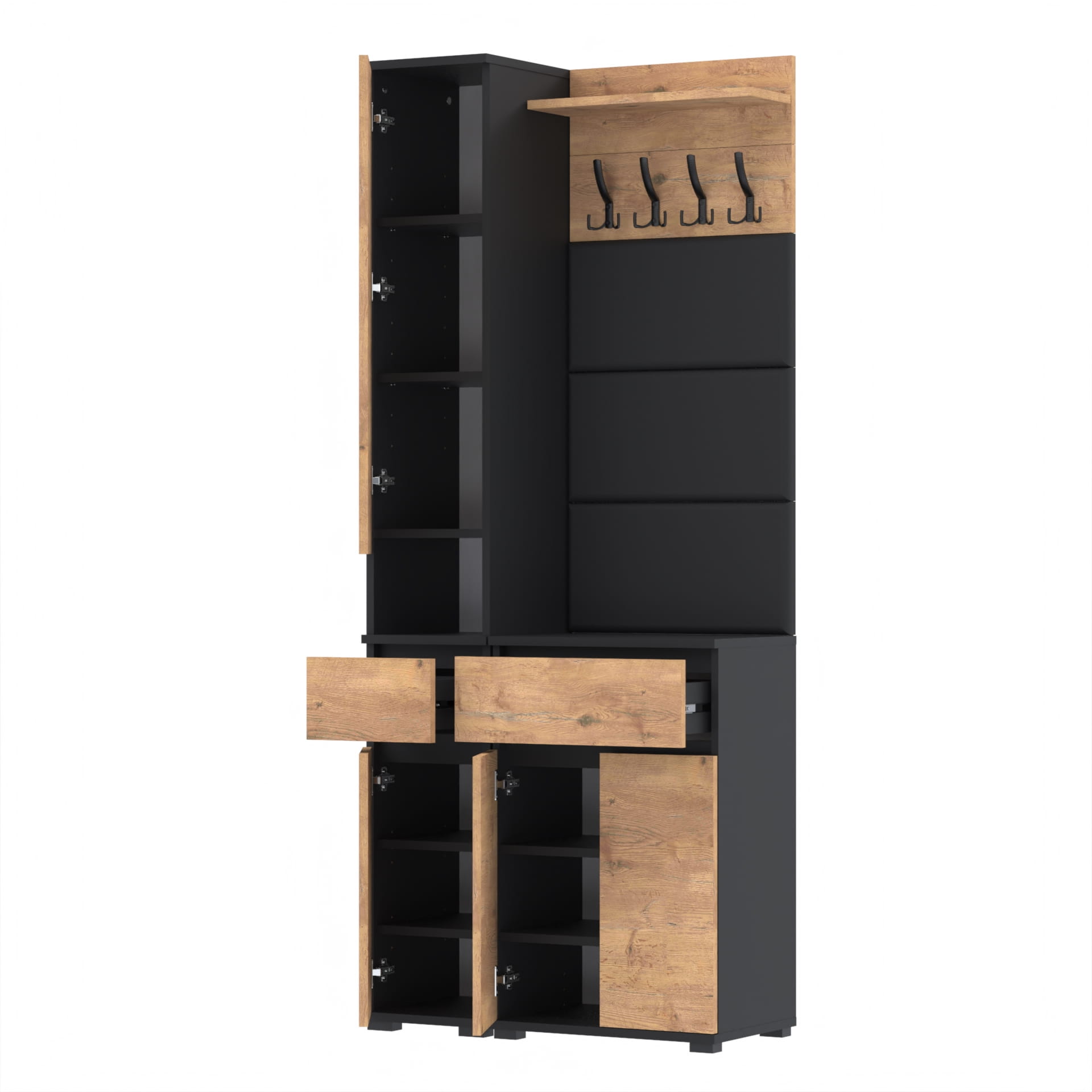 Ten unikalny zestaw mebli doskonale sprawdzi się w każdym przedpokoju. Wyprodukowany z najwyższą starannością w Polsce, łączy w sobie funkcjonalność, jakość i elegancki design.