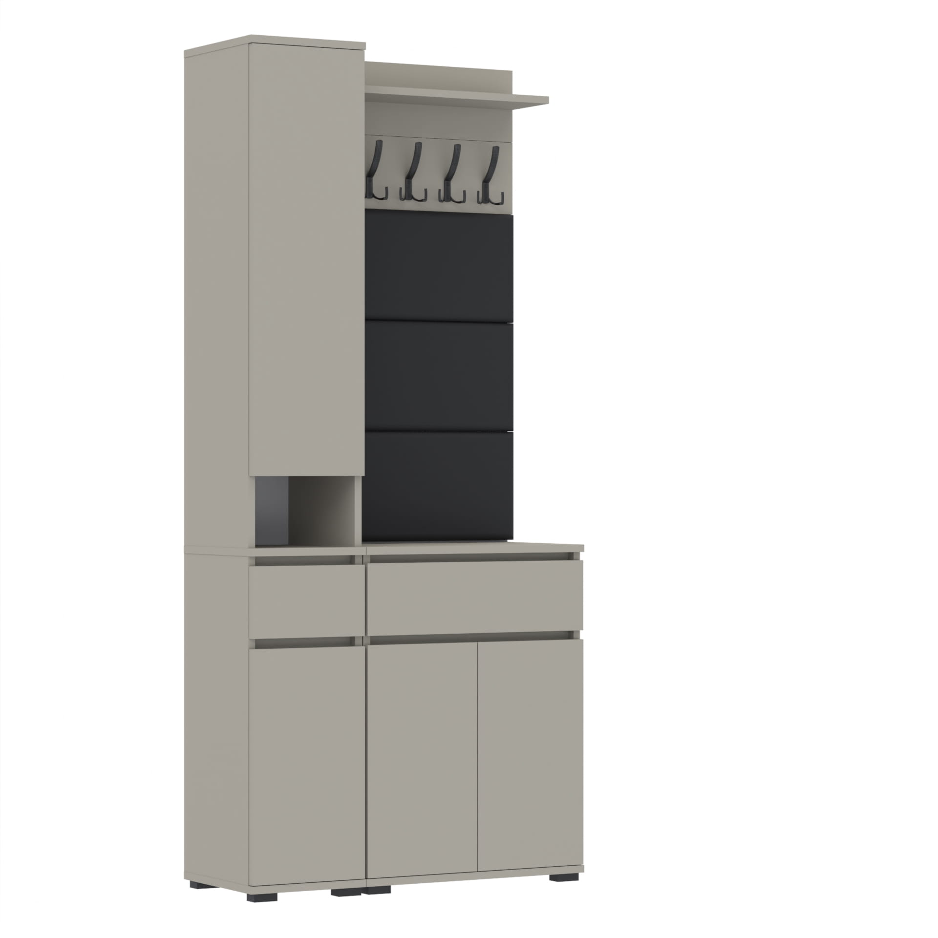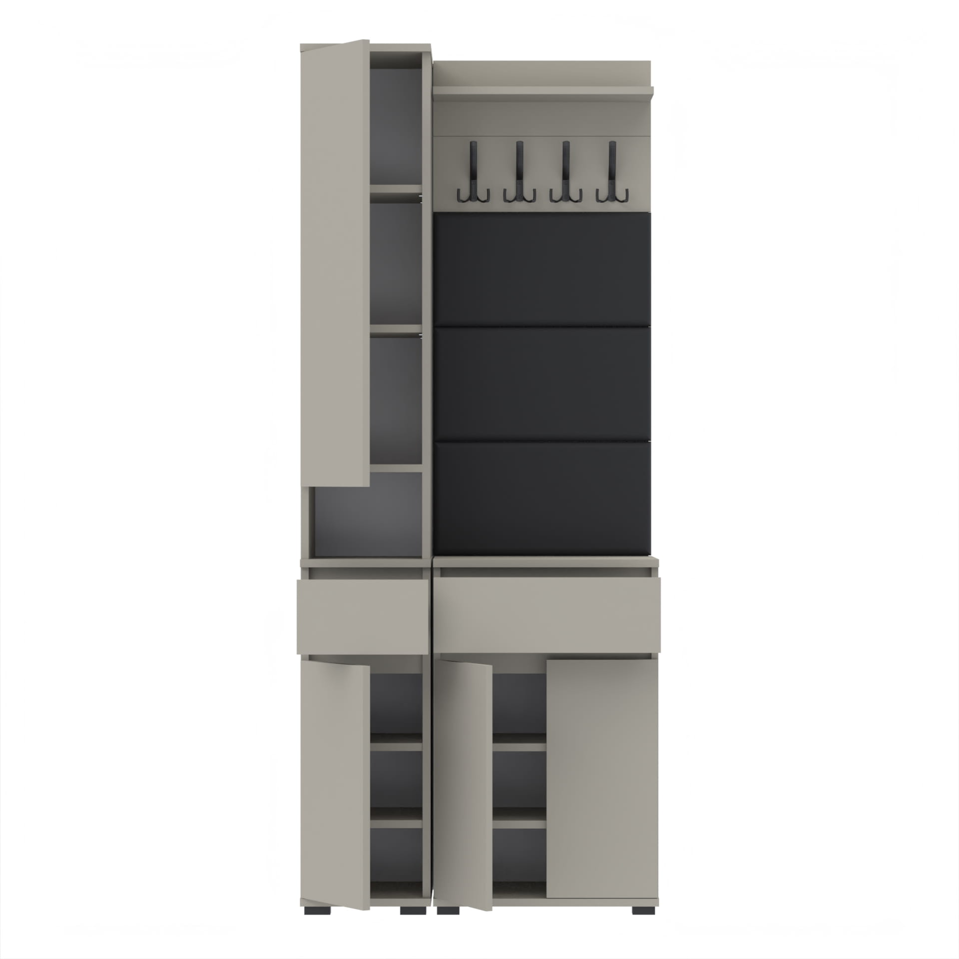 Zestaw składa się z różnorodnych elementów - komody TRES z nadstawką SUPRA, komody TRES z szufladą i 3 półkami na buty, paneli ściennych oraz wieszaka. Te elementy razem tworzą harmonijną całość, ale mogą być również ustawiane w dowolnej konfiguracji, zgodnie z indywidualnymi potrzebami i preferencjami.