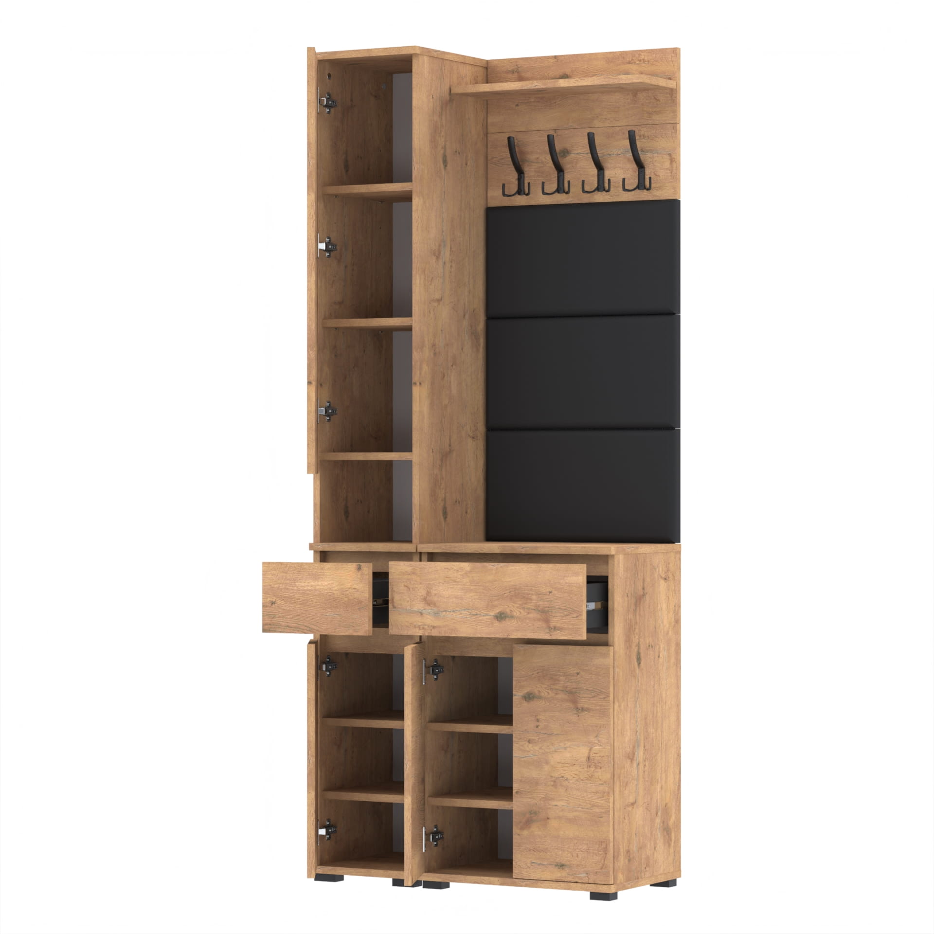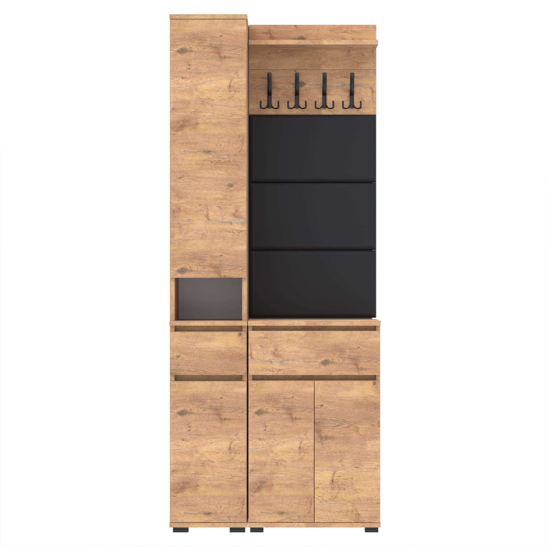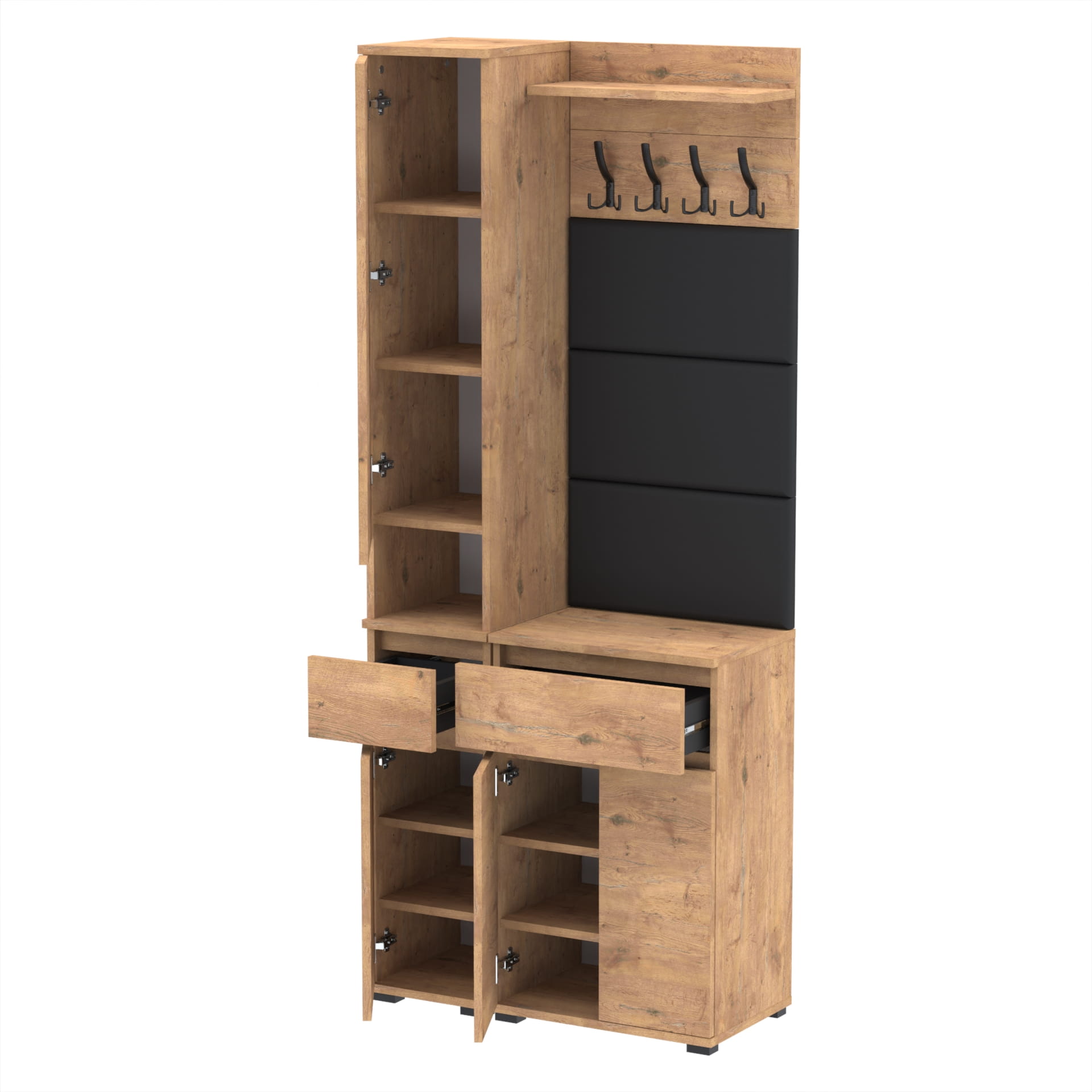 Zestaw składa się z różnorodnych elementów - komody TRES z nadstawką SUPRA, komody TRES z szufladą i 3 półkami na buty, paneli ściennych oraz wieszaka. Te elementy razem tworzą harmonijną całość, ale mogą być również ustawiane w dowolnej konfiguracji, zgodnie z indywidualnymi potrzebami i preferencjami.
