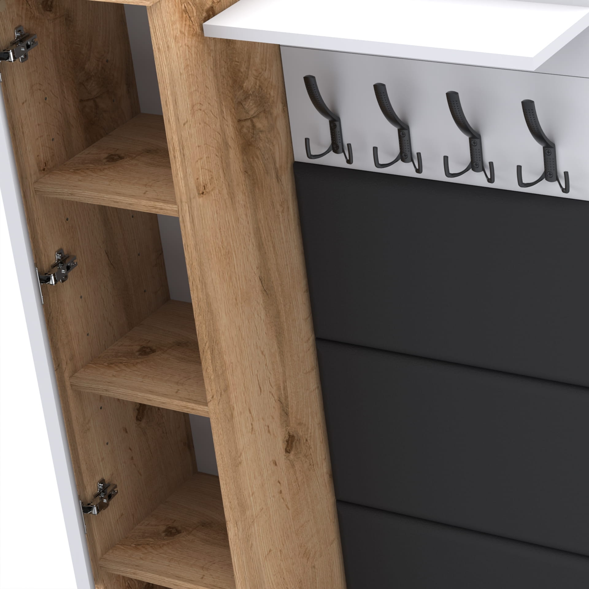 Materiał: Płyta meblowa 18mm, obrzeże ABS, okucia metalowe, nóżki 2cm z plastiku, haki wieszaka metalowe.