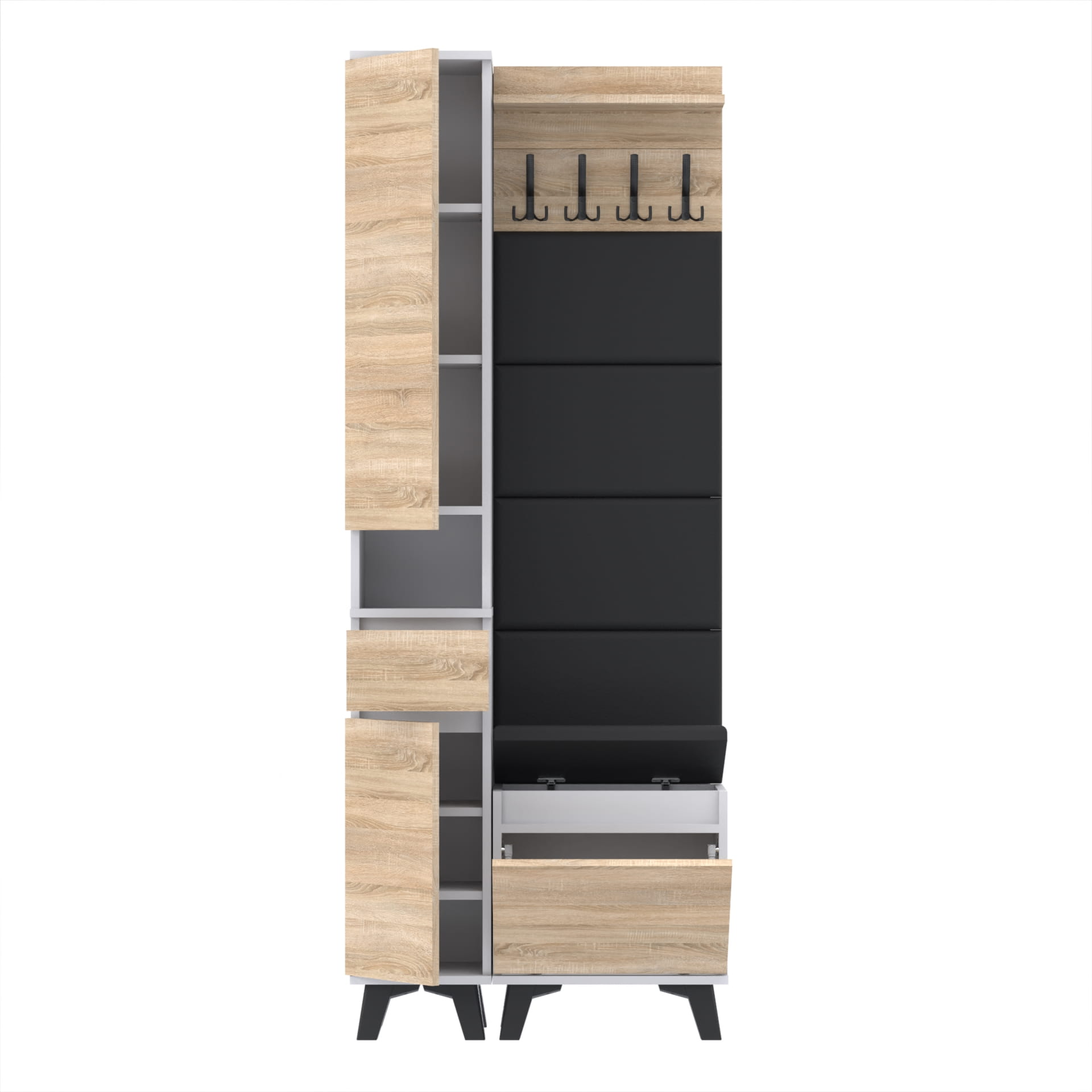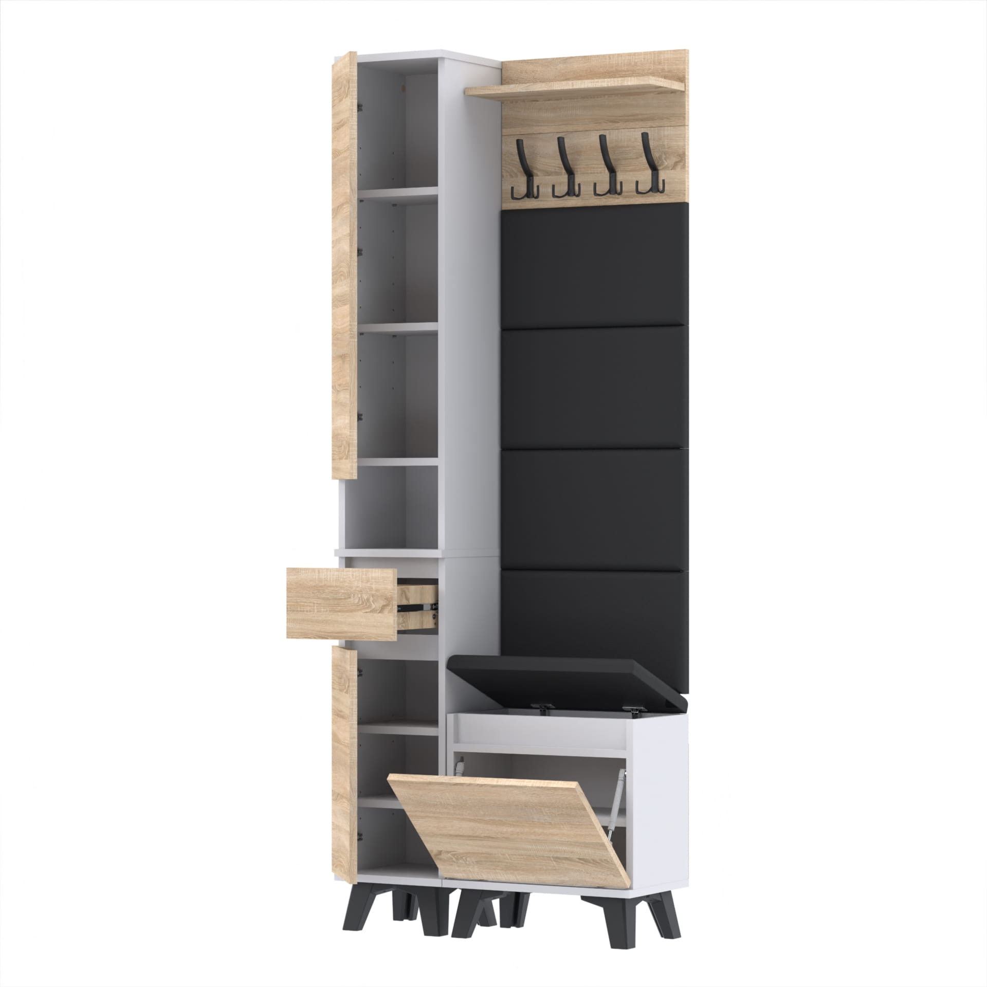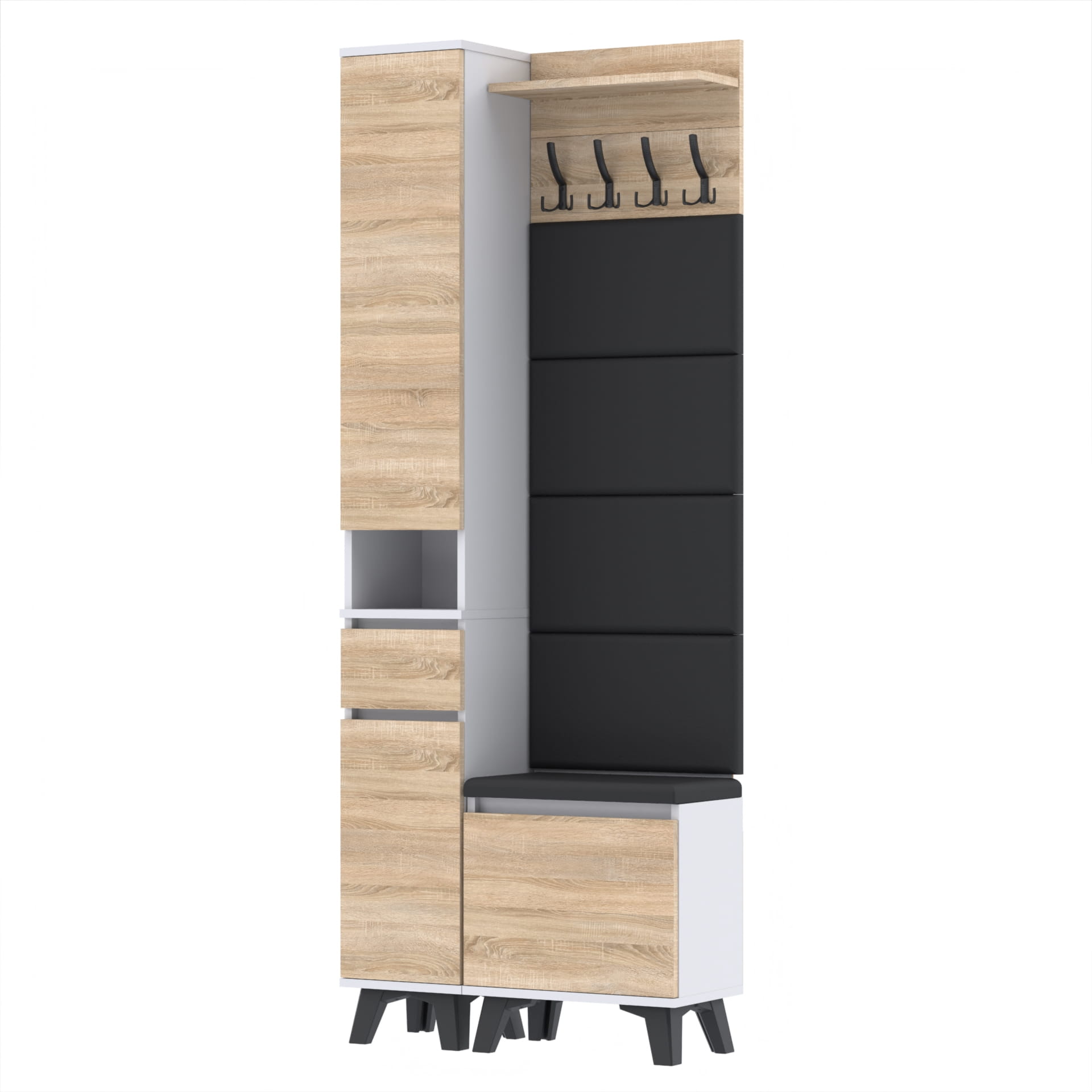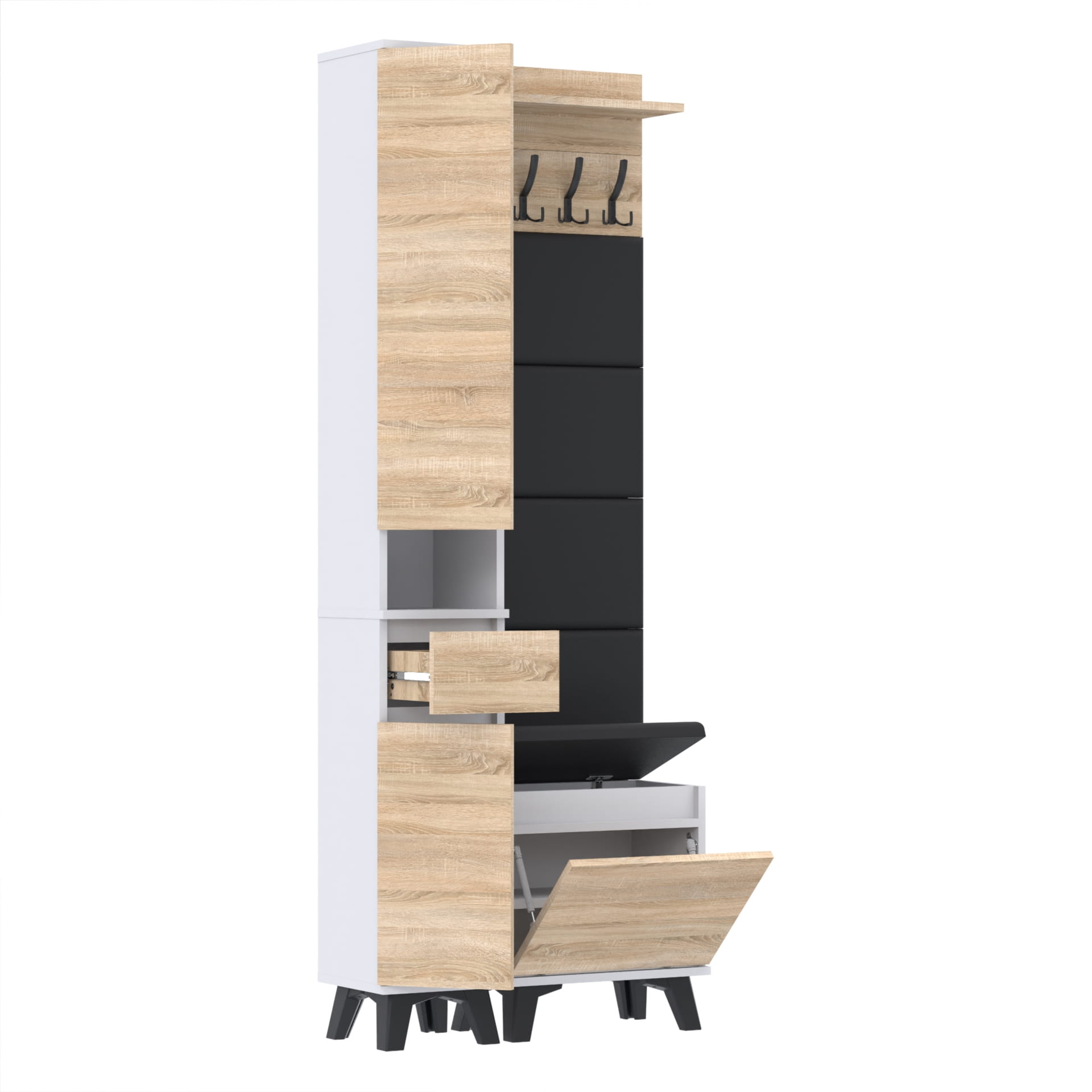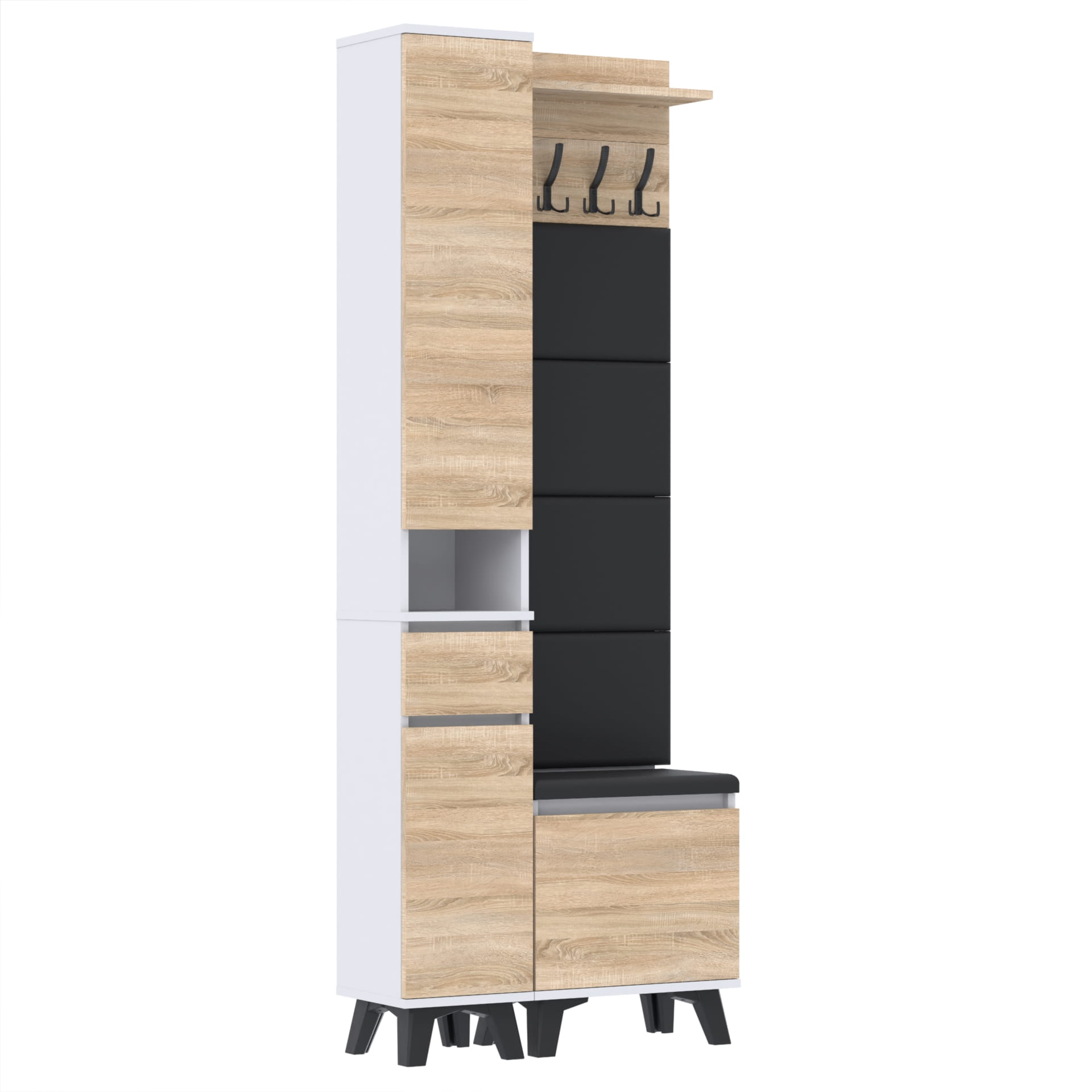 Materiał: Płyta meblowa 18mm, obrzeże ABS, okucia metalowe, nóżki 12cm z plastiku, haki wieszaka metalowe.