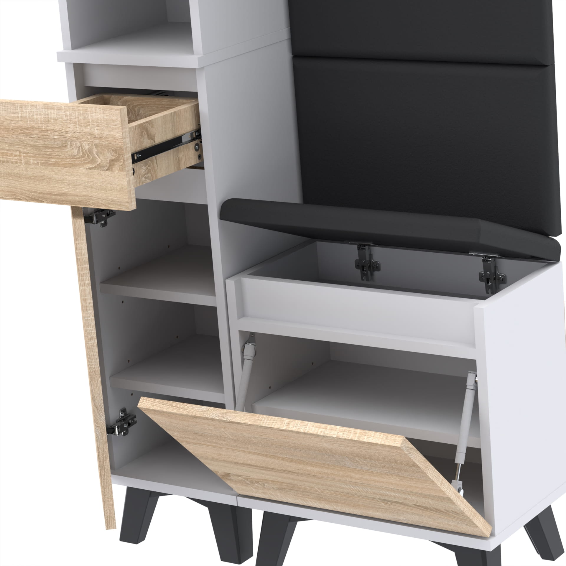 Materiał: Płyta meblowa 18mm, obrzeże ABS, okucia metalowe, nóżki 12cm z plastiku, haki wieszaka metalowe, siłowniki gazowe.