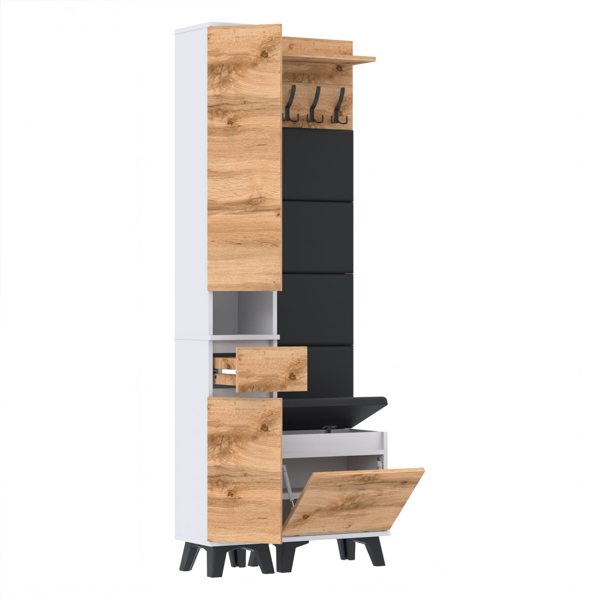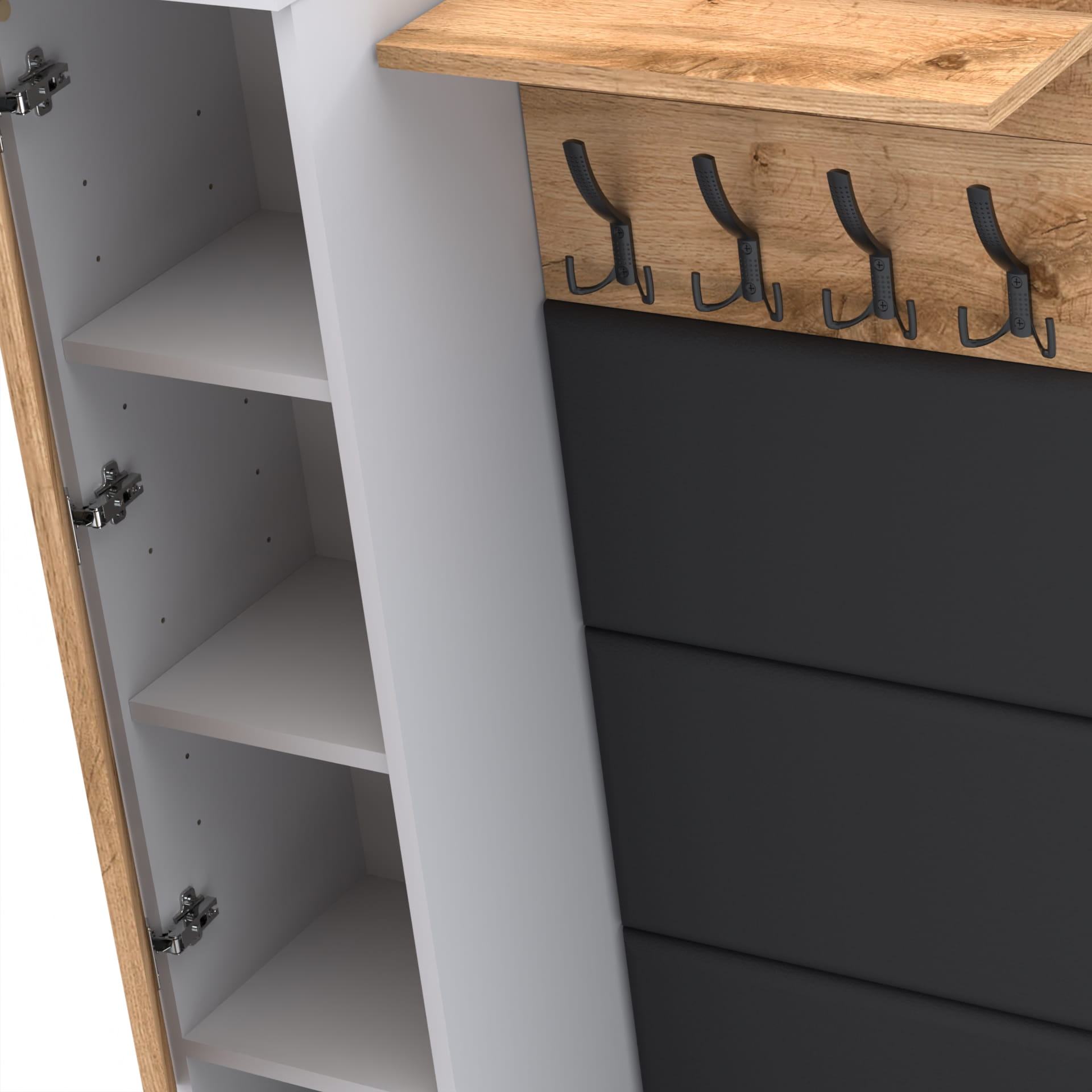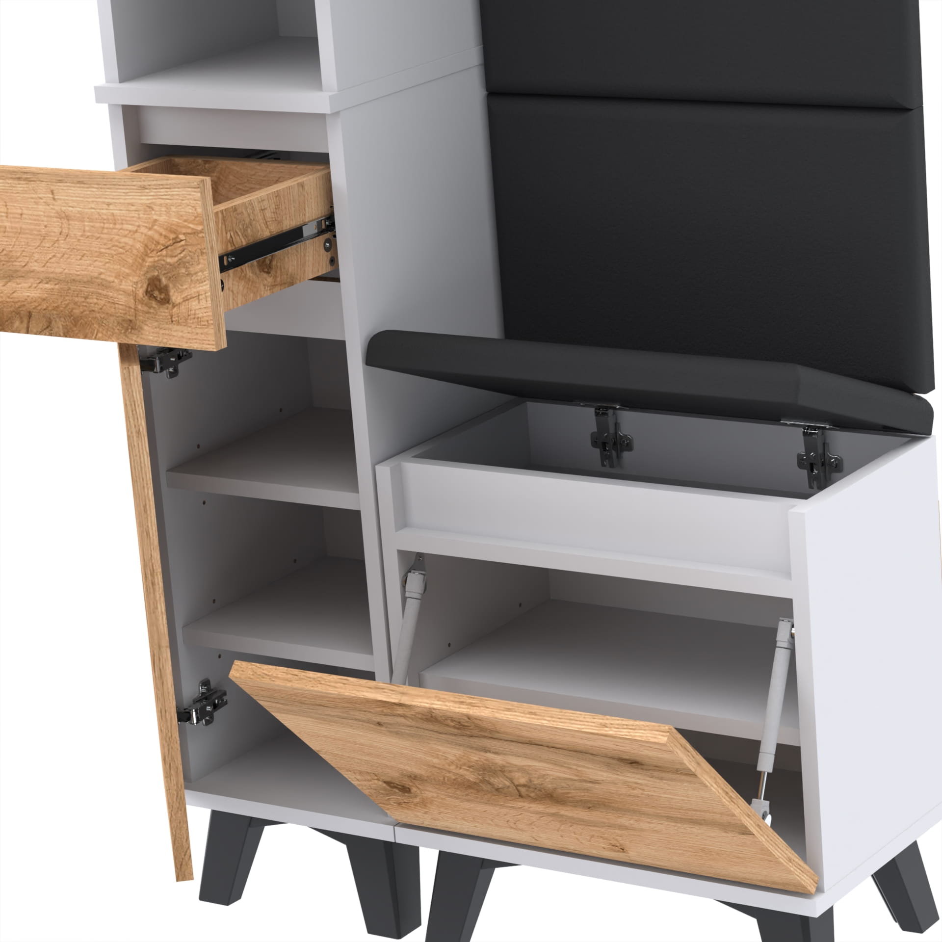 Szafka na buty jest nie tylko wygodna, ale także praktyczna - wewnątrz znajduje się półka, która pozwala na przechowywanie większej ilości obuwia. Dodatkowo, szafka jest wyposażona w schowek na przybory, dzięki czemu wszystko, czego potrzebujesz, jest zawsze pod ręką.