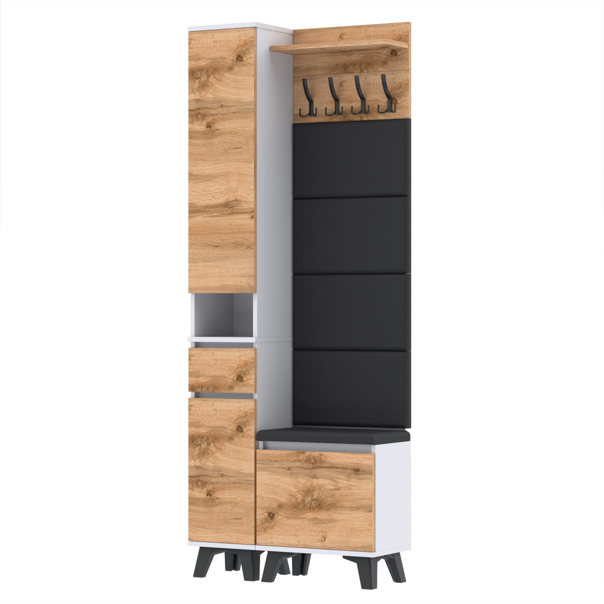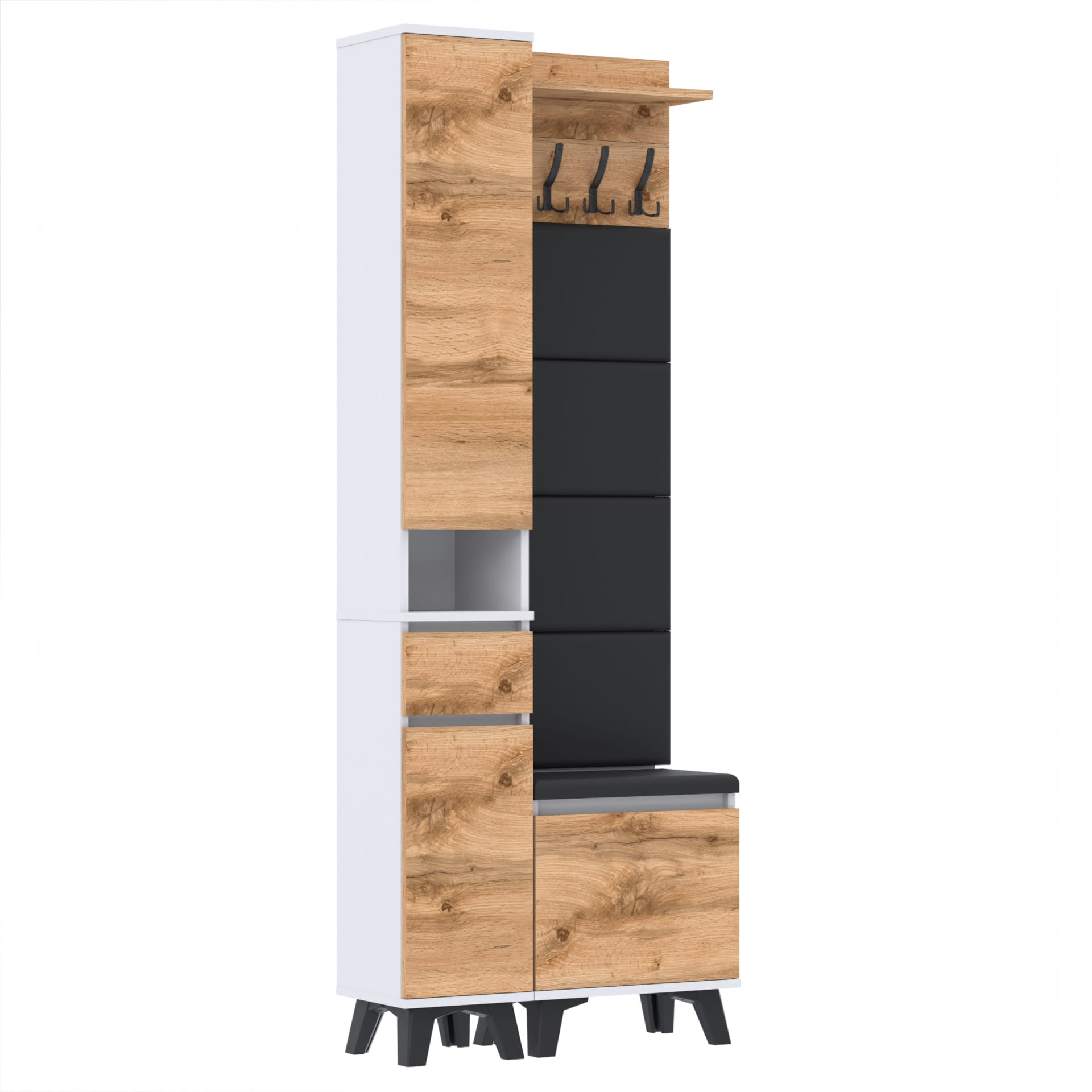 Materiał: Płyta meblowa 18mm, obrzeże ABS, okucia metalowe, nóżki 12cm z plastiku, haki wieszka metalowe.