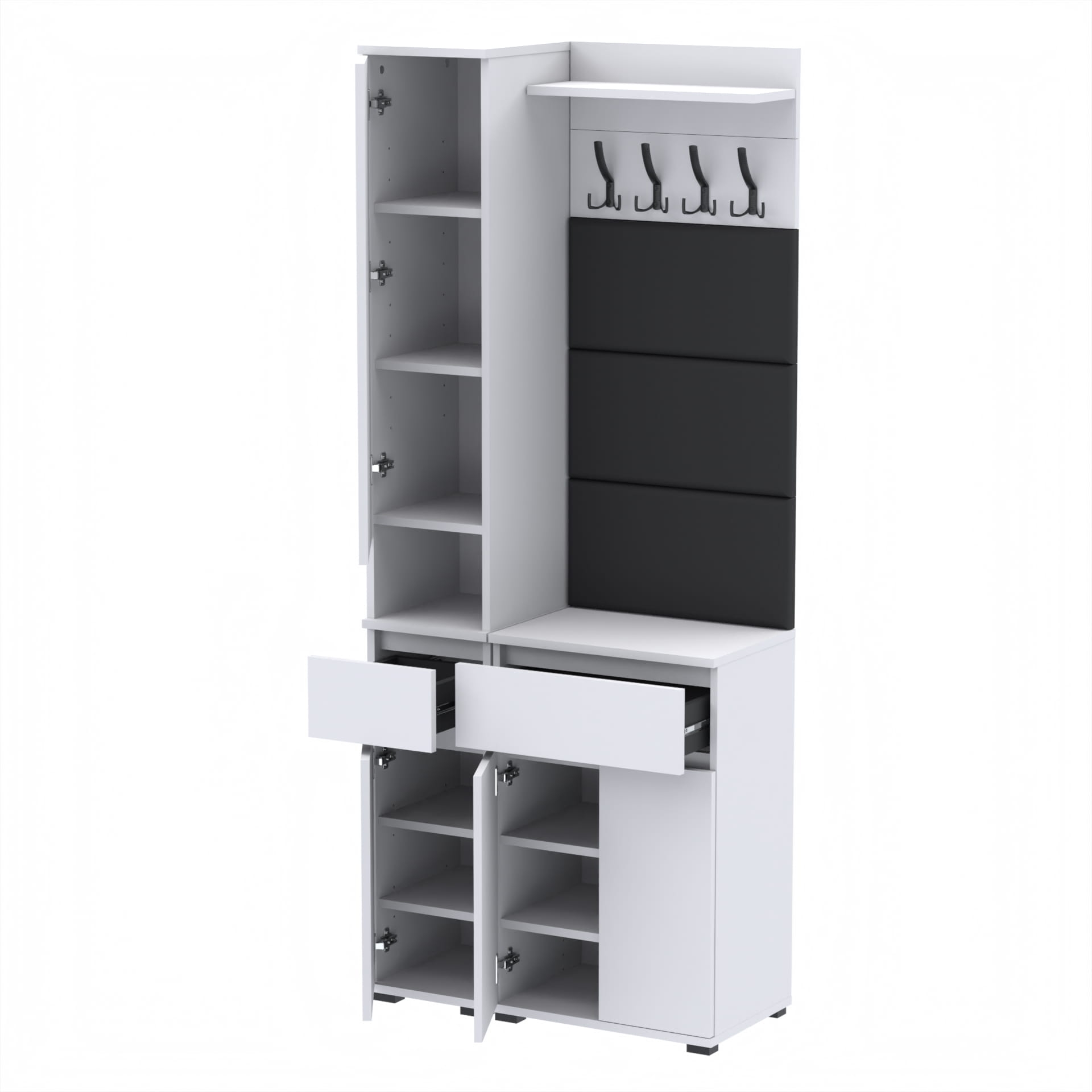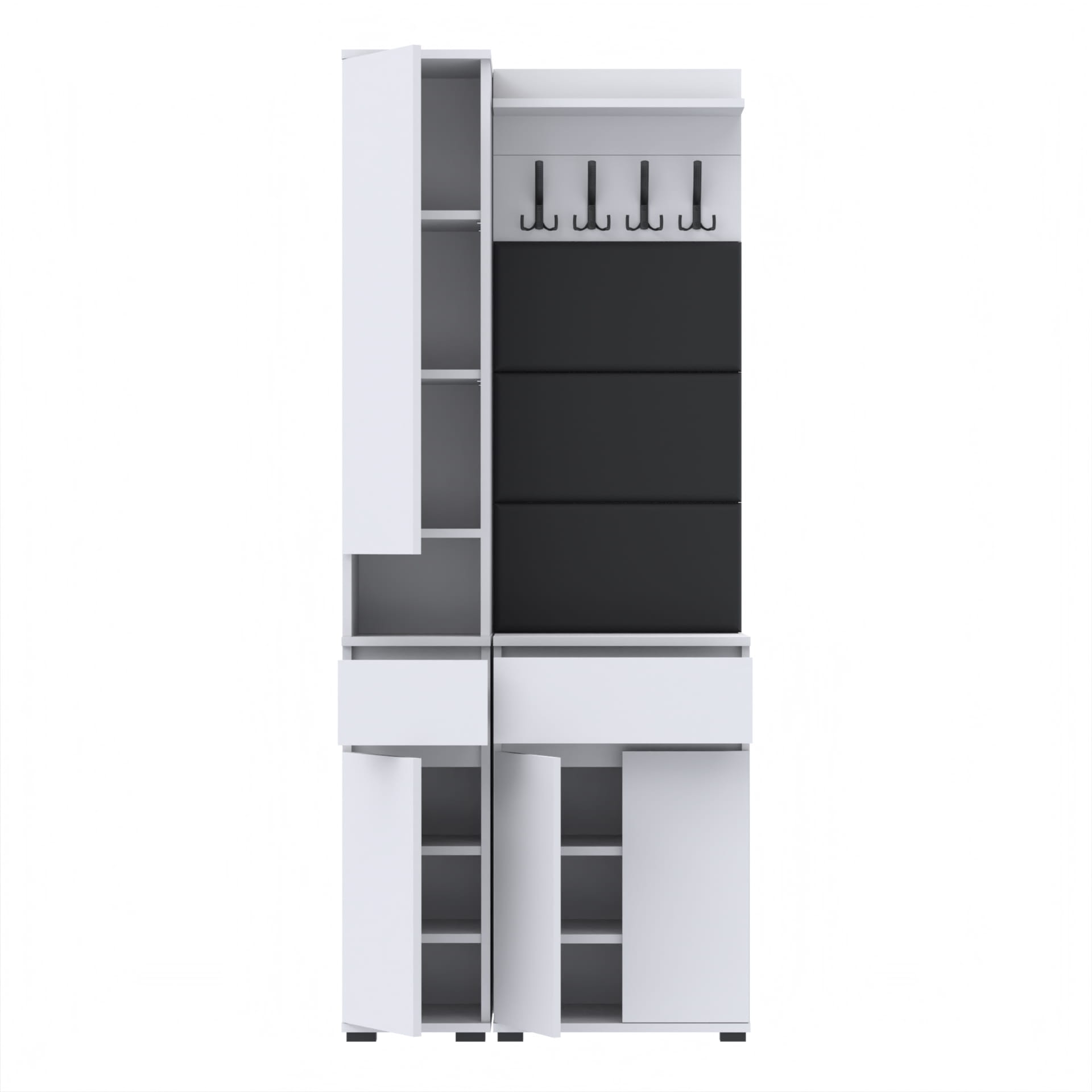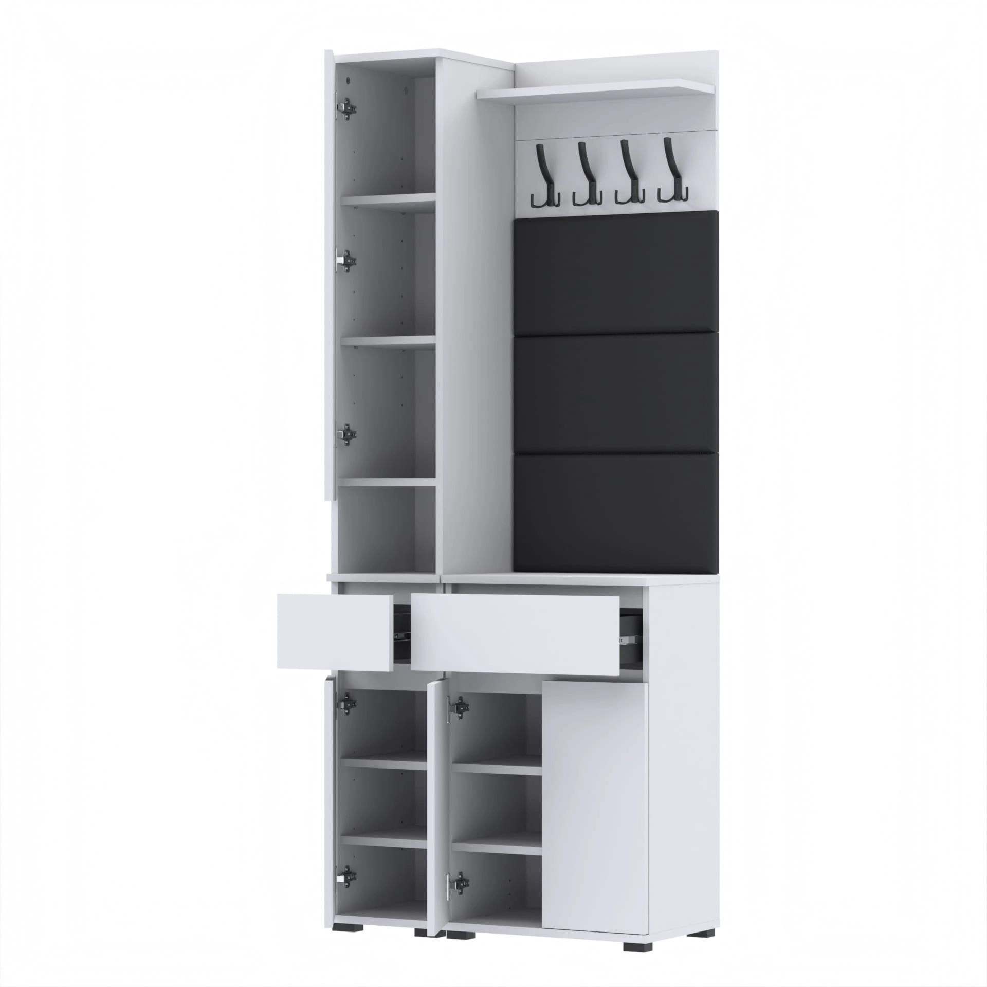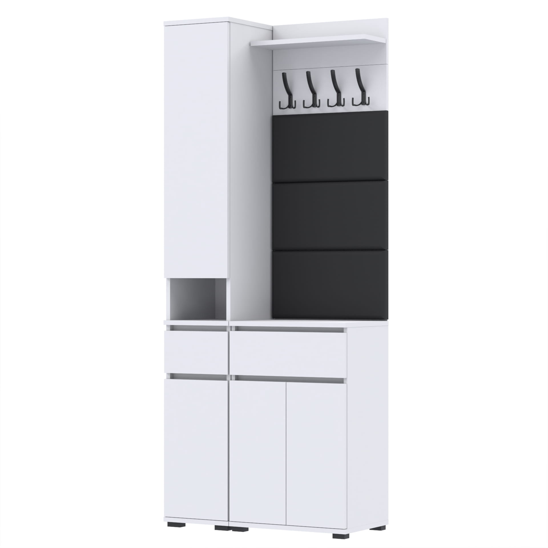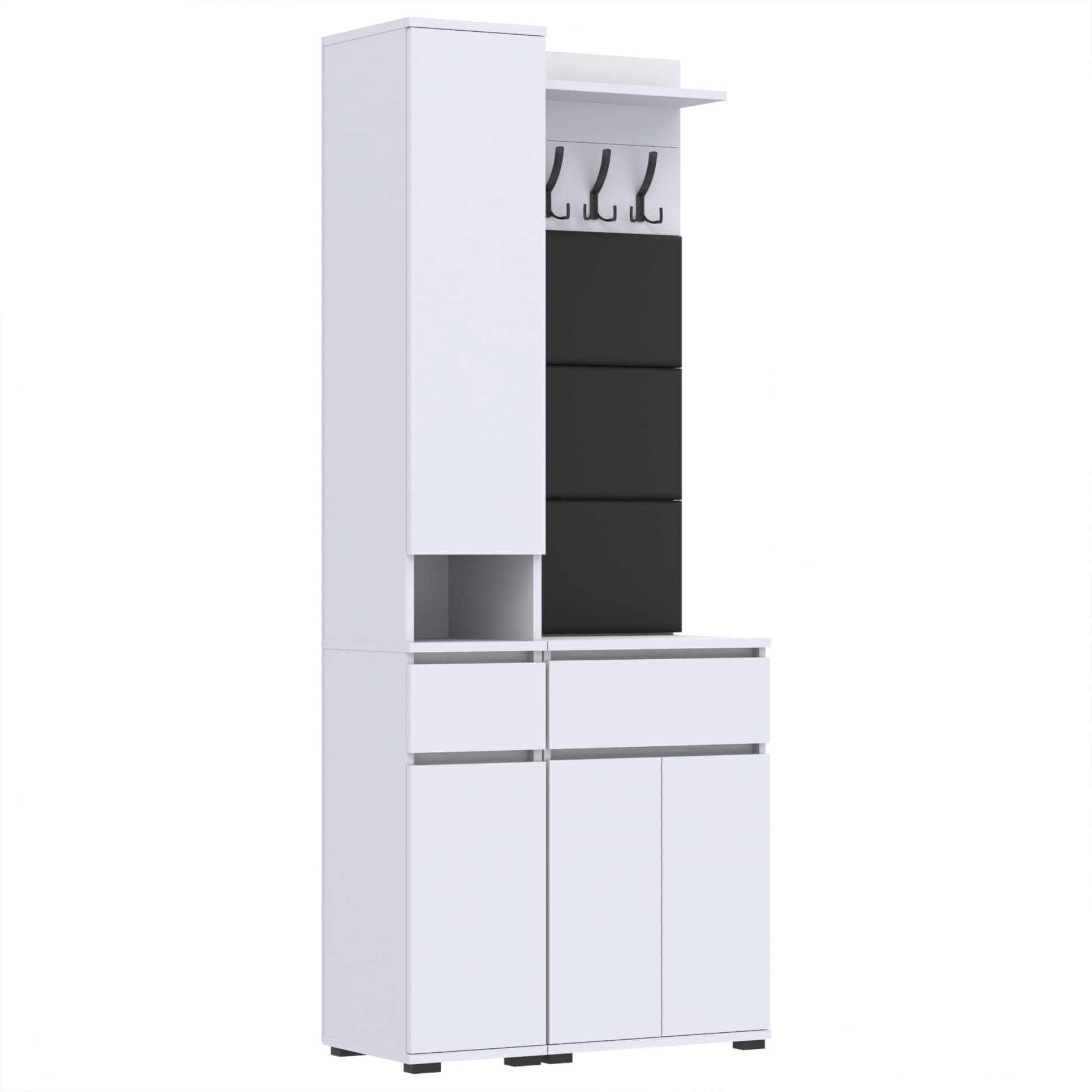 Zestaw składa się z różnorodnych elementów - komody TRES z nadstawką SUPRA, komody TRES z szufladą i 3 półkami na buty, paneli ściennych oraz wieszaka. Te elementy razem tworzą harmonijną całość, ale mogą być również ustawiane w dowolnej konfiguracji, zgodnie z indywidualnymi potrzebami i preferencjami.