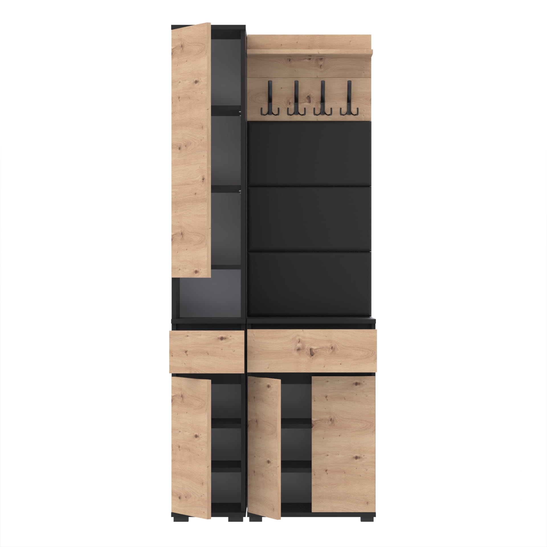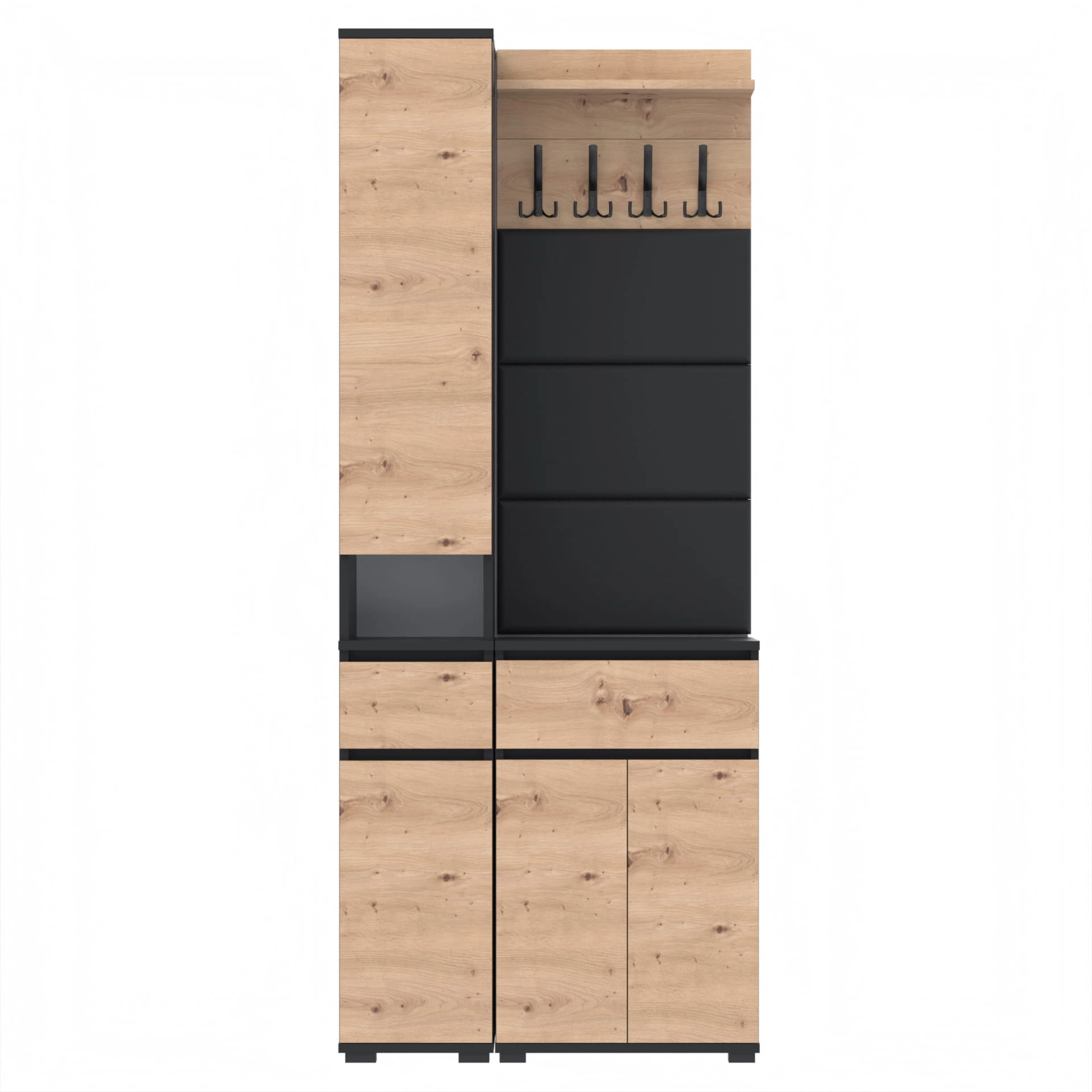 Zestaw składa się z różnorodnych elementów - komody TRES z nadstawką SUPRA, komody TRES z szufladą i 3 półkami na buty, paneli ściennych oraz wieszaka. Te elementy razem tworzą harmonijną całość, ale mogą być również ustawiane w dowolnej konfiguracji, zgodnie z indywidualnymi potrzebami i preferencjami.