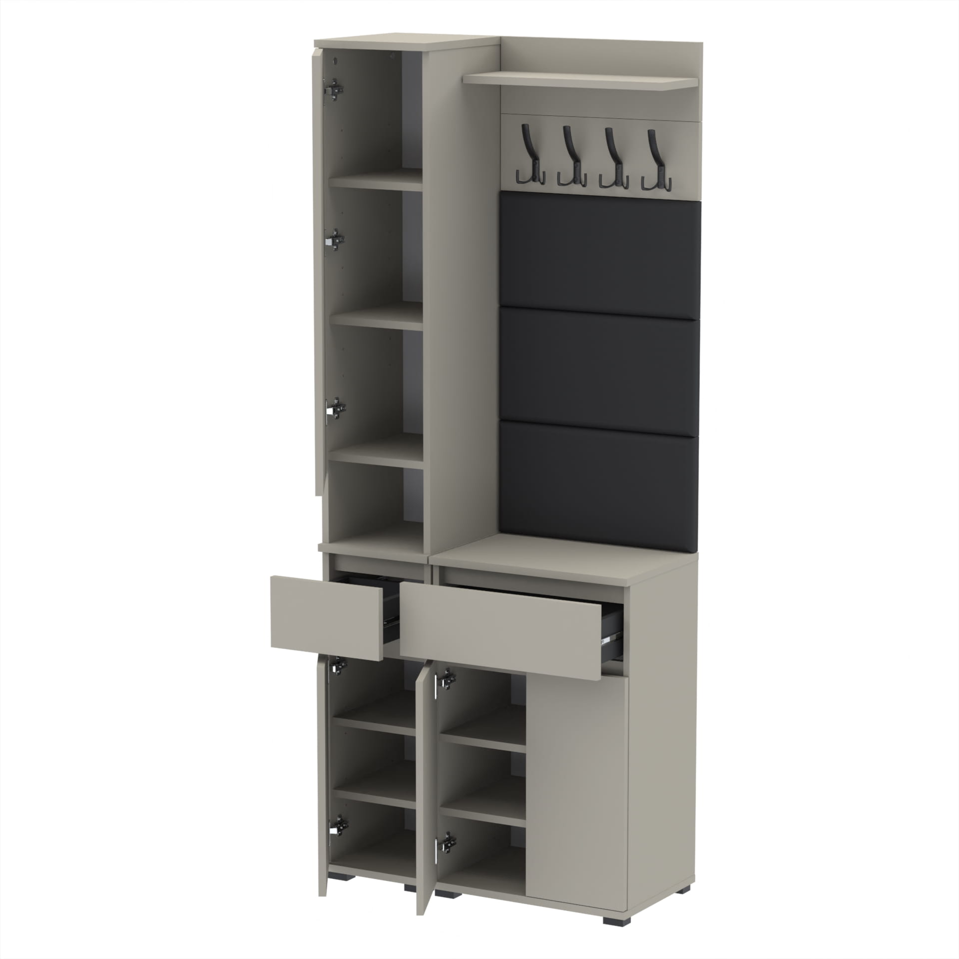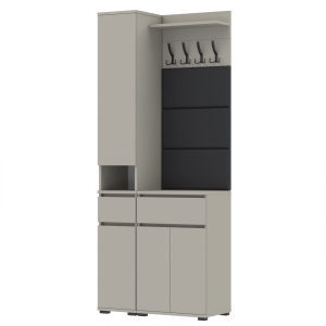 Zestaw składa się z różnorodnych elementów - komody TRES z nadstawką SUPRA, komody TRES z szufladą i 3 półkami na buty, paneli ściennych oraz wieszaka. Te elementy razem tworzą harmonijną całość, ale mogą być również ustawiane w dowolnej konfiguracji, zgodnie z indywidualnymi potrzebami i preferencjami.