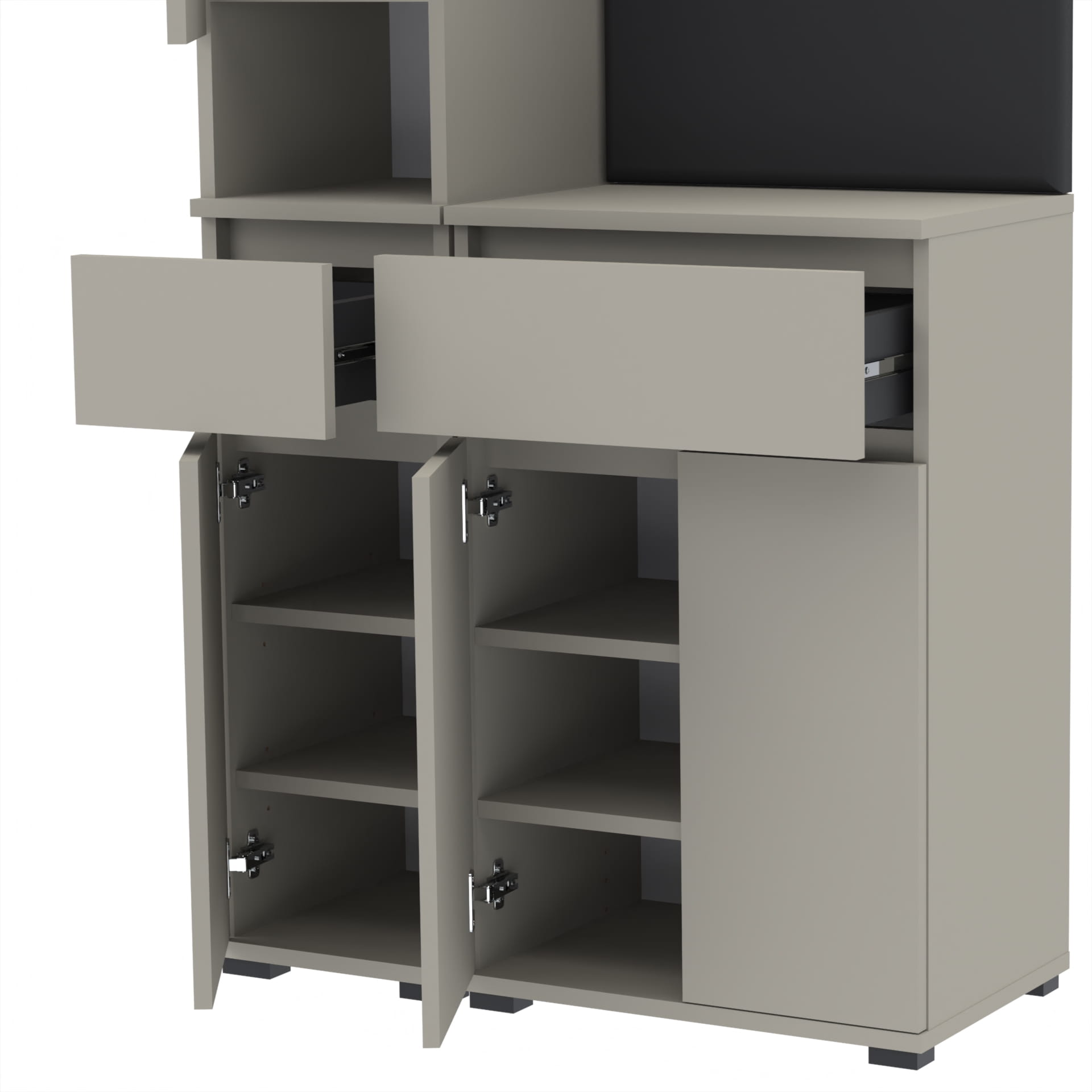 Szafa składa się z dwóch części. W dolnej części znajduje się szafka z 3 poziomami oraz szuflada TRES. Górna część - nadstawka posiada szafkę z czterema poziomami oraz otwartą półkę. Górna część nakłada się na dolną, tak by stanowiły całość.