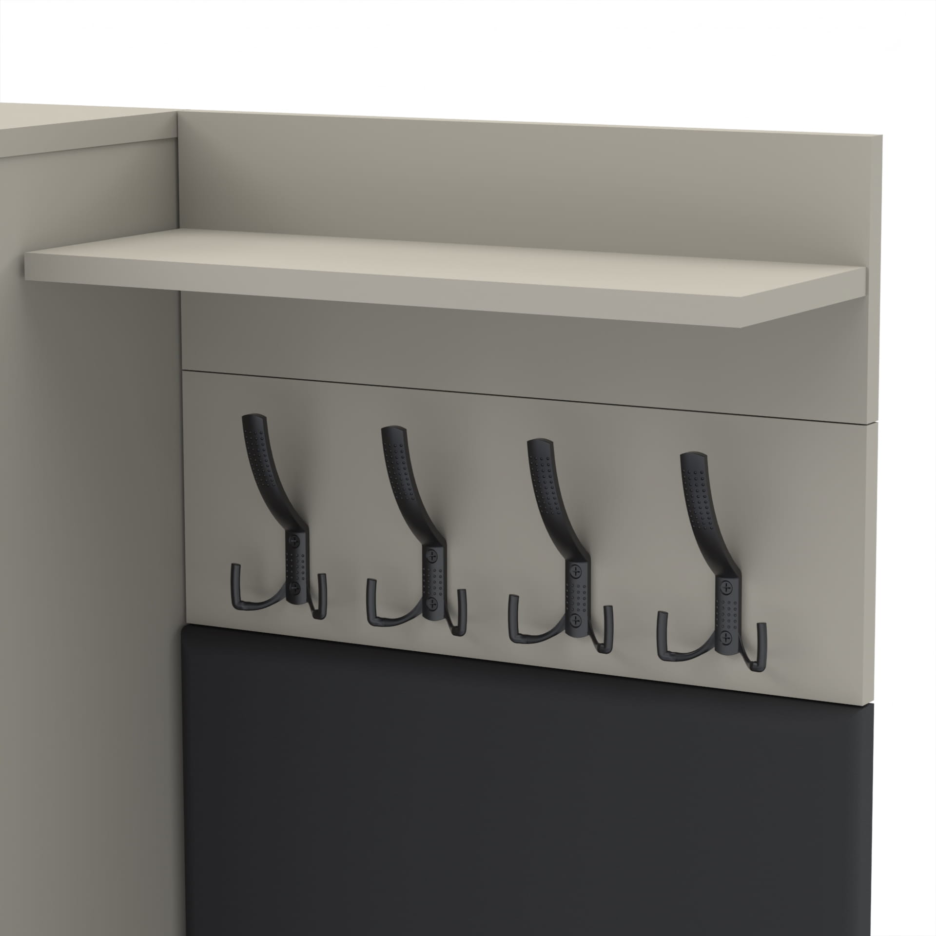 Wieszak z praktyczną półką o głębokości 18 cm. Posiada 4 metalowe uchwyty udostępnia w sumie 12 wieszaków.