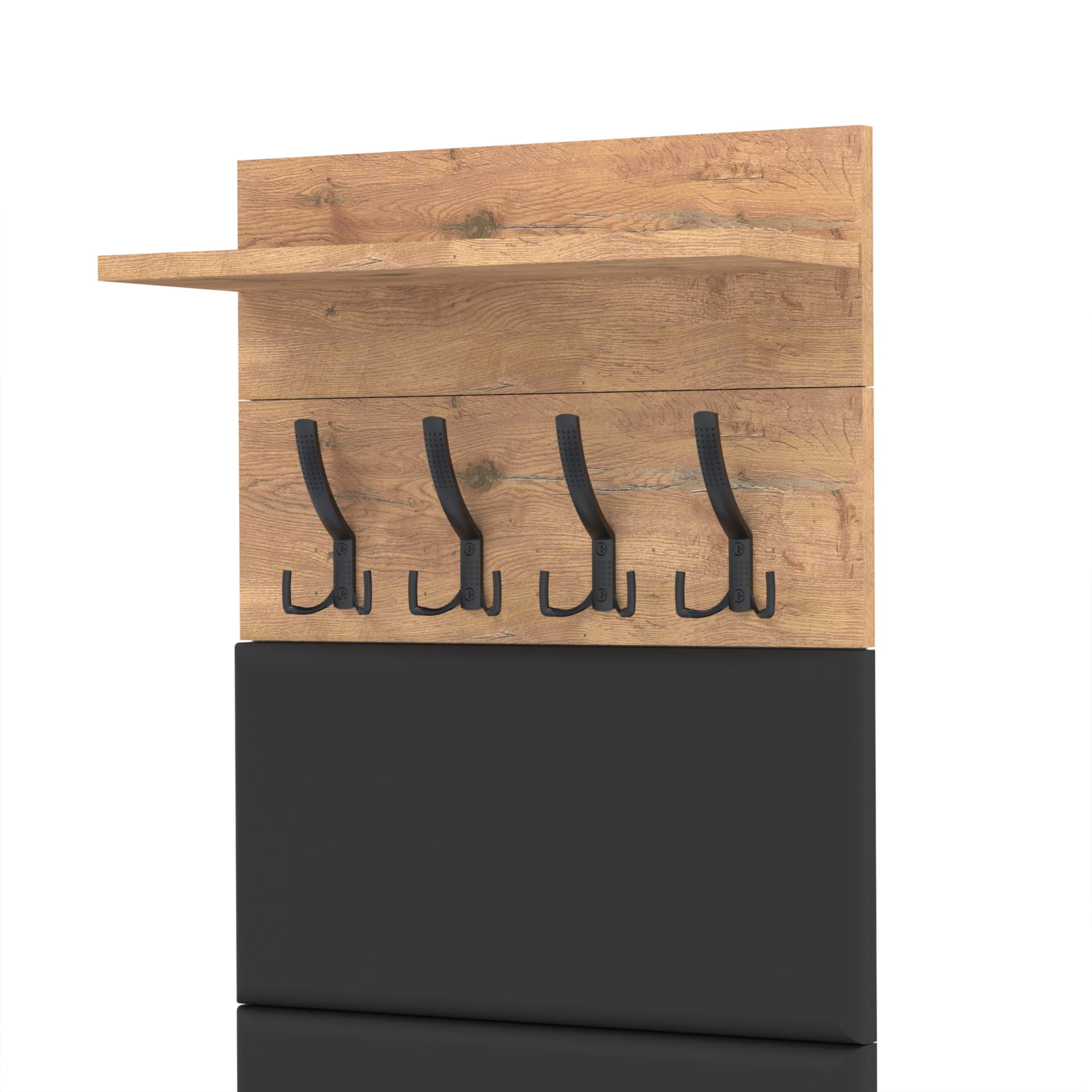 Wieszak z praktyczną półką o głębokości 18 cm. Posiada 4 metalowe uchwyty udostępnia w sumie 12 wieszaków.