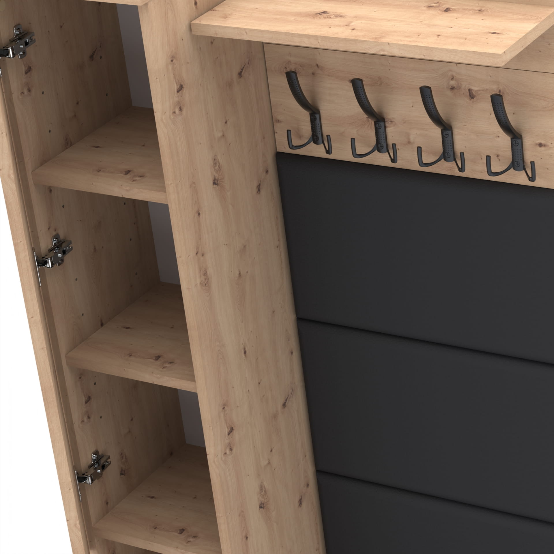 Na górze struktury znajduje się praktyczna półka o głębokości 18 cm, która jest idealna do przechowywania różnych przedmiotów. Półka nie tylko zapewnia dodatkową przestrzeń do przechowywania, ale także stanowi integralną część designu wieszaka, nadając mu ciekawy, nowoczesny wygląd.