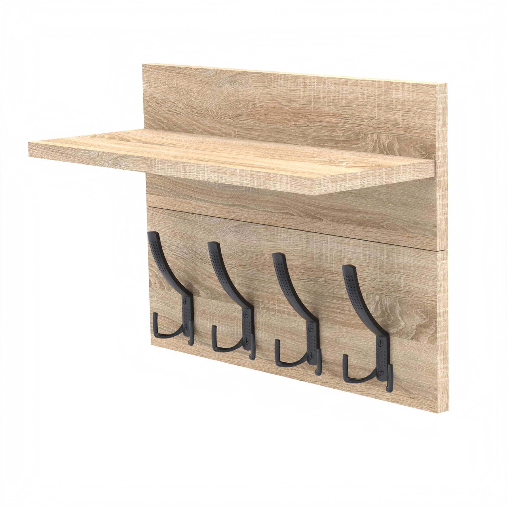 Na górze struktury znajduje się praktyczna półka o głębokości 18 cm, która jest idealna do przechowywania różnych przedmiotów. Półka nie tylko zapewnia dodatkową przestrzeń do przechowywania, ale także stanowi integralną część designu wieszaka, nadając mu ciekawy, nowoczesny wygląd.