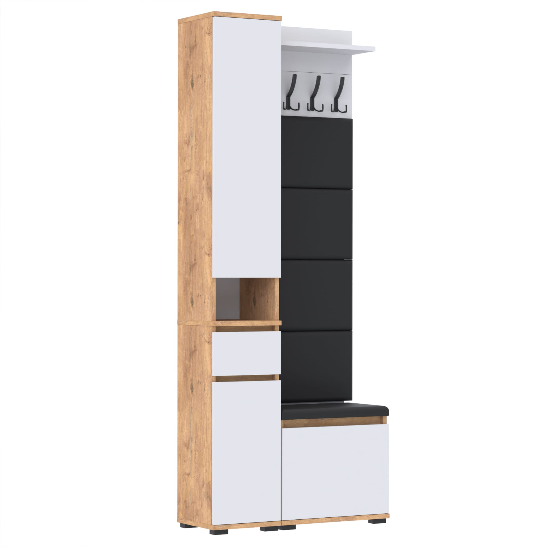 Materiał: Płyta meblowa 18mm, obrzeże ABS, okucia metalowe, nóżki 2cm z plastiku, haki wieszaka metalowe.