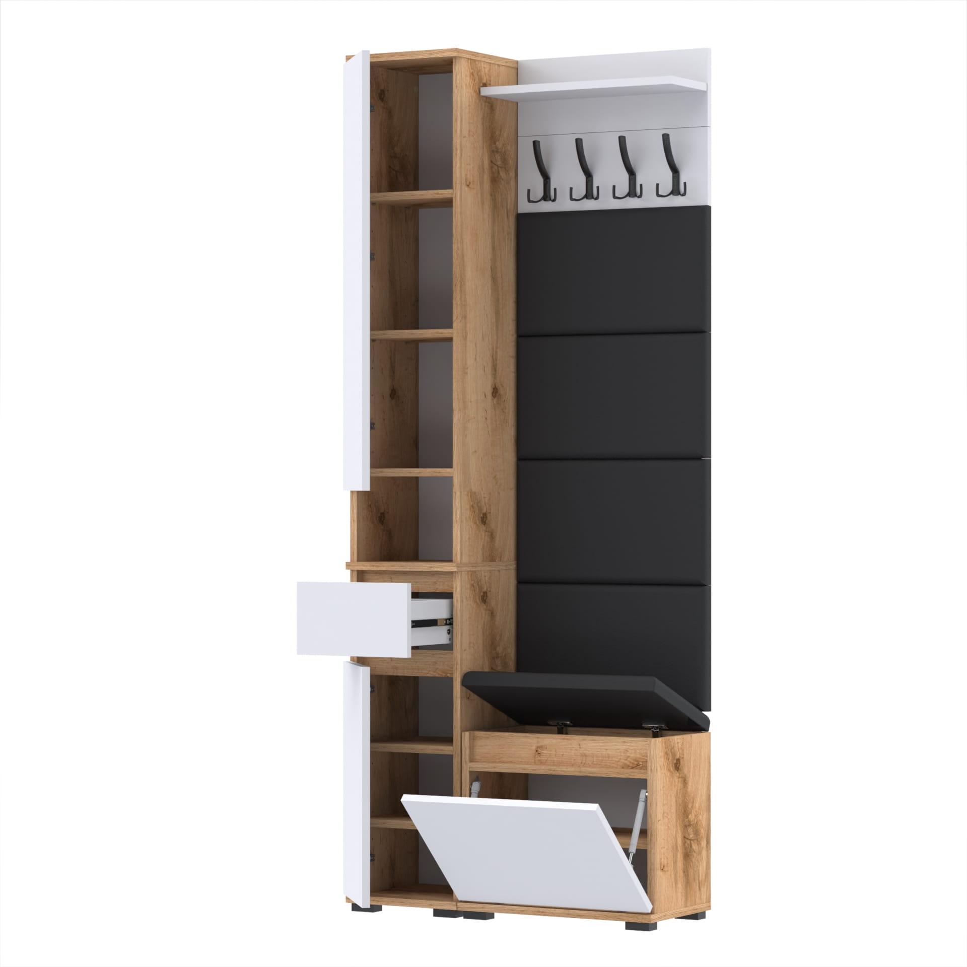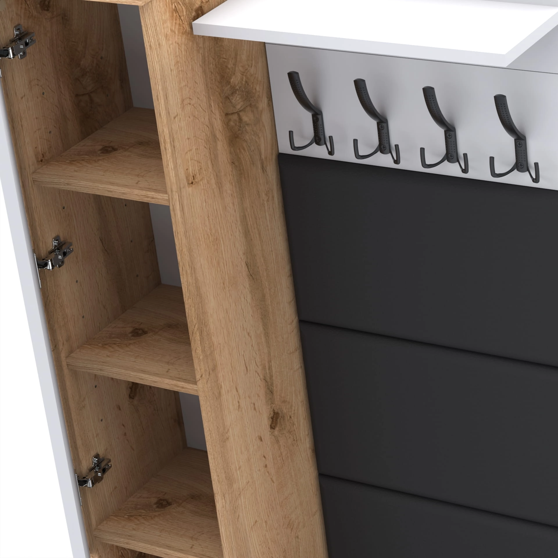 Szafka na buty jest nie tylko wygodna, ale także praktyczna - wewnątrz znajduje się półka, która pozwala na przechowywanie większej ilości obuwia. Dodatkowo, szafka jest wyposażona w schowek na przybory, dzięki czemu wszystko, czego potrzebujesz, jest zawsze pod ręką.