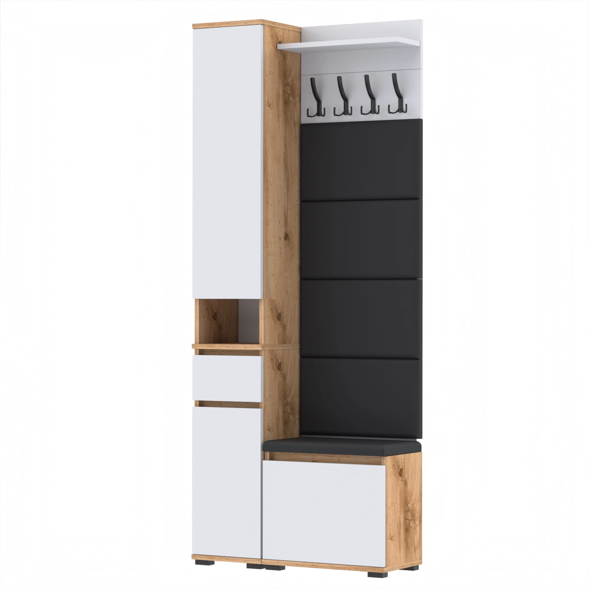 Garderoba to elegancka, funkcjonalna przestrzeń. Wyróżniającym elementem jest szafka na buty z siedziskiem i schowkiem, która ułatwia przechowywanie obuwia i drobnych przedmiotów. Ściany zdobią panele tapicerowane, nadające wnętrzu ciepły, wyrafinowany wygląd. Uzupełnieniem jest praktyczny wieszak ścienny na odzież wierzchnią i dodatkowa szafa na buty lub inne przedmioty, zapewniająca dodatkową przestrzeń do przechowywania.