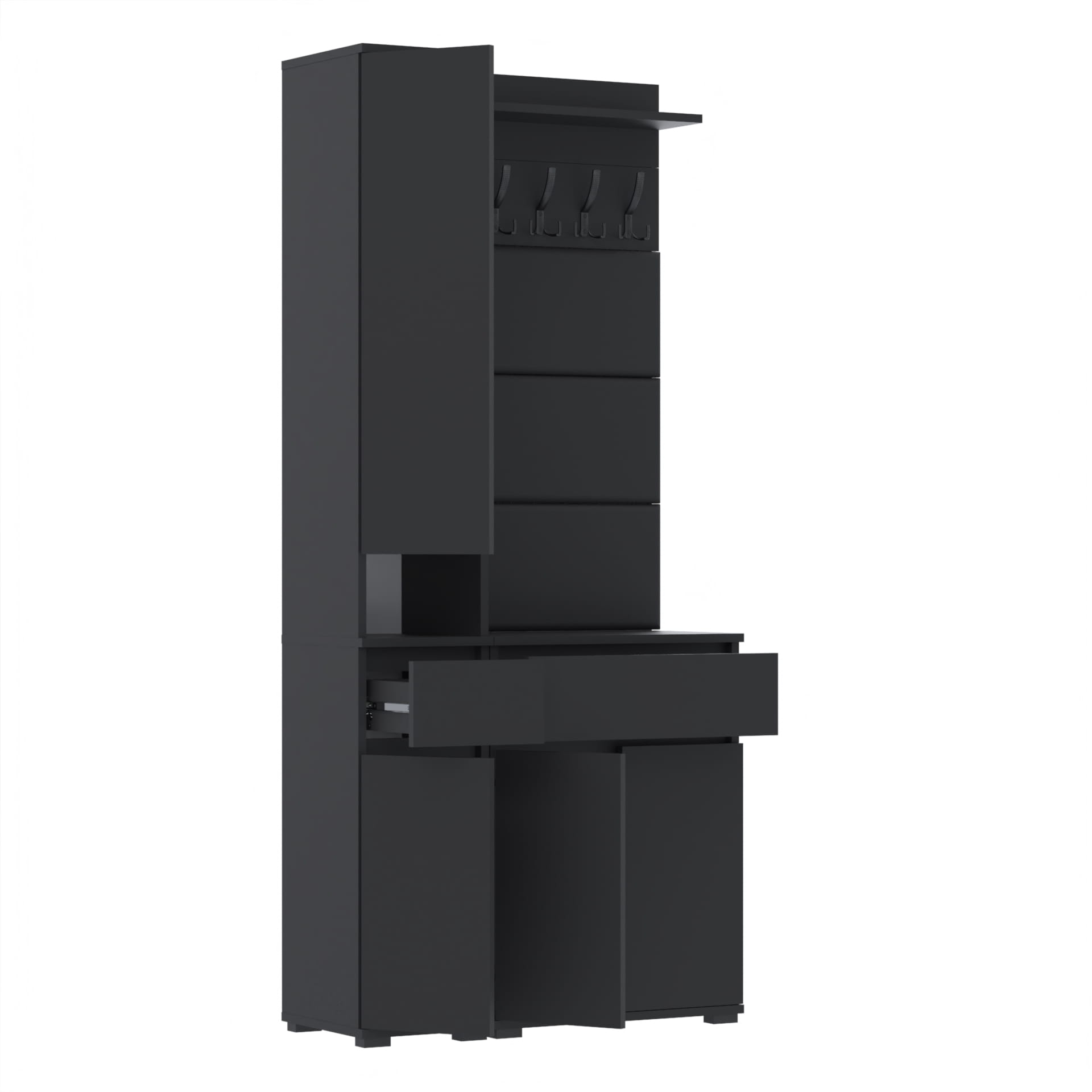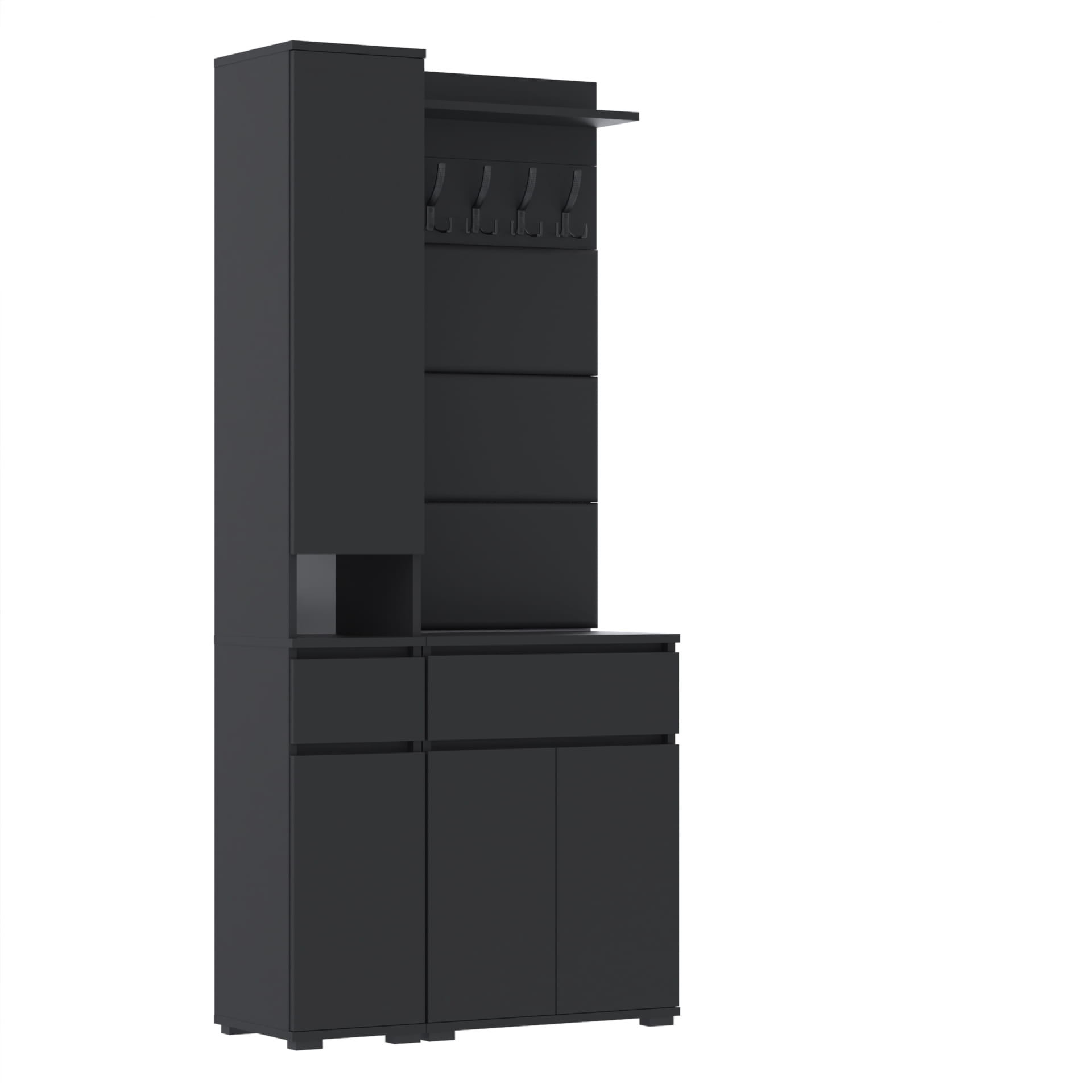 Zestaw składa się z różnorodnych elementów - komody TRES z nadstawką SUPRA, komody TRES z szufladą i 3 półkami na buty, paneli ściennych oraz wieszaka. Te elementy razem tworzą harmonijną całość, ale mogą być również ustawiane w dowolnej konfiguracji, zgodnie z indywidualnymi potrzebami i preferencjami.