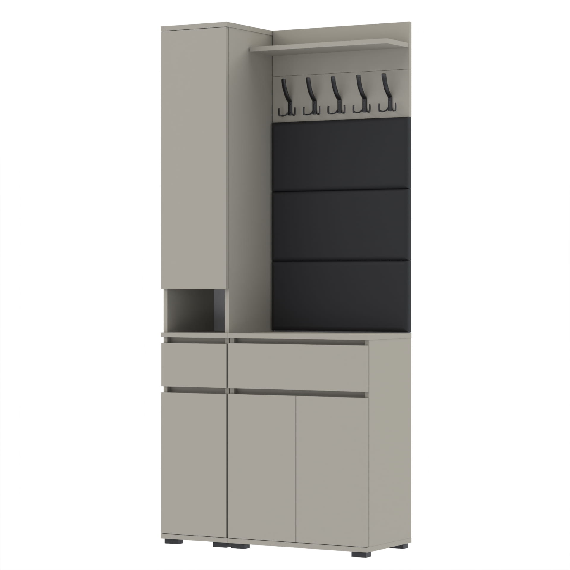 Zestaw składa się z różnorodnych elementów - komody TRES z nadstawką SUPRA, komody TRES z szufladą i 3 półkami na buty, paneli ściennych oraz wieszaka. Te elementy razem tworzą harmonijną całość, ale mogą być również ustawiane w dowolnej konfiguracji, zgodnie z indywidualnymi potrzebami i preferencjami.