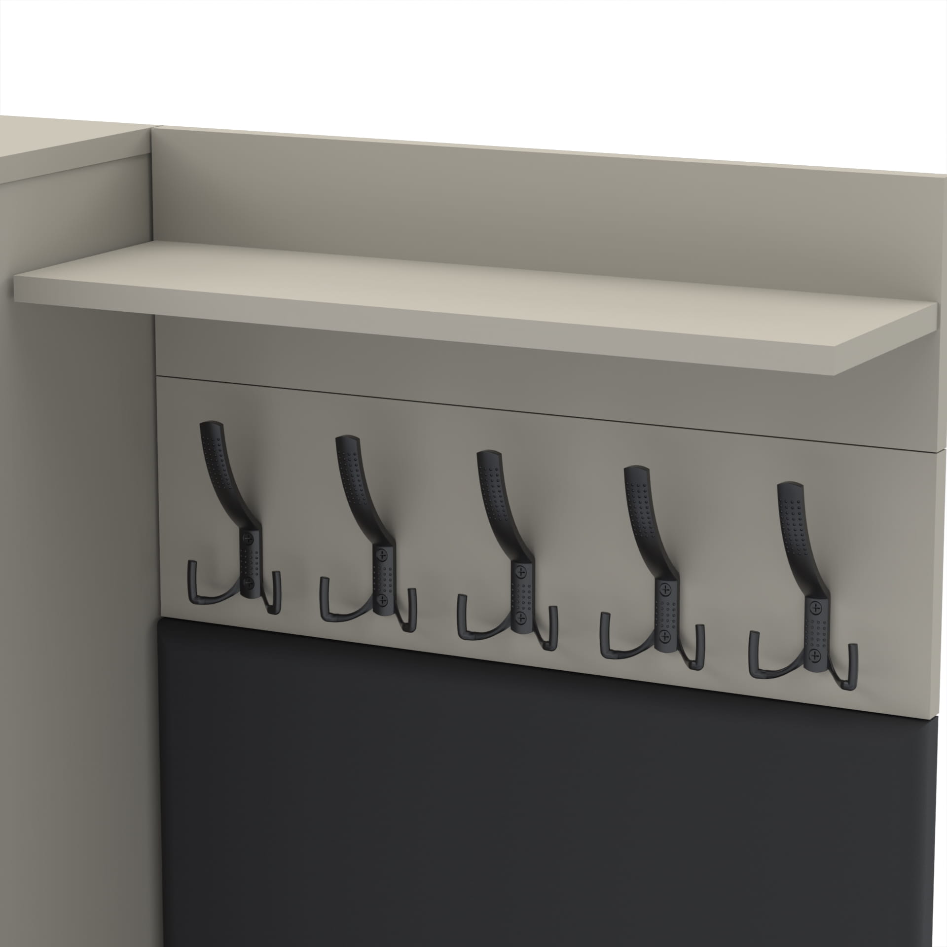 Wieszak z praktyczną półką o głębokości 18 cm. Posiada 5 metalowych uchwytów udostępnia w sumie 15 wieszaków.