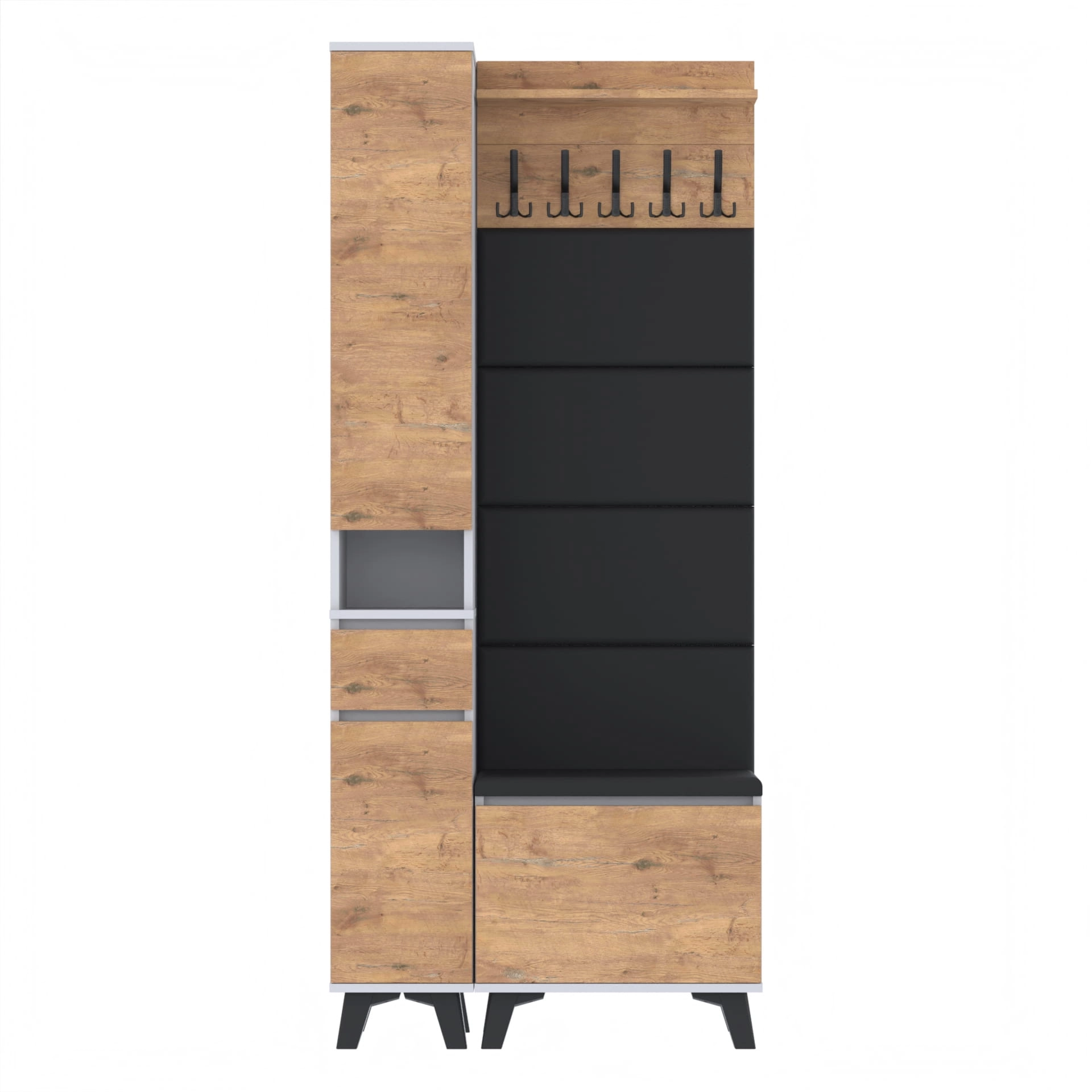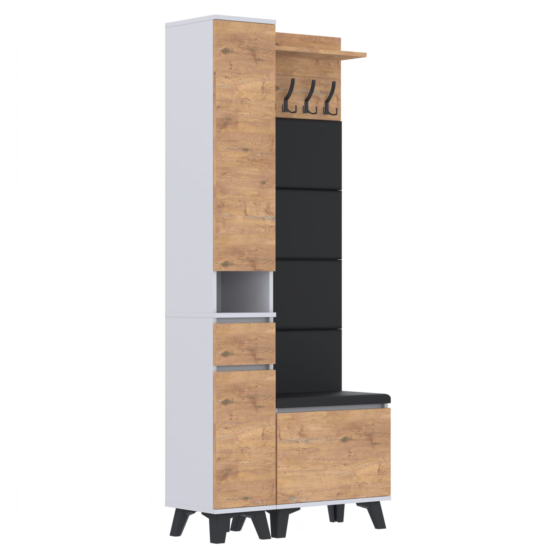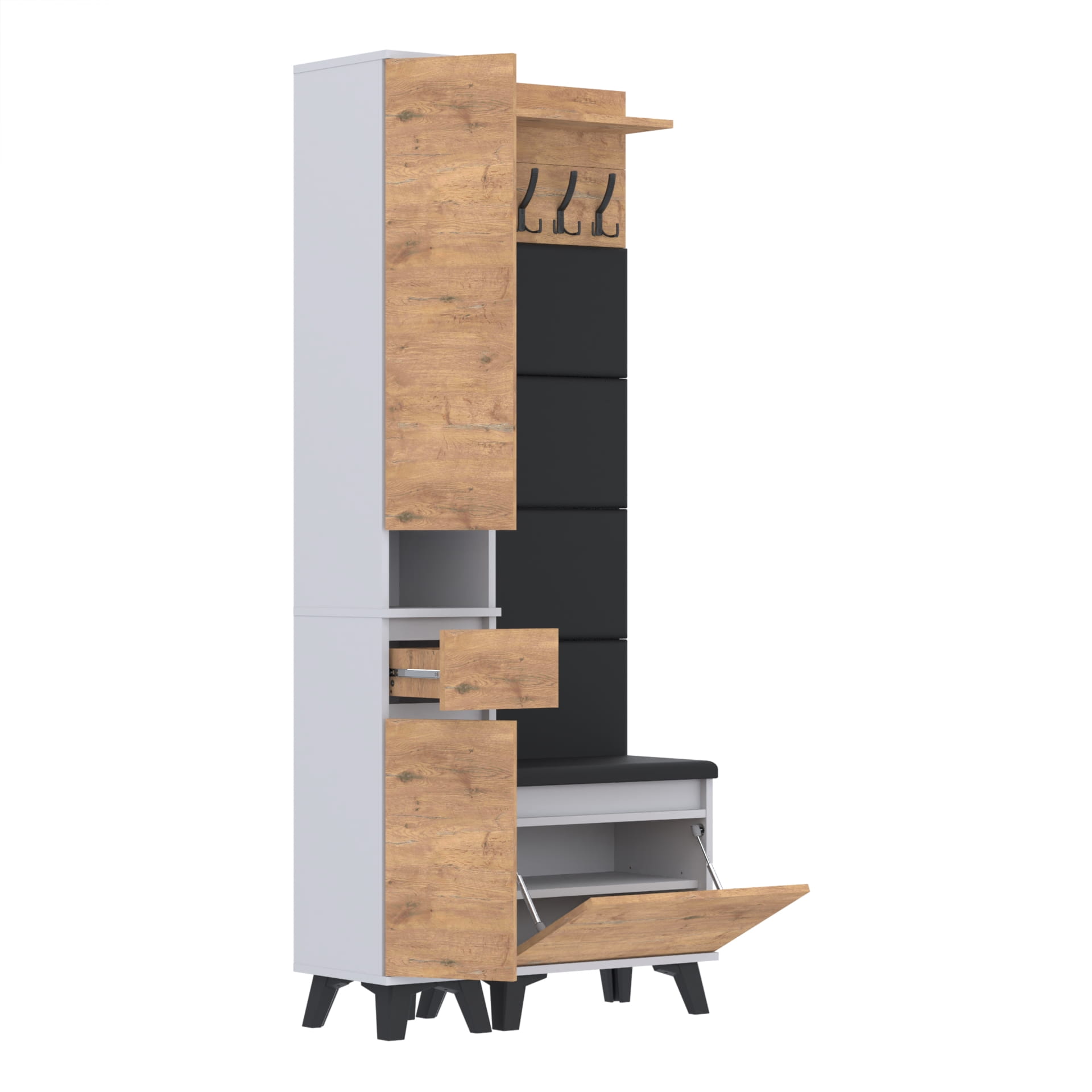 Materiał: Płyta meblowa 18mm, obrzeże ABS, okucia metalowe, nóżki 12cm z plastiku, haki wieszaka metalowe.