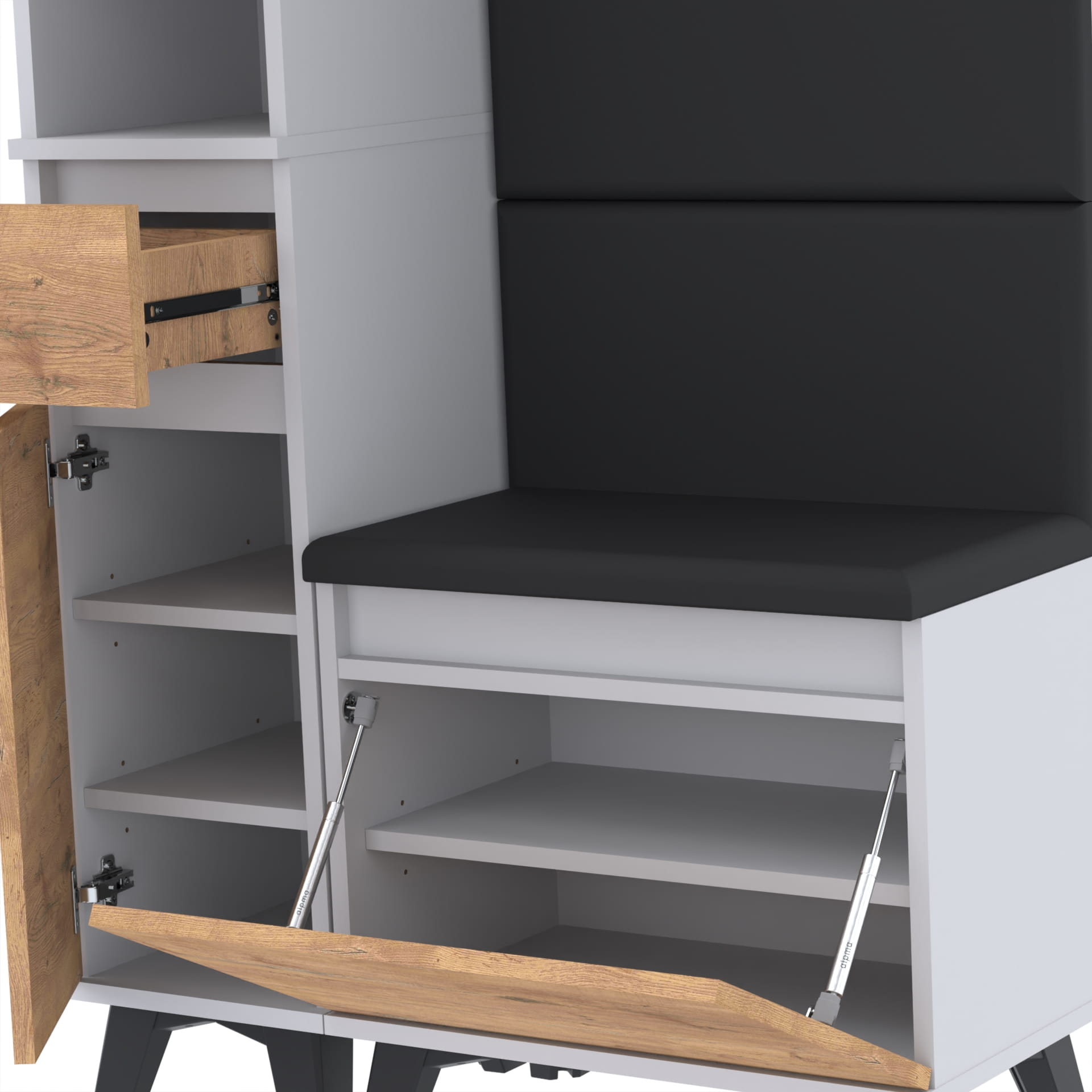 Szafka na buty z siedziskiem to doskonałe połączenie funkcjonalności i wygody. Wyprodukowana w Polsce, doskonale wpasuje się w styl każdego przedpokoju. Siedzisko, obite miękkim, wysokiej jakości materiałem, zapewnia komfort podczas zakładania butów.