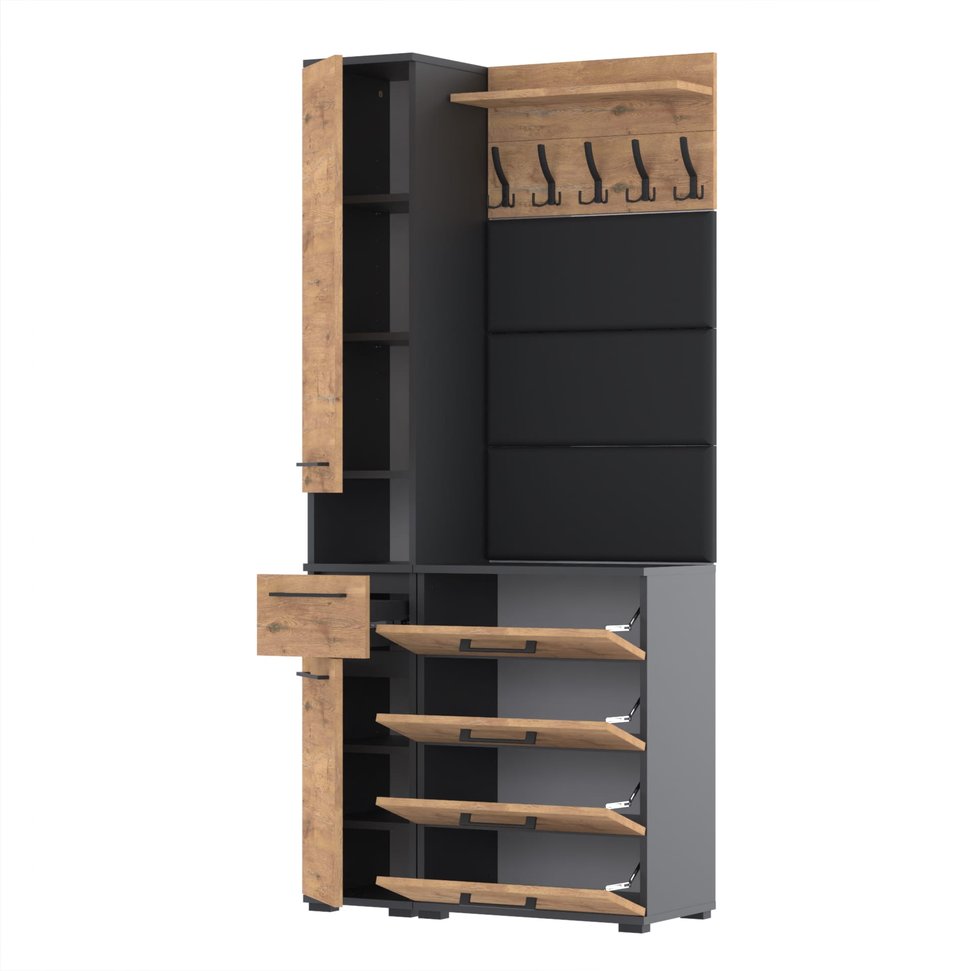 Ciesz się wygodą i stylem, który wprowadzi do Twojego domu ten kompleksowy zestaw mebli. Idealne do przechowywania ubrań, obuwia i innych przedmiotów codziennego użytku, te meble dodadzą elegancji i funkcjonalności każdemu przedpokoju.