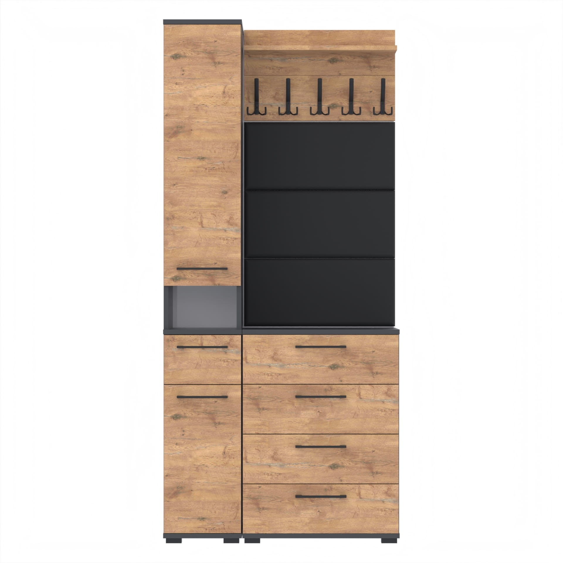 Zestaw składa się z różnorodnych elementów - komody TRES z nadstawką SUPRA, komody ALTUS z czterema szafkami, paneli ściennych oraz wieszaka. Te elementy razem tworzą harmonijną całość, ale mogą być również ustawiane w dowolnej konfiguracji, zgodnie z indywidualnymi potrzebami i preferencjami.