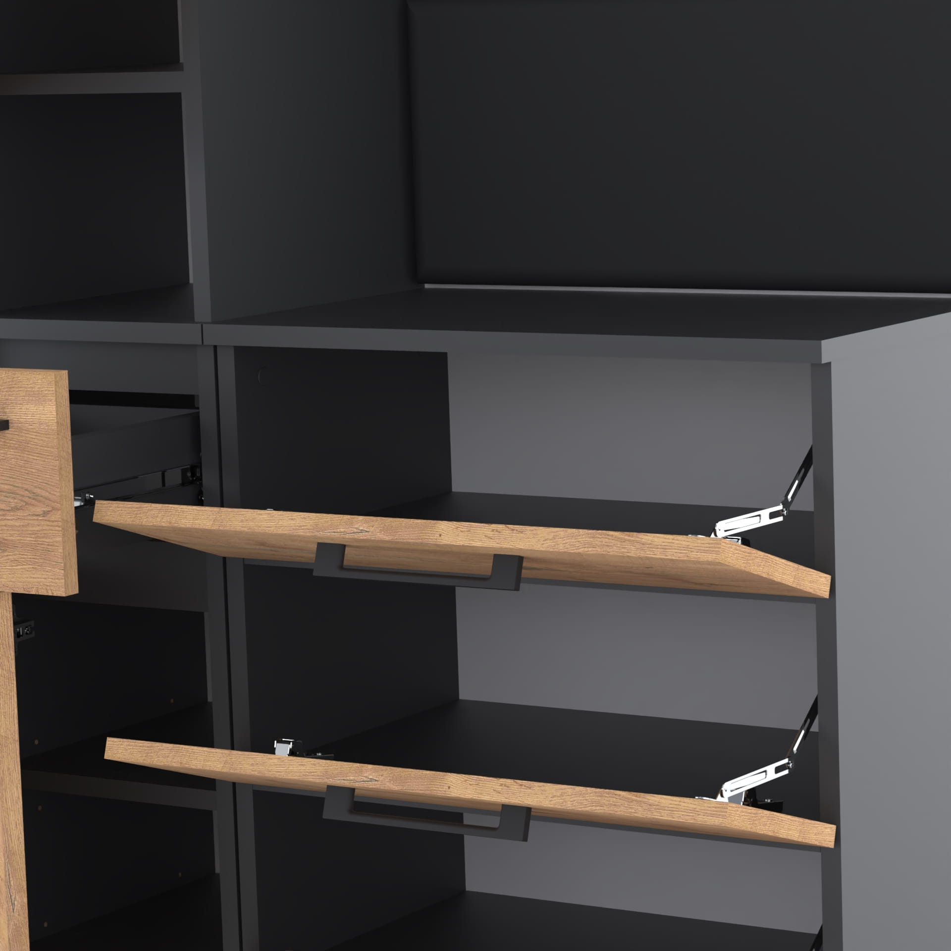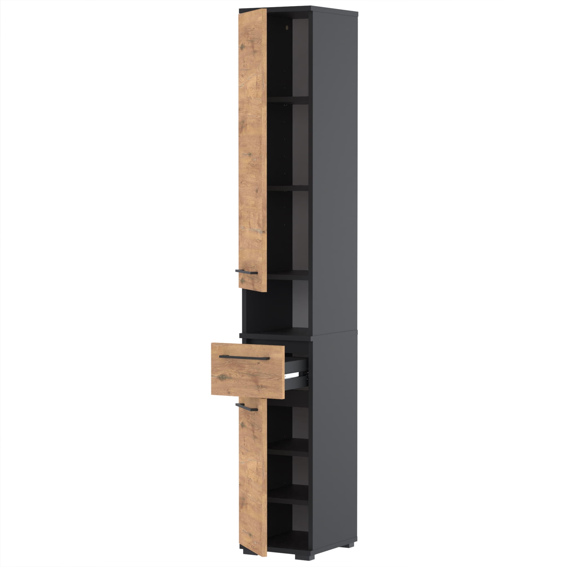 - Solidne metalowe uchwyty, ułatwiające otwieranie i zamykanie szafki.