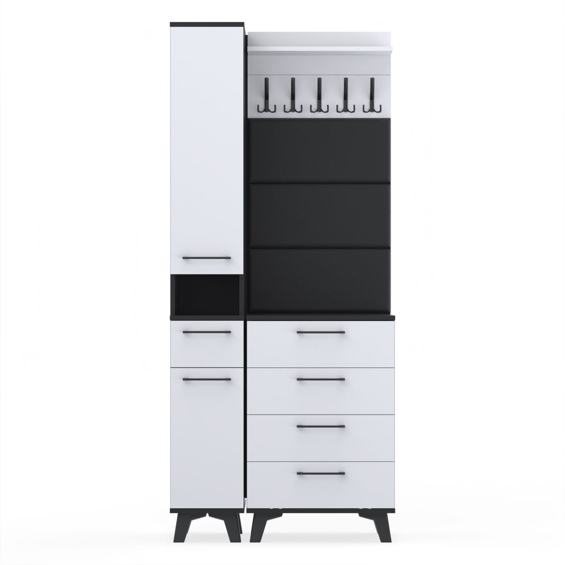 Zestaw składa się z różnorodnych elementów - komody TRES z nadstawką SUPRA, komody ALTUS z czterema szafkami, paneli ściennych oraz wieszaka. Te elementy razem tworzą harmonijną całość, ale mogą być również ustawiane w dowolnej konfiguracji, zgodnie z indywidualnymi potrzebami i preferencjami.