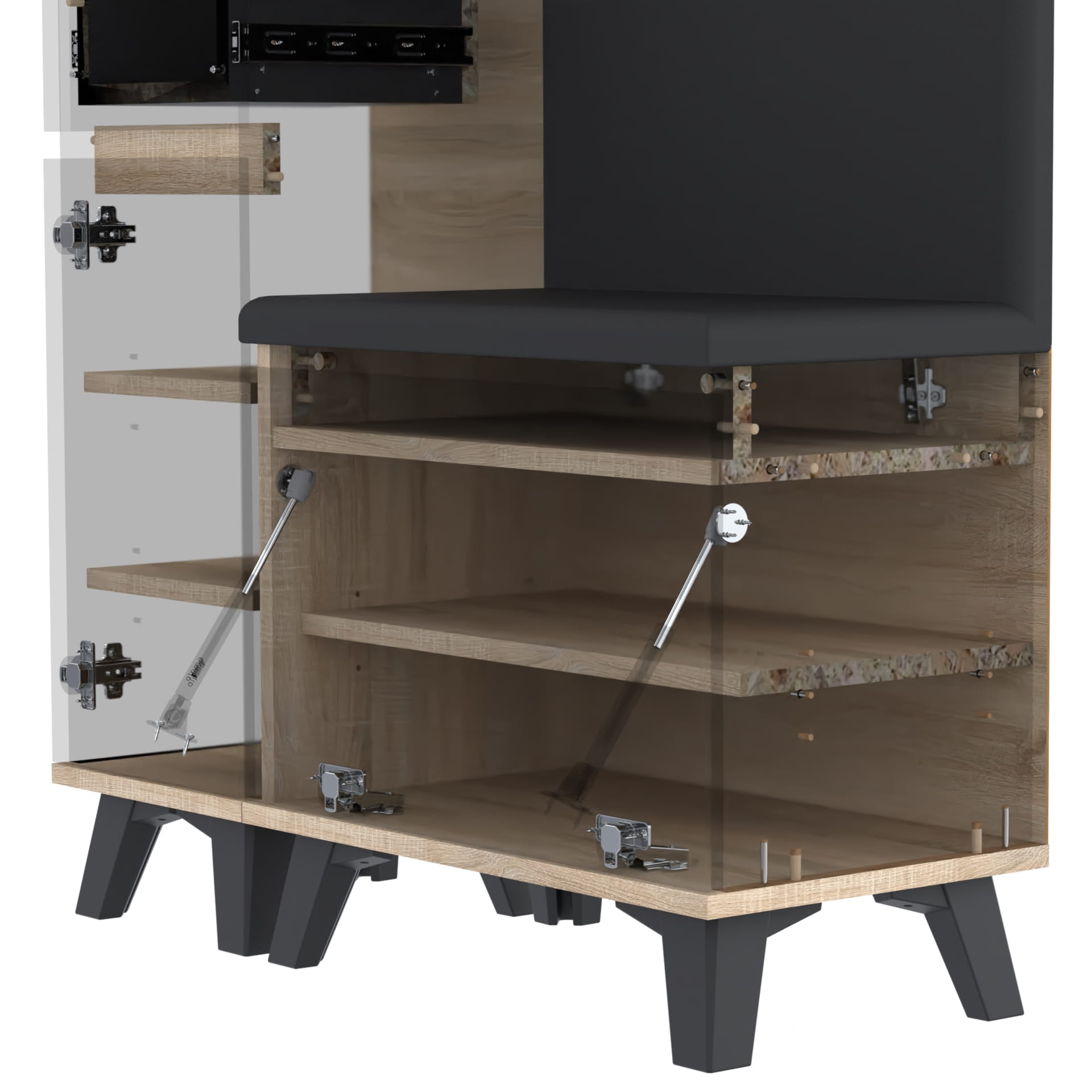 Materiał: Płyta meblowa 18mm, obrzeże ABS, okucia metalowe, nóżki 12cm z plastiku, haki wieszaka metalowe, siłowniki gazowe.
