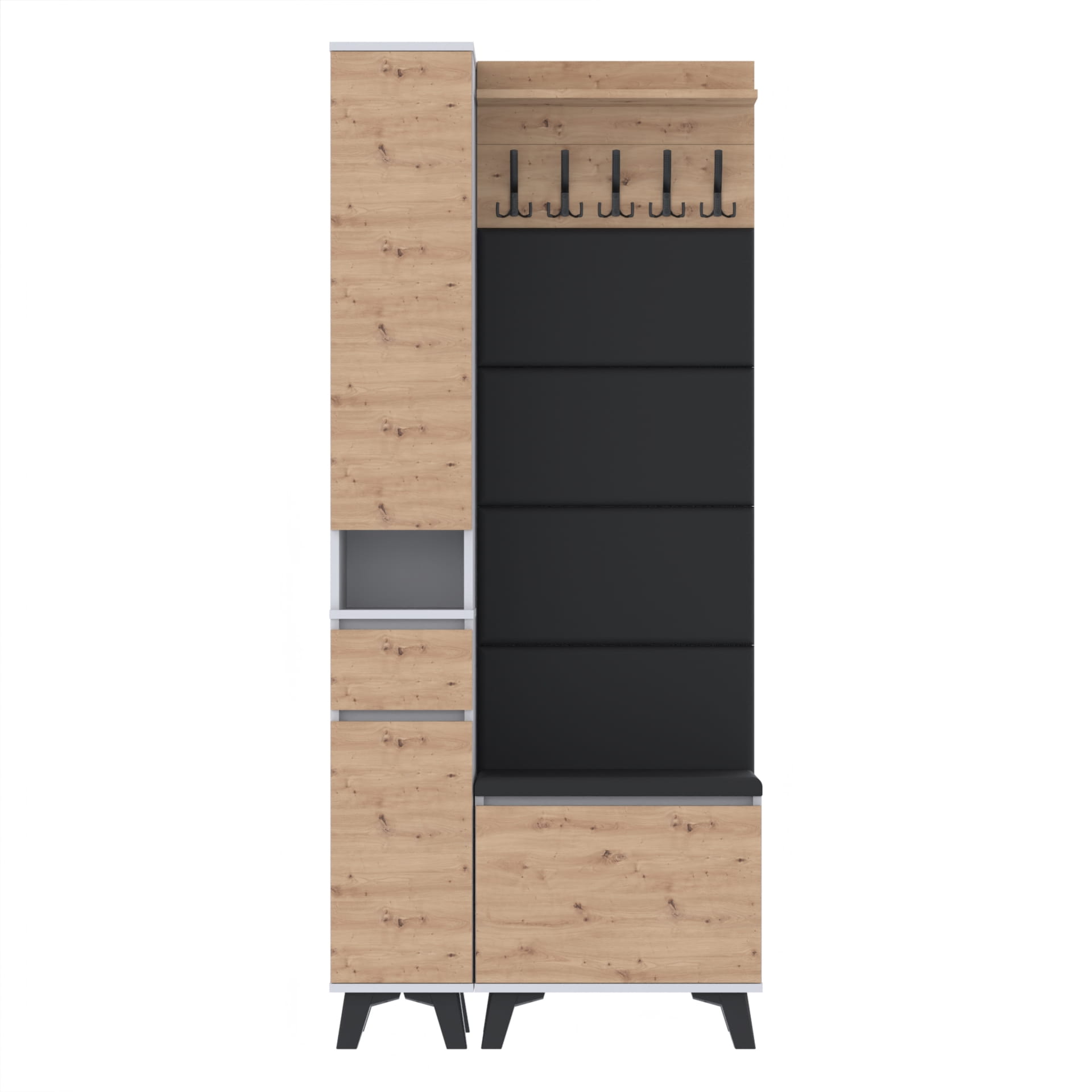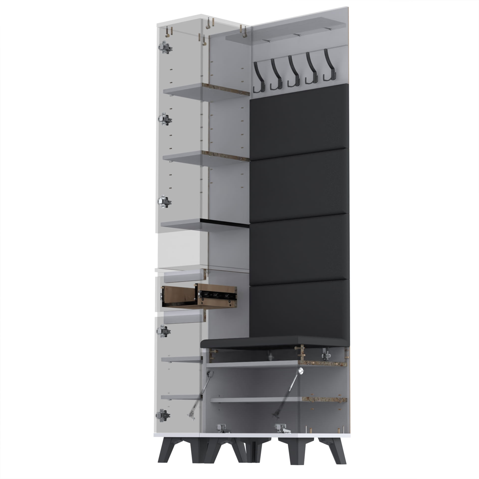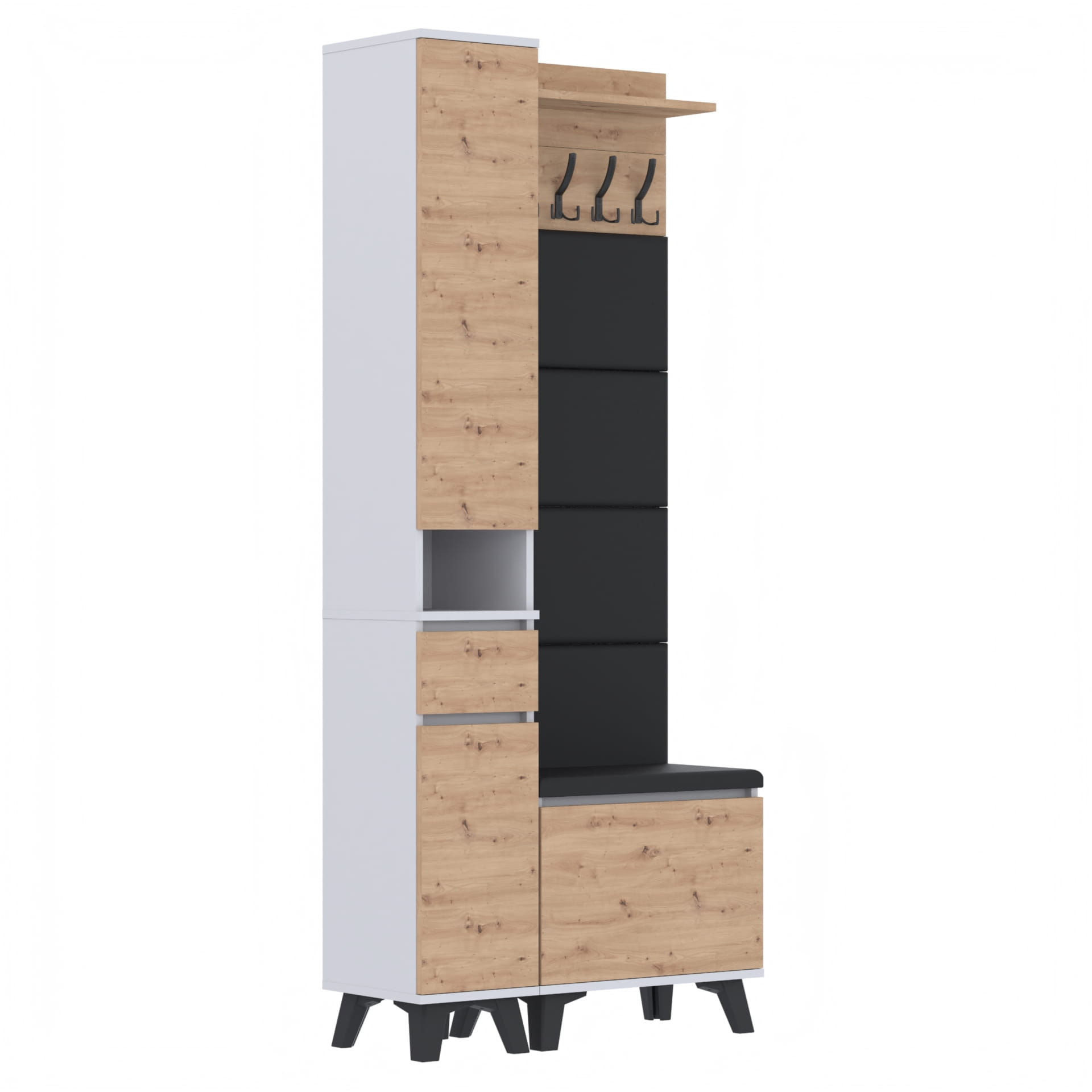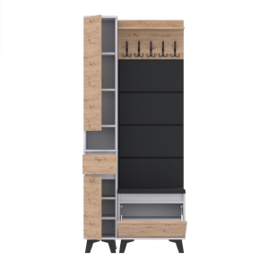 Materiał: Płyta meblowa 18mm, obrzeże ABS, okucia metalowe, nóżki 12cm z plastiku, haki wieszaka metalowe.