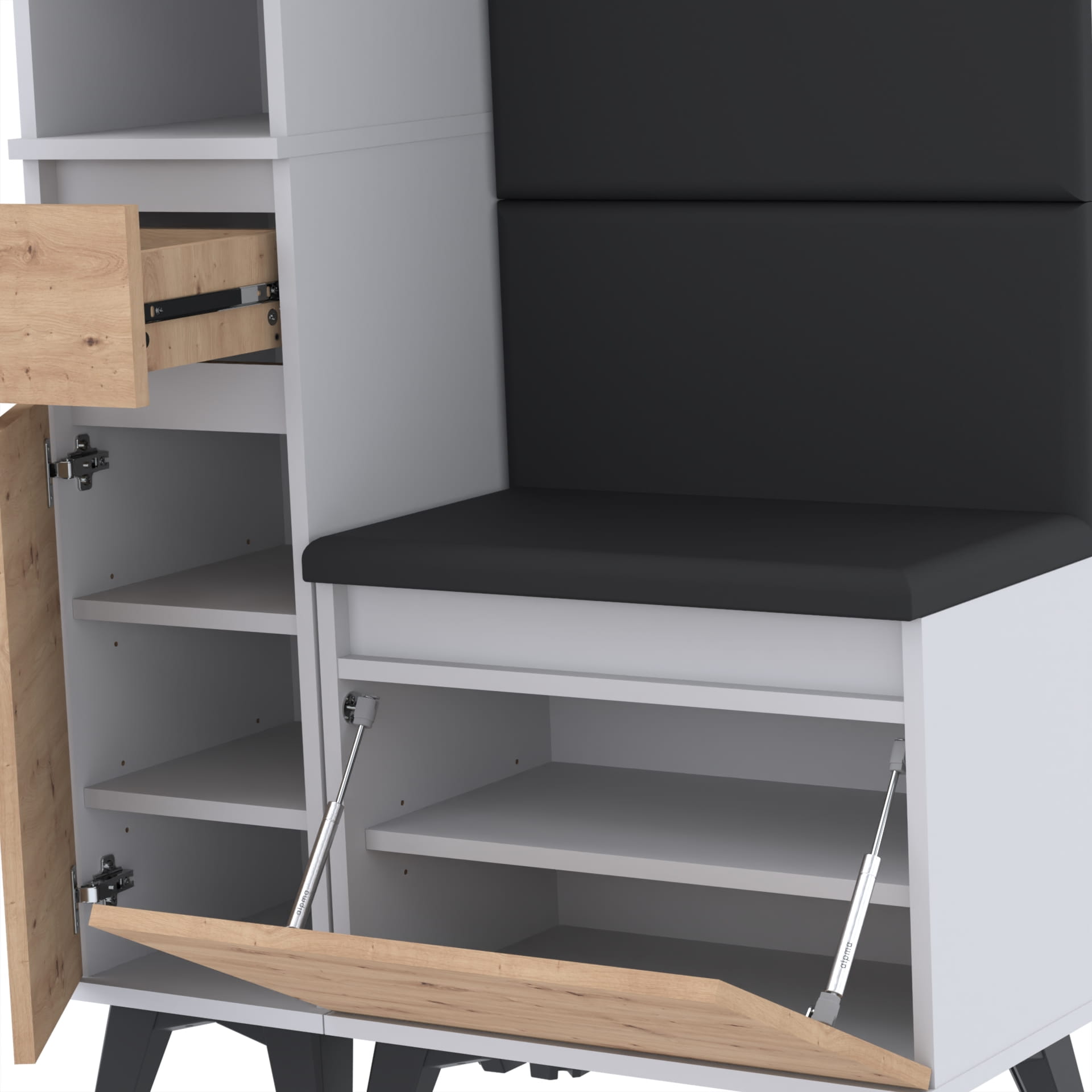 Szafka na buty z siedziskiem to doskonałe połączenie funkcjonalności i wygody. Wyprodukowana w Polsce, doskonale wpasuje się w styl każdego przedpokoju. Siedzisko, obite miękkim, wysokiej jakości materiałem, zapewnia komfort podczas zakładania butów.