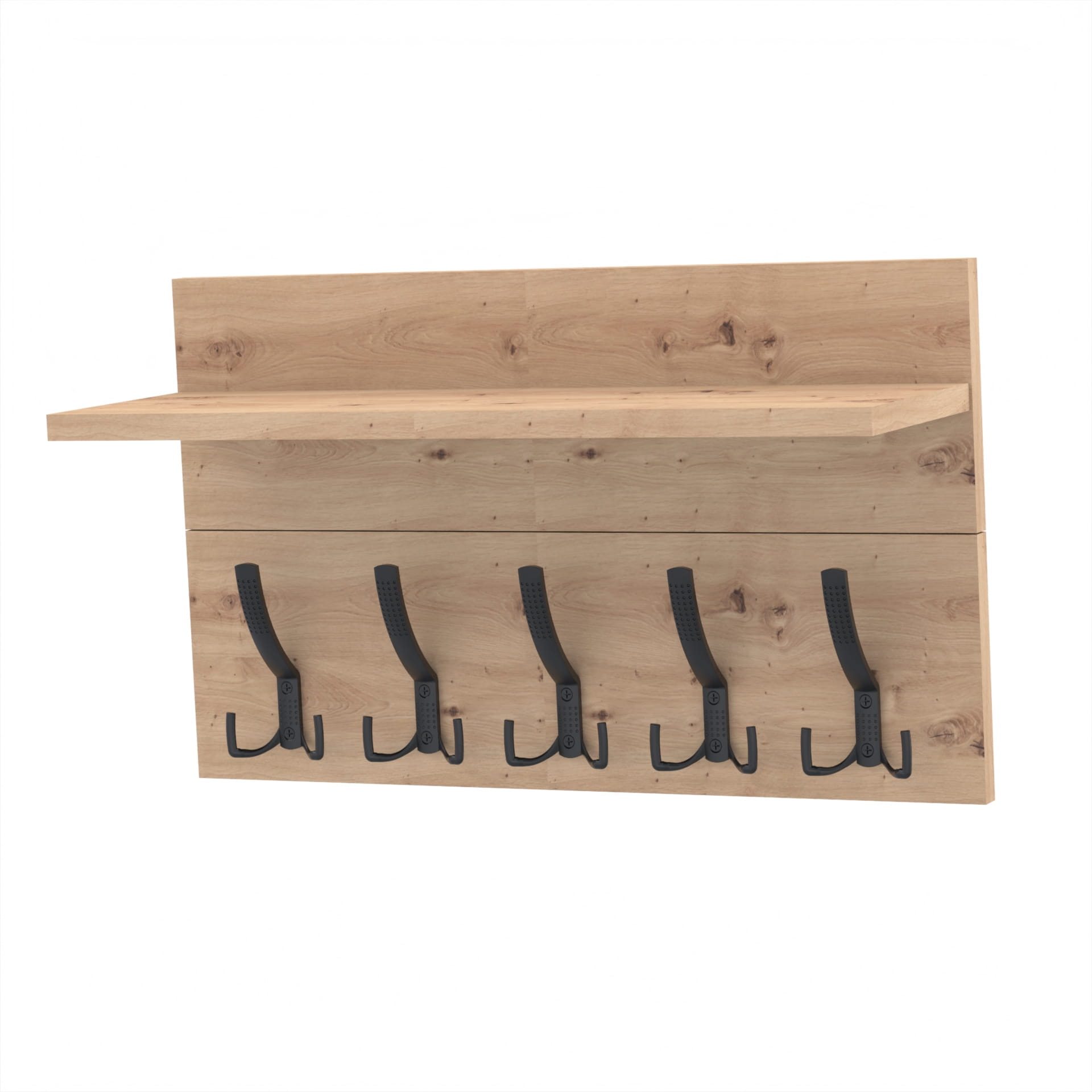 Na górze struktury znajduje się praktyczna półka o głębokości 18 cm, która jest idealna do przechowywania różnych przedmiotów. Półka nie tylko zapewnia dodatkową przestrzeń do przechowywania, ale także stanowi integralną część designu wieszaka, nadając mu ciekawy, nowoczesny wygląd.
