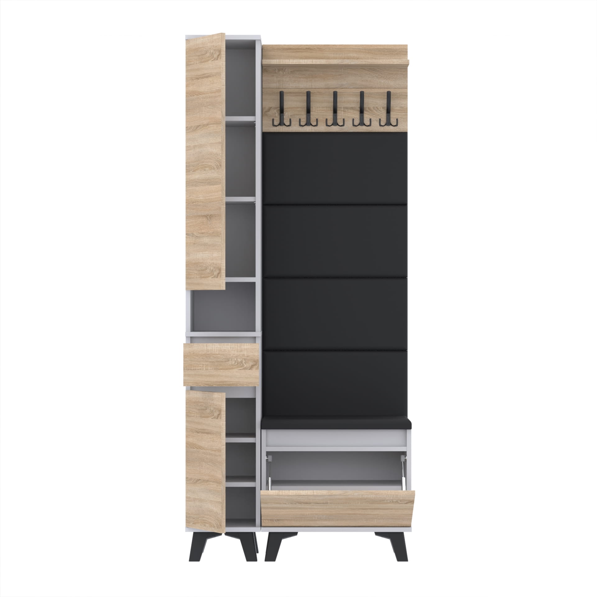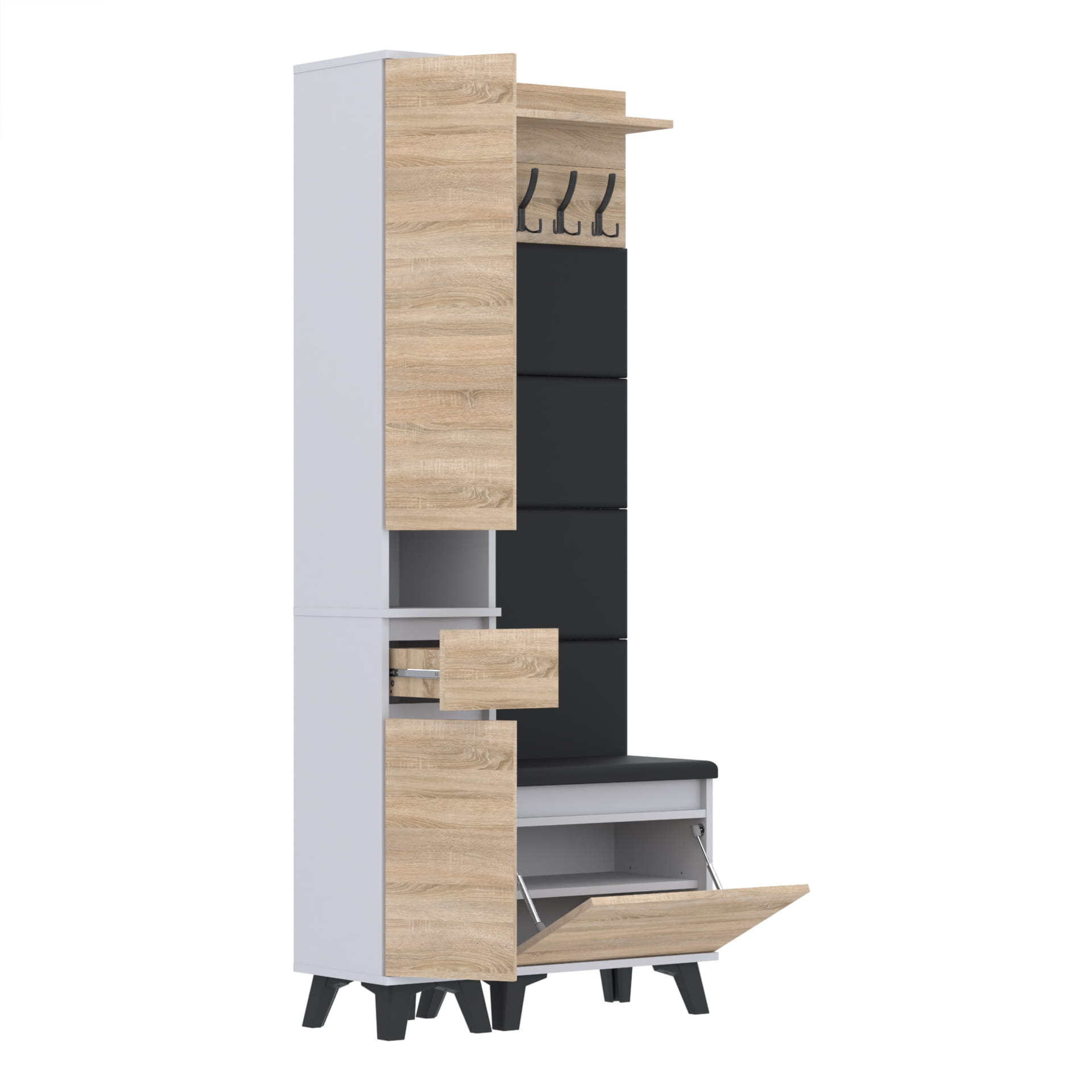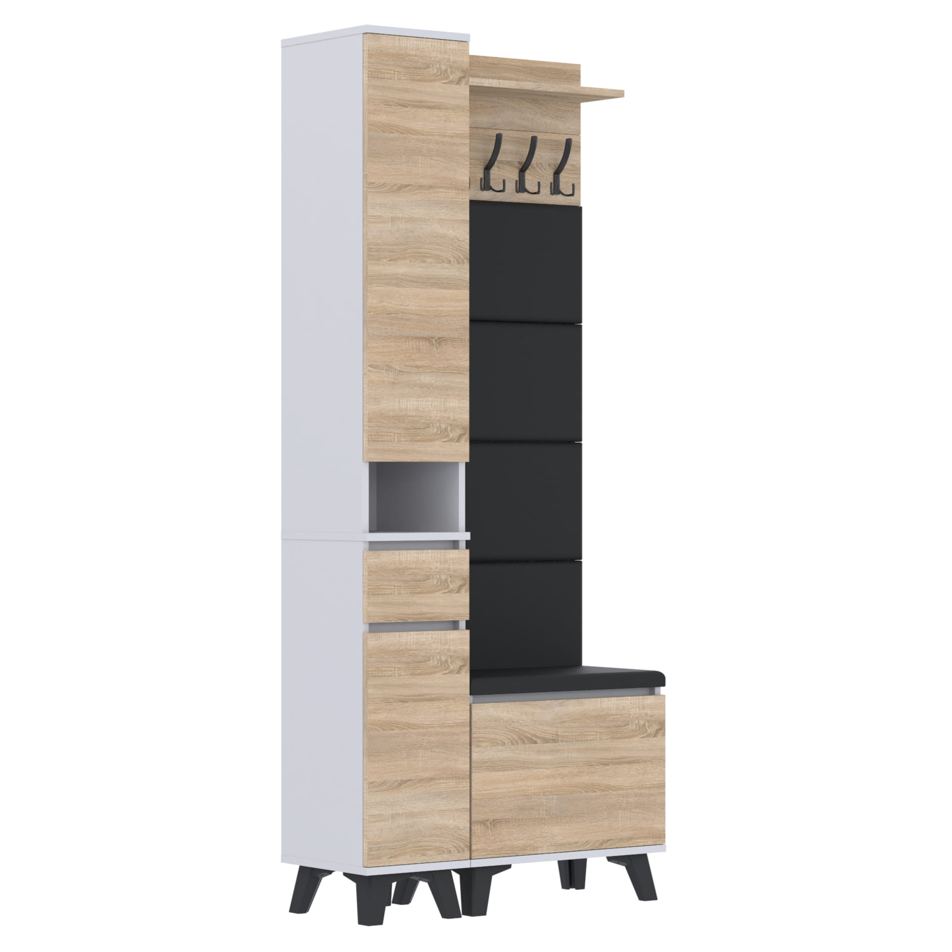 Materiał: Płyta meblowa 18mm, obrzeże ABS, okucia metalowe, nóżki 12cm z plastiku, haki wieszaka metalowe.