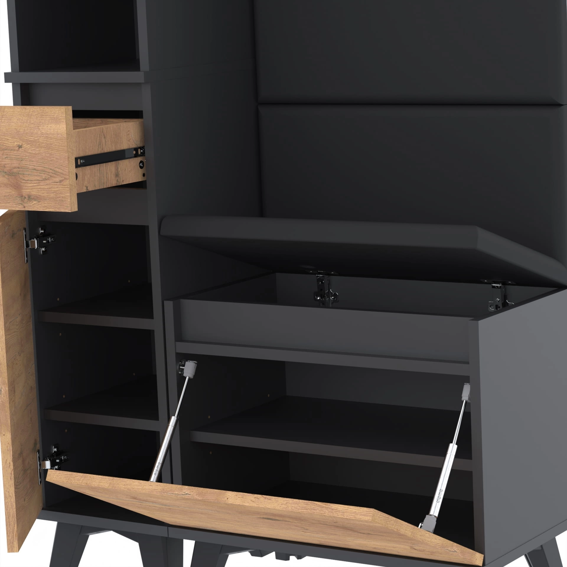 Garderoba to elegancka, funkcjonalna przestrzeń. Wyróżniającym elementem jest szafka na buty z siedziskiem i schowkiem, która ułatwia przechowywanie obuwia i drobnych przedmiotów. Ściany zdobią panele tapicerowane, nadające wnętrzu ciepły, wyrafinowany wygląd. Uzupełnieniem jest praktyczny wieszak ścienny na odzież wierzchnią i dodatkowa szafa na buty lub inne przedmioty, zapewniająca dodatkową przestrzeń do przechowywania.