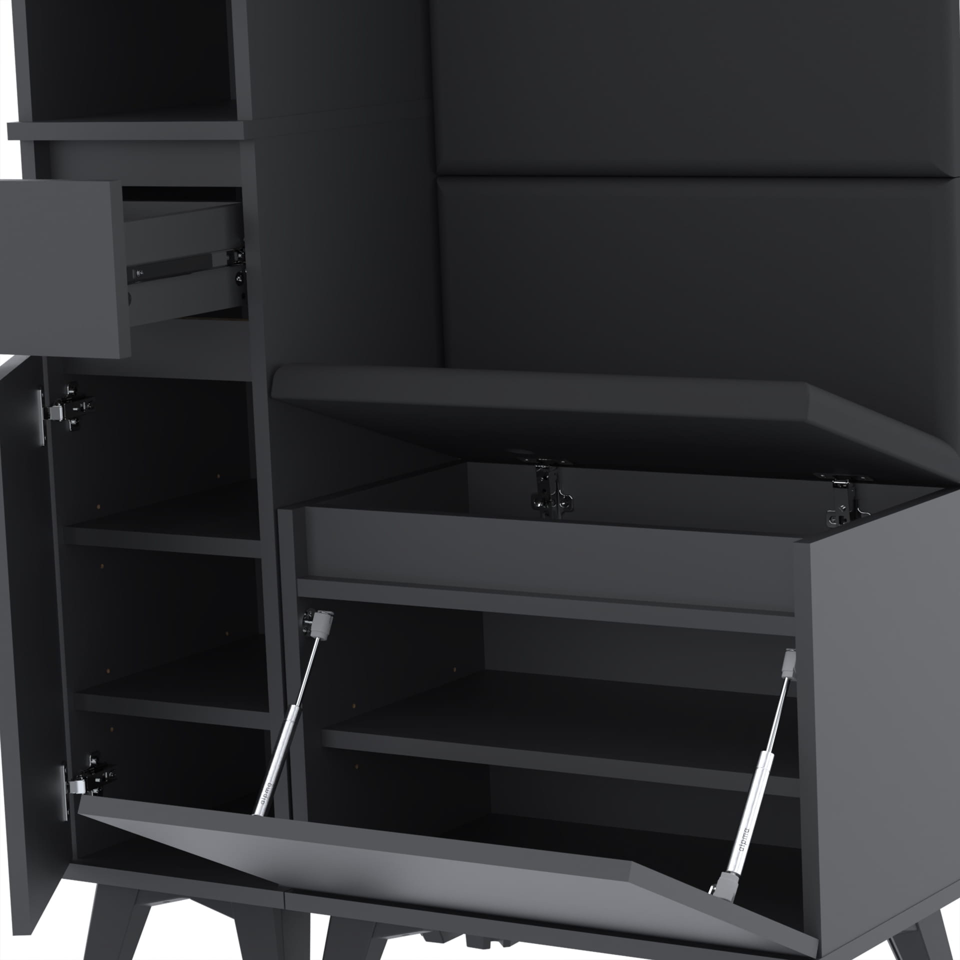 Garderoba to elegancka, funkcjonalna przestrzeń. Wyróżniającym elementem jest szafka na buty z siedziskiem i schowkiem, która ułatwia przechowywanie obuwia i drobnych przedmiotów. Ściany zdobią panele tapicerowane, nadające wnętrzu ciepły, wyrafinowany wygląd. Uzupełnieniem jest praktyczny wieszak ścienny na odzież wierzchnią i dodatkowa szafa na buty lub inne przedmioty, zapewniająca dodatkową przestrzeń do przechowywania.