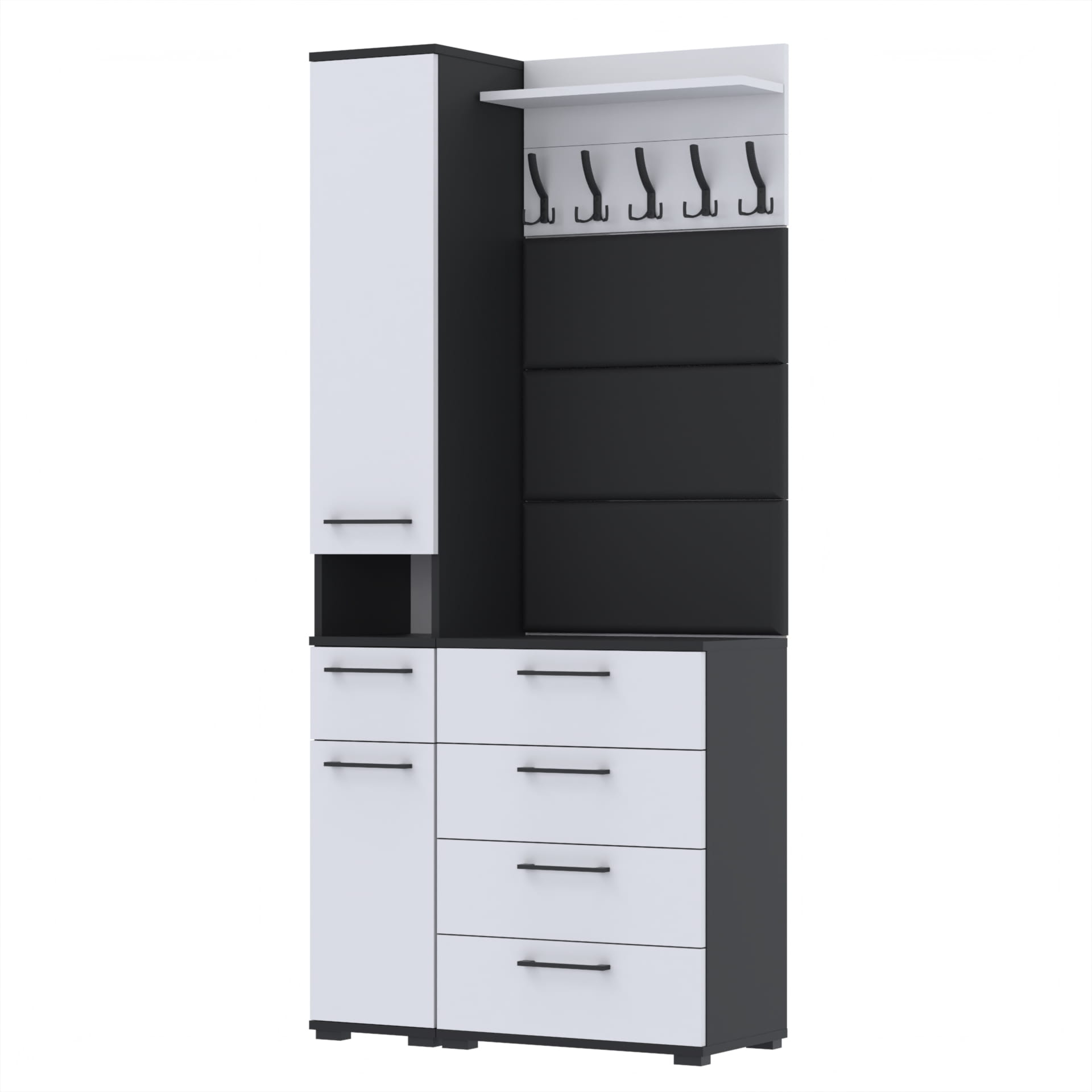 Zestaw składa się z różnorodnych elementów - komody TRES z nadstawką SUPRA, komody ALTUS z czterema szafkami, paneli ściennych oraz wieszaka. Te elementy razem tworzą harmonijną całość, ale mogą być również ustawiane w dowolnej konfiguracji, zgodnie z indywidualnymi potrzebami i preferencjami.