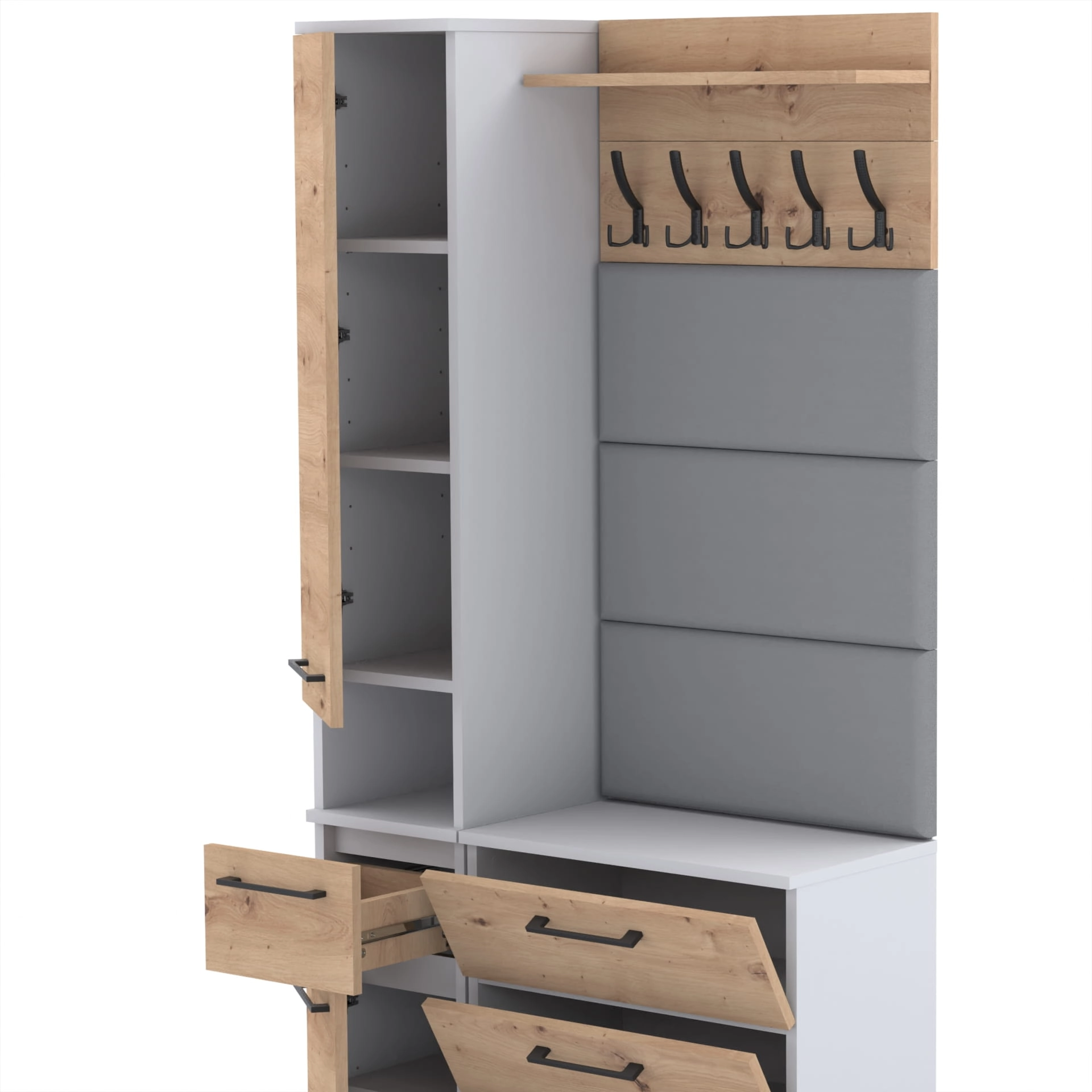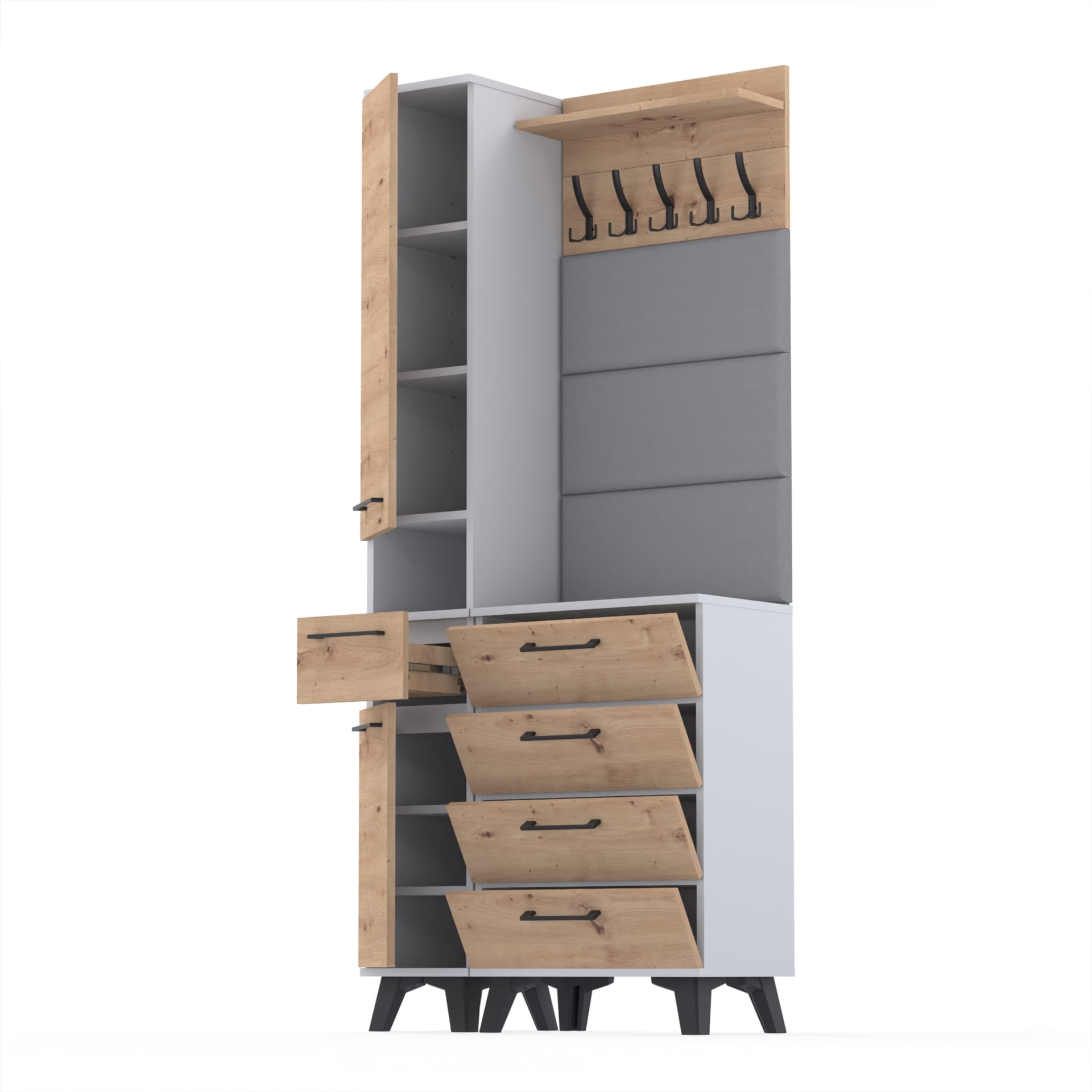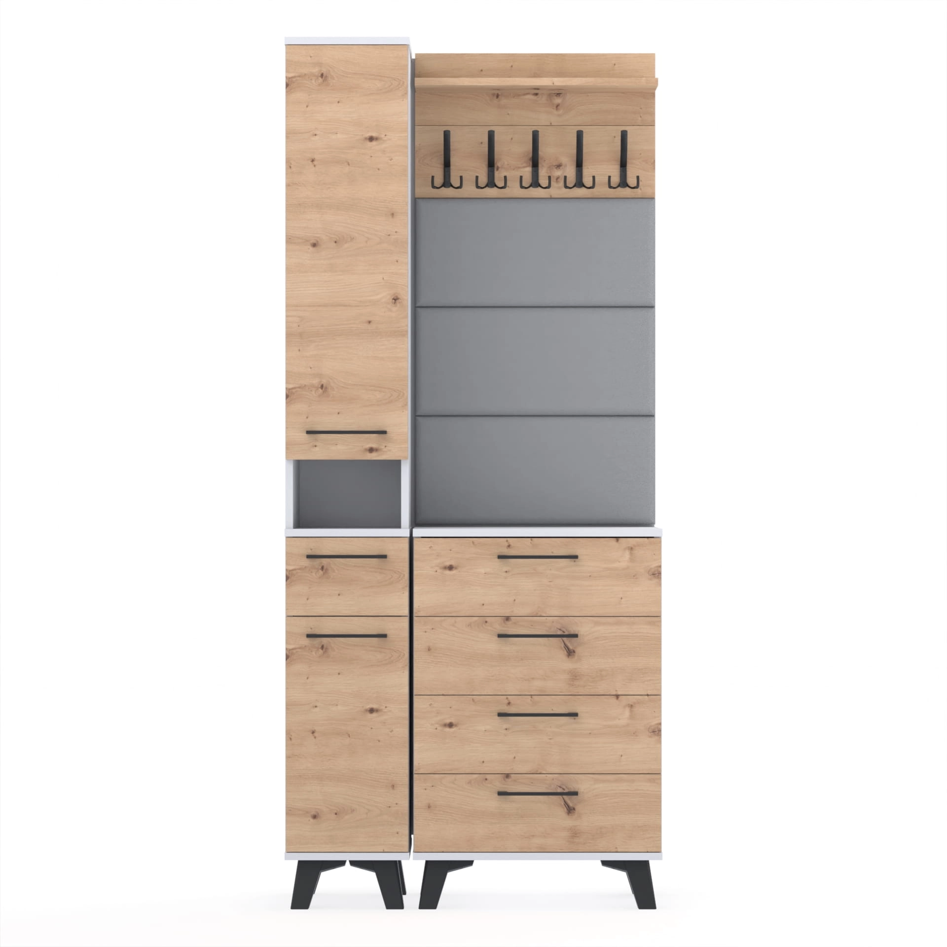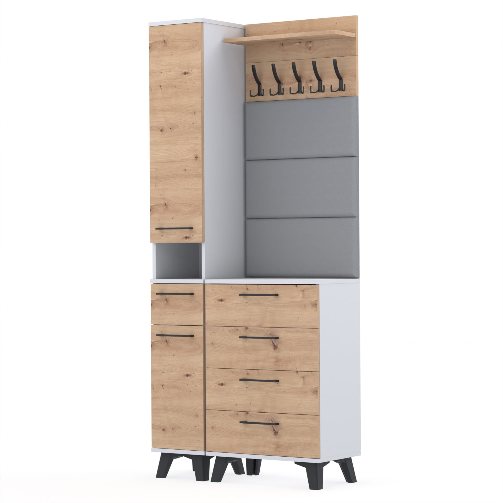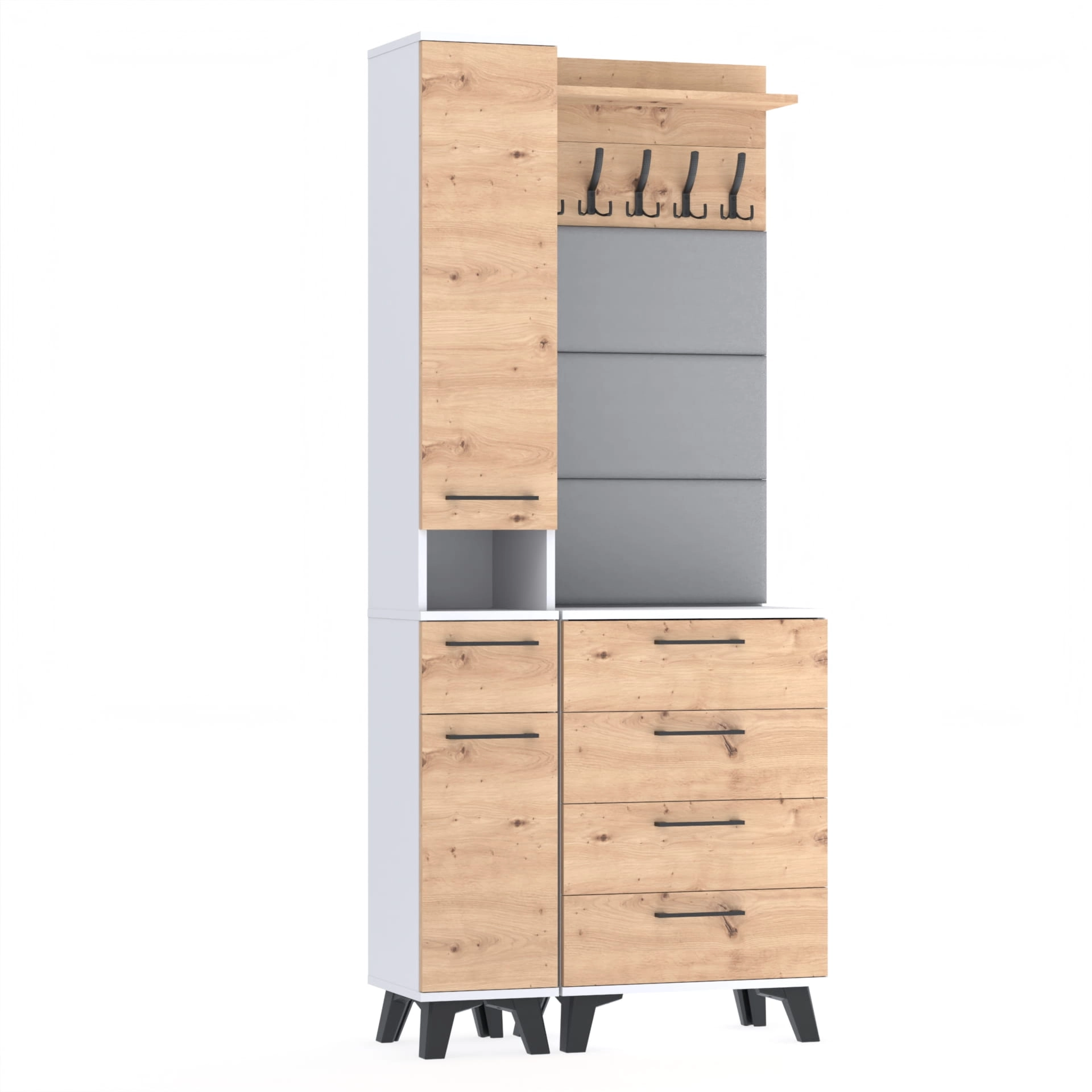 Zestaw składa się z różnorodnych elementów - komody TRES z nadstawką SUPRA, komody ALTUS z czterema szafkami, paneli ściennych oraz wieszaka. Te elementy razem tworzą harmonijną całość, ale mogą być również ustawiane w dowolnej konfiguracji, zgodnie z indywidualnymi potrzebami i preferencjami.
