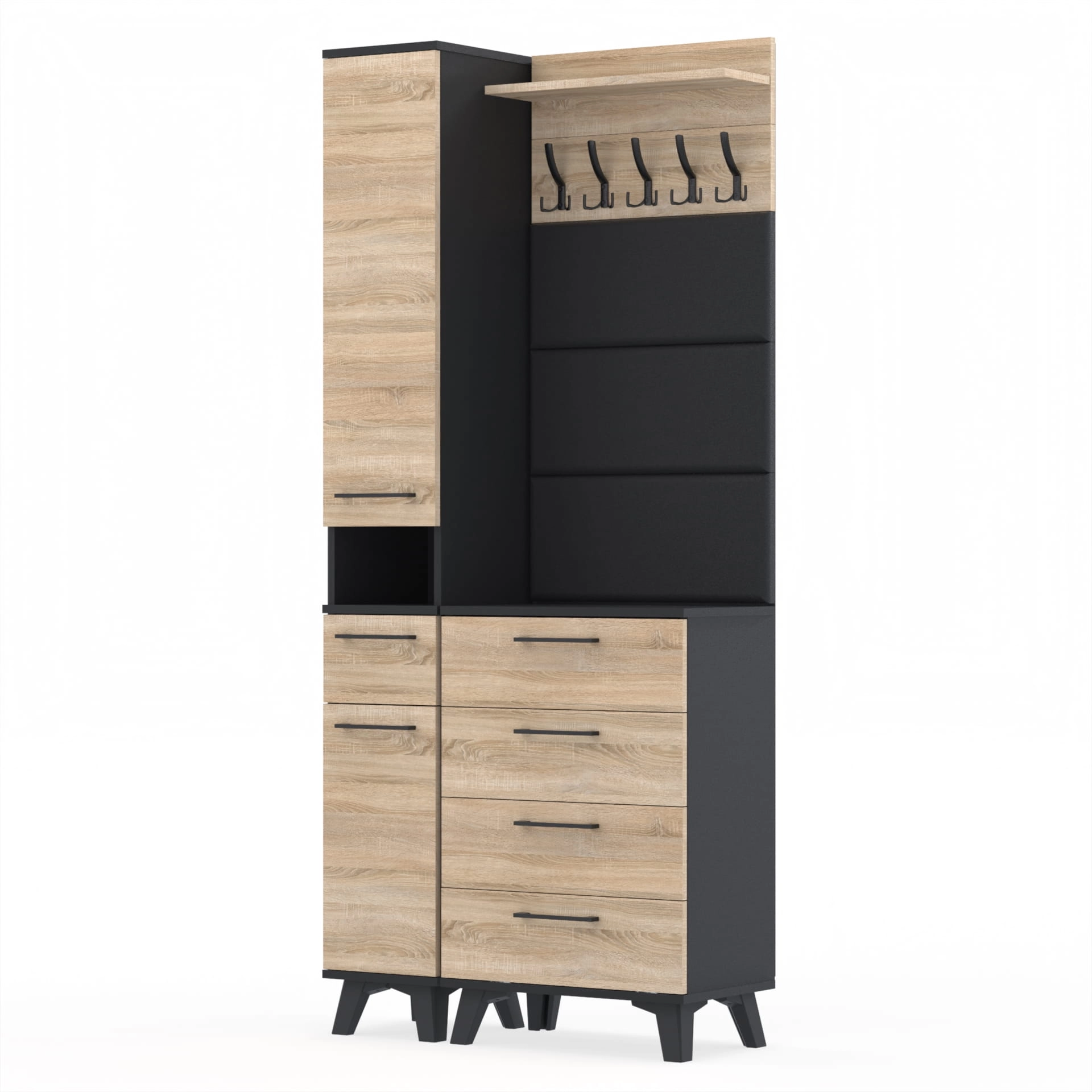 Zestaw składa się z różnorodnych elementów - komody TRES z nadstawką SUPRA, komody ALTUS z czterema szafkami, paneli ściennych oraz wieszaka. Te elementy razem tworzą harmonijną całość, ale mogą być również ustawiane w dowolnej konfiguracji, zgodnie z indywidualnymi potrzebami i preferencjami.