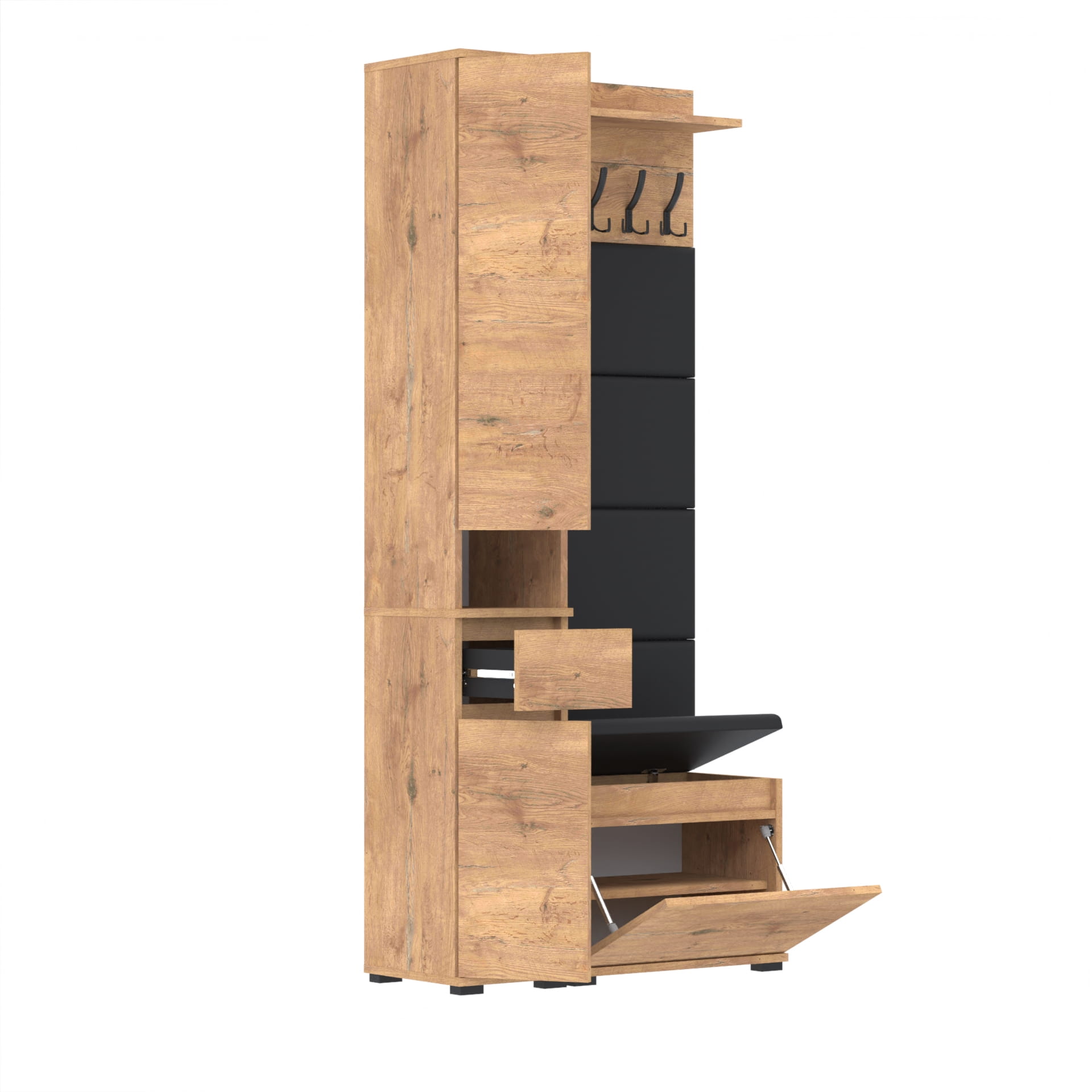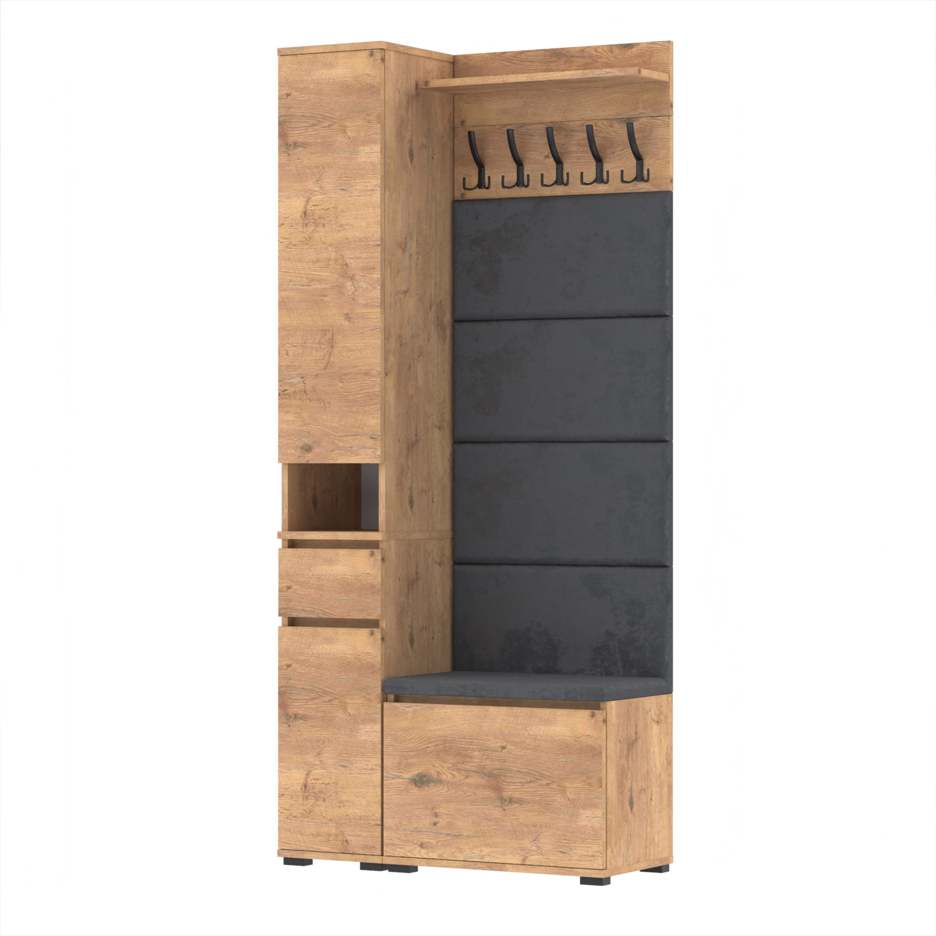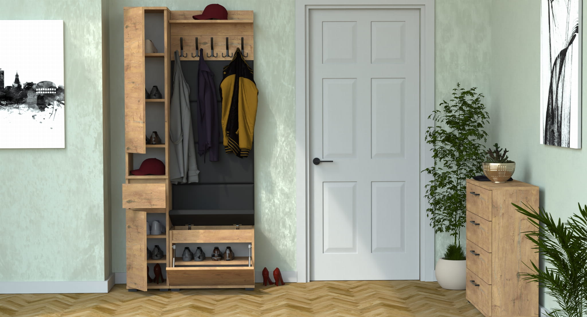 Meble wyprodukowane w Polsce, przeznaczone do przedpokoju. Doskonałe do przechowywania ubrań, obuwia i innych przedmiotów codziennego użytku. Wykonane z wysokiej jakości płyt meblowych renomowanych producentów, posiadają niezbędne certyfikaty i atesty higieniczne.