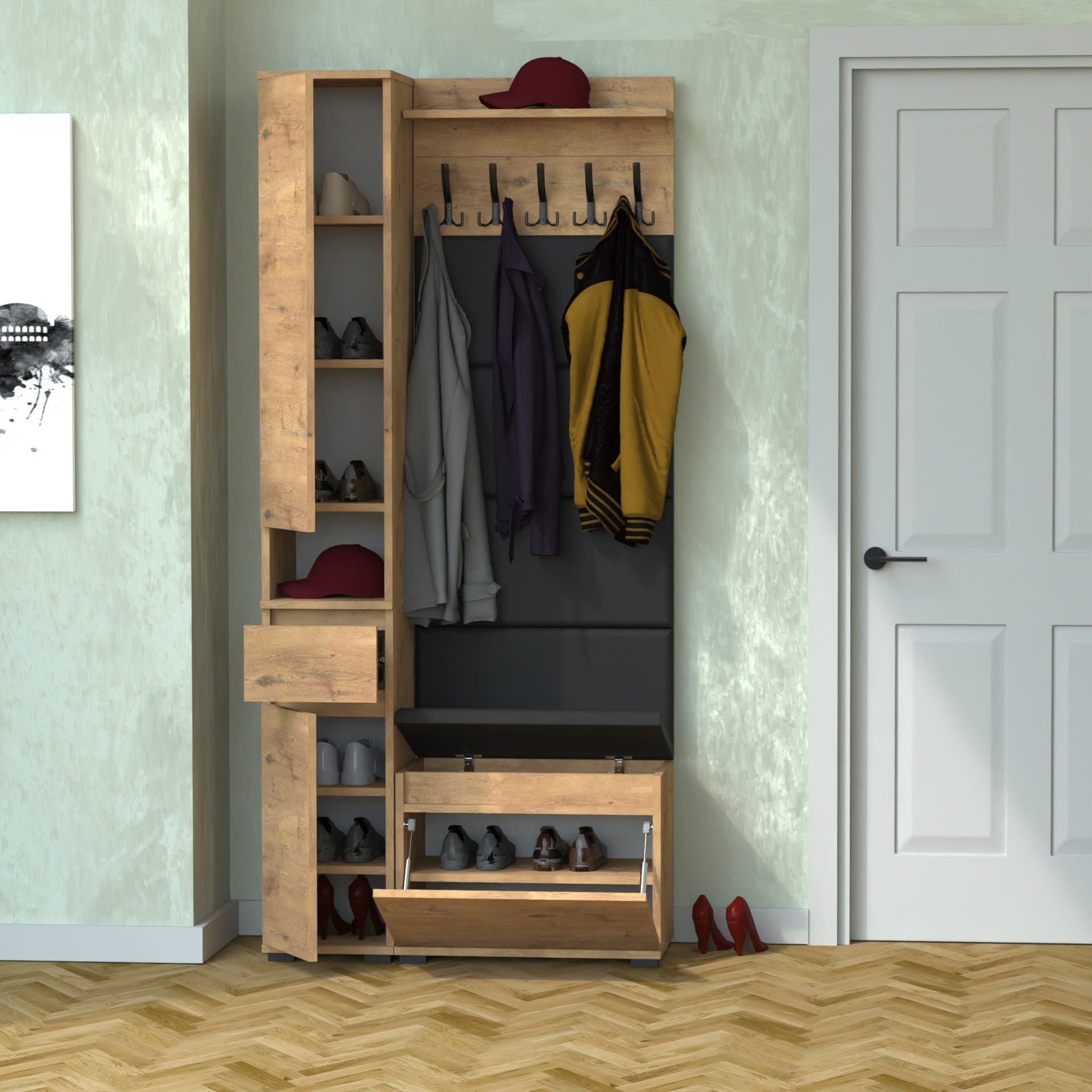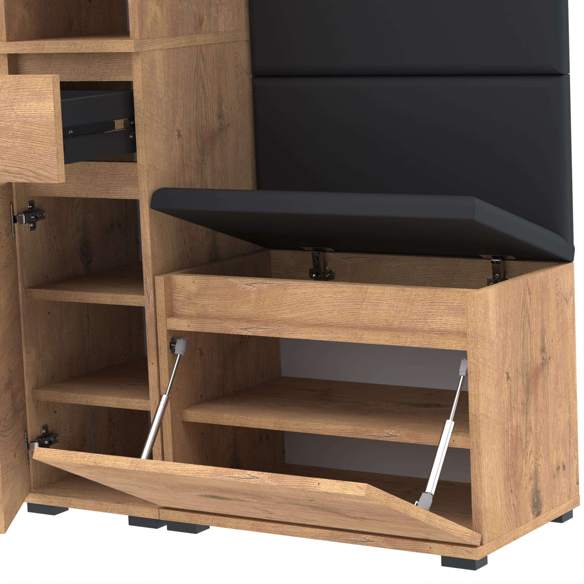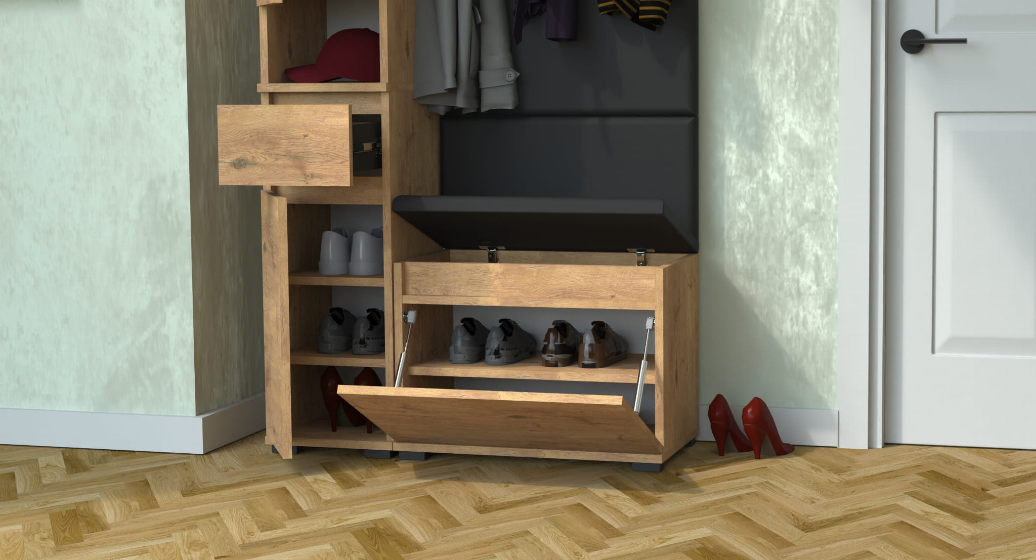 Meble wyprodukowane w Polsce, przeznaczone do przedpokoju. Doskonałe do przechowywania ubrań, obuwia i innych przedmiotów codziennego użytku. Wykonane z wysokiej jakości płyt meblowych renomowanych producentów, posiadają niezbędne certyfikaty i atesty higieniczne.