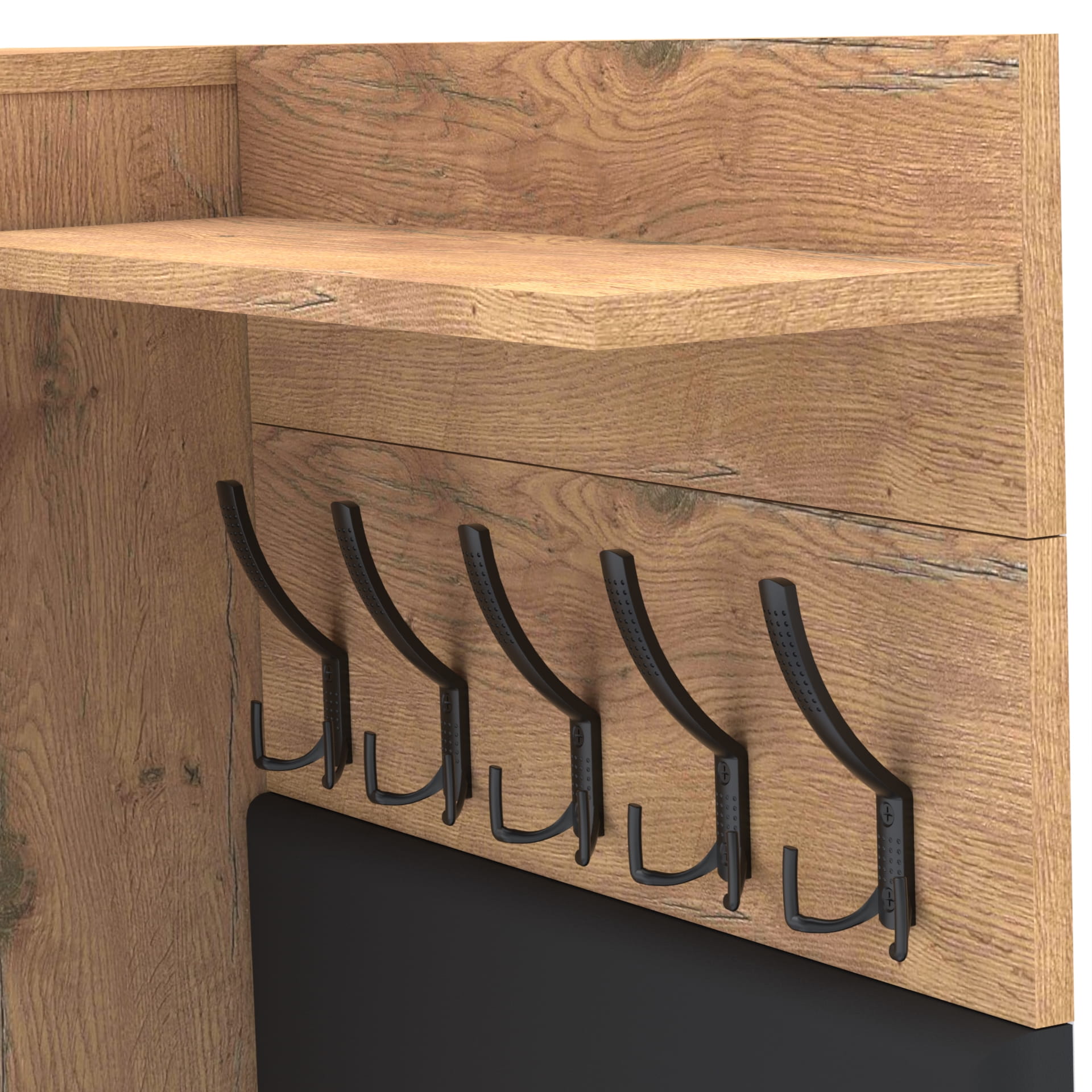 Wieszak składa się z 2 części: wieszak i półka. Płyta tylna wieszaka oraz półki mają po 18cm wysokości.