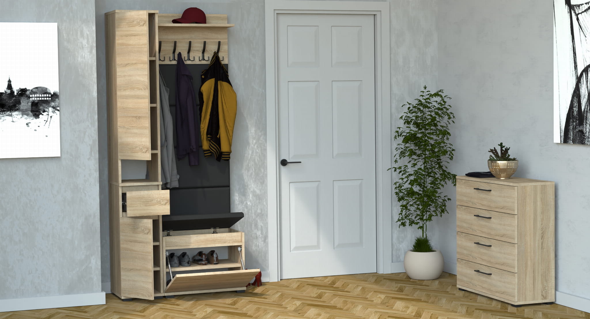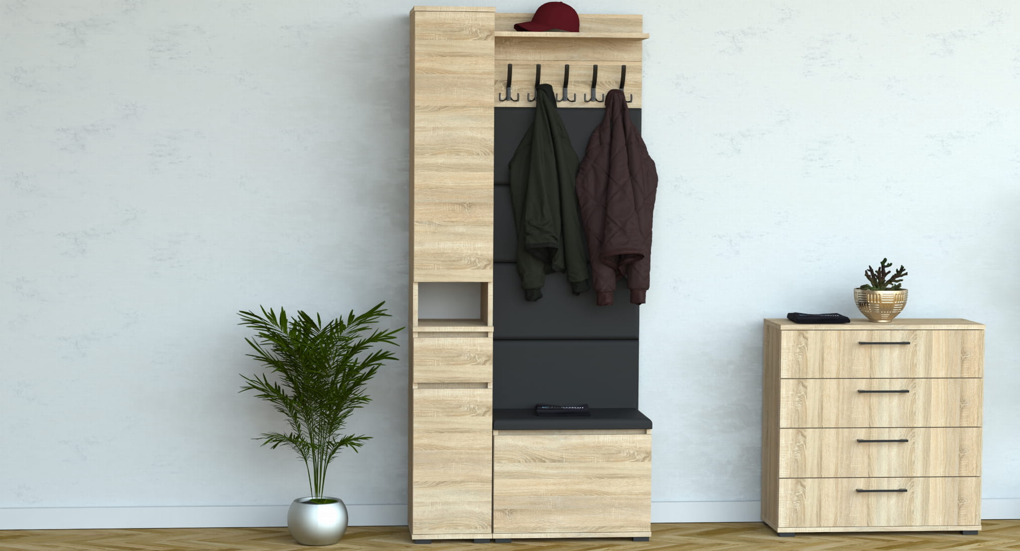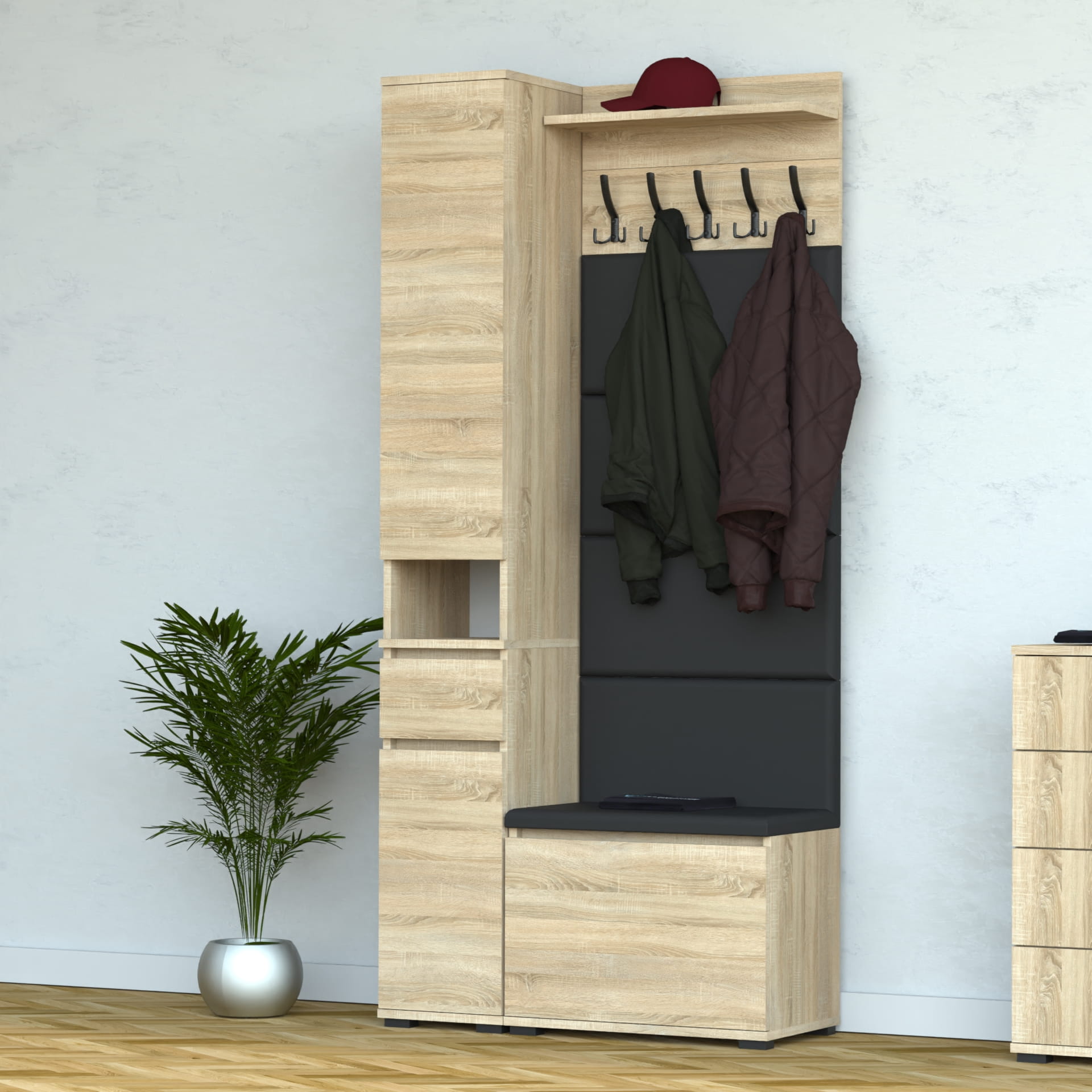 Zestaw szafka na buty z siedziskiem, Komoda Tres z nadstawką SUPRA, Panele ścienne, Wieszak