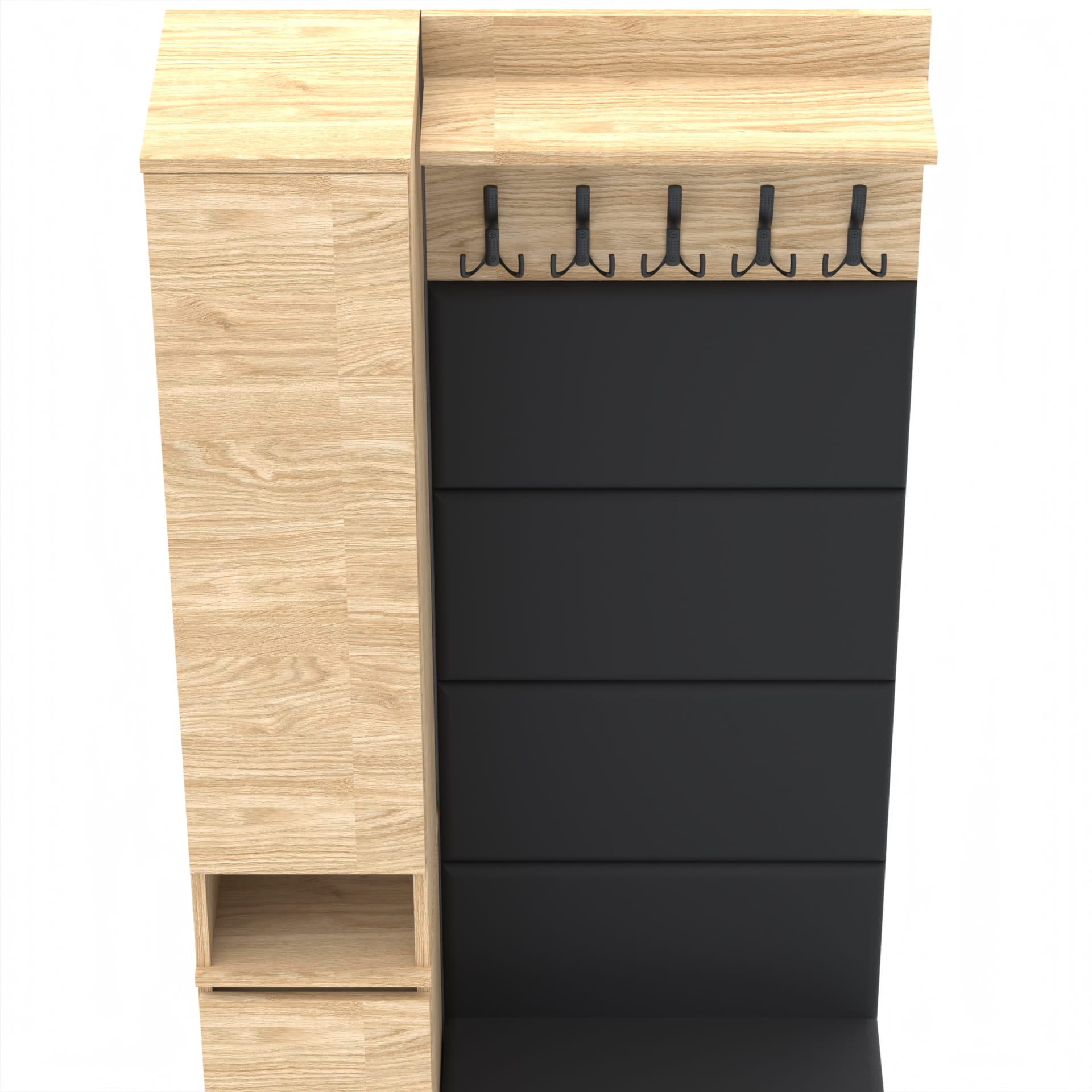 Na górze struktury znajduje się praktyczna półka o głębokości 18 cm, która jest idealna do przechowywania różnych przedmiotów. Półka nie tylko zapewnia dodatkową przestrzeń do przechowywania, ale także stanowi integralną część designu wieszaka, nadając mu ciekawy, nowoczesny wygląd.