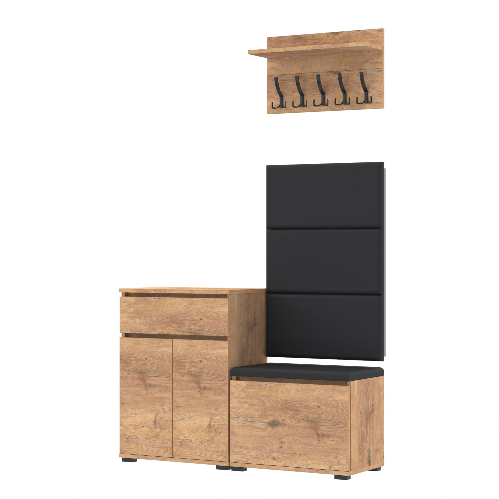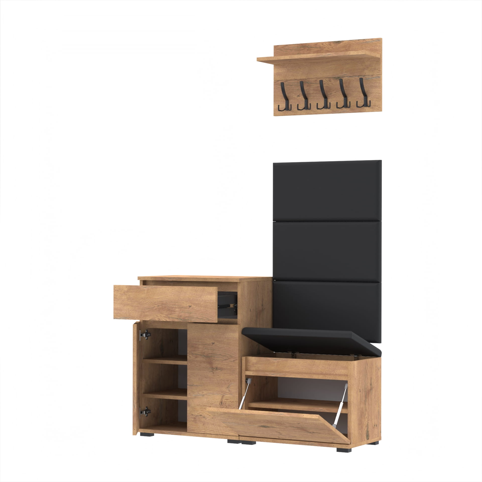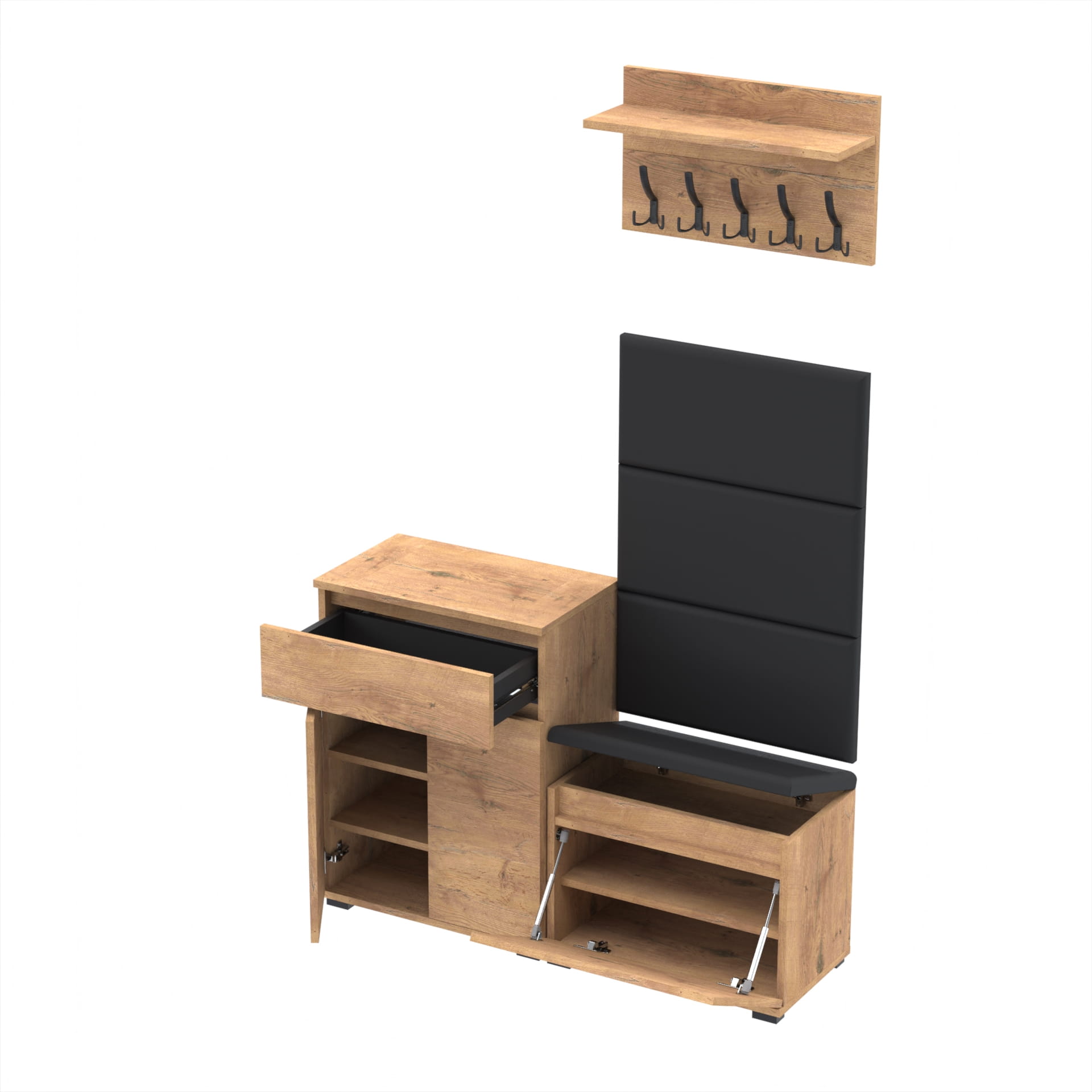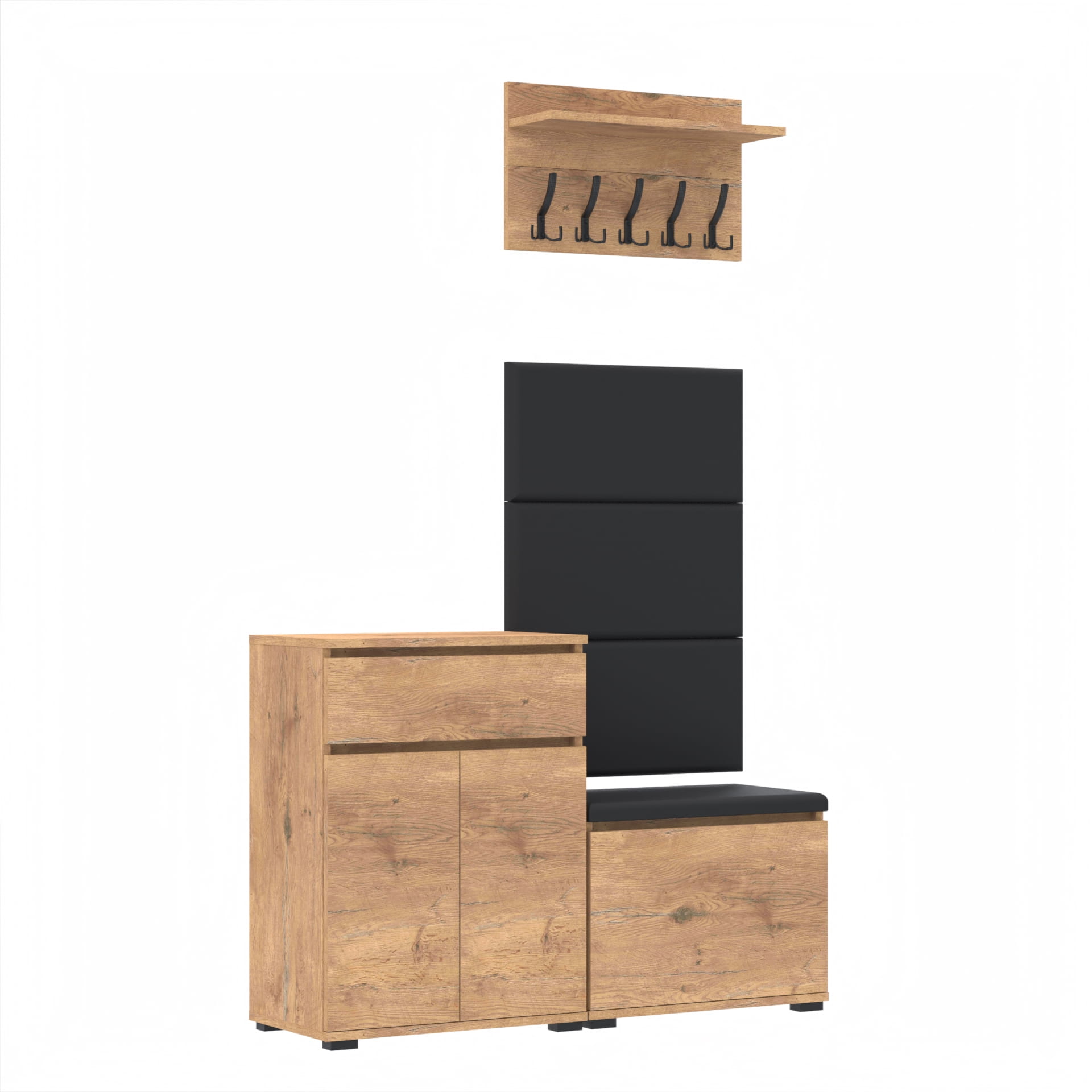 Zestaw - szafka na buty ze schowkiem, wieszak ścienny, półka, 3 panele tapicerowane.