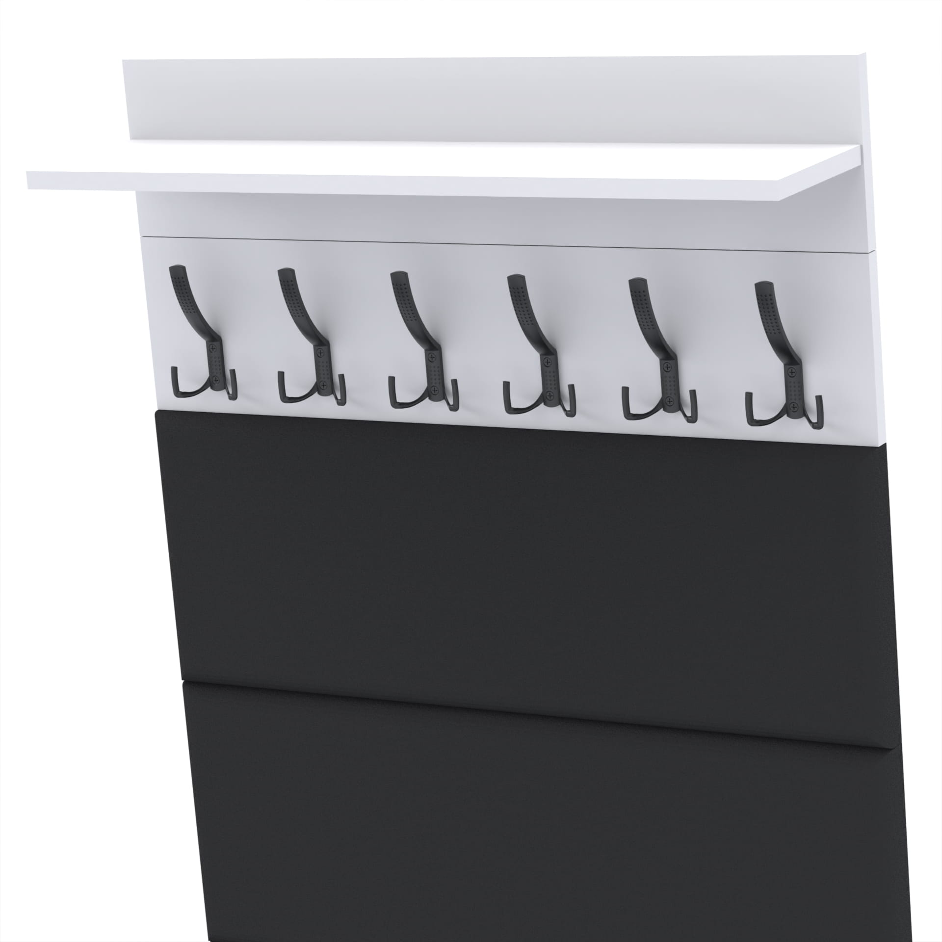 Na górze struktury znajduje się praktyczna półka o głębokości 18 cm, która jest idealna do przechowywania różnych przedmiotów. Półka nie tylko zapewnia dodatkową przestrzeń do przechowywania, ale także stanowi integralną część designu wieszaka, nadając mu ciekawy, nowoczesny wygląd.