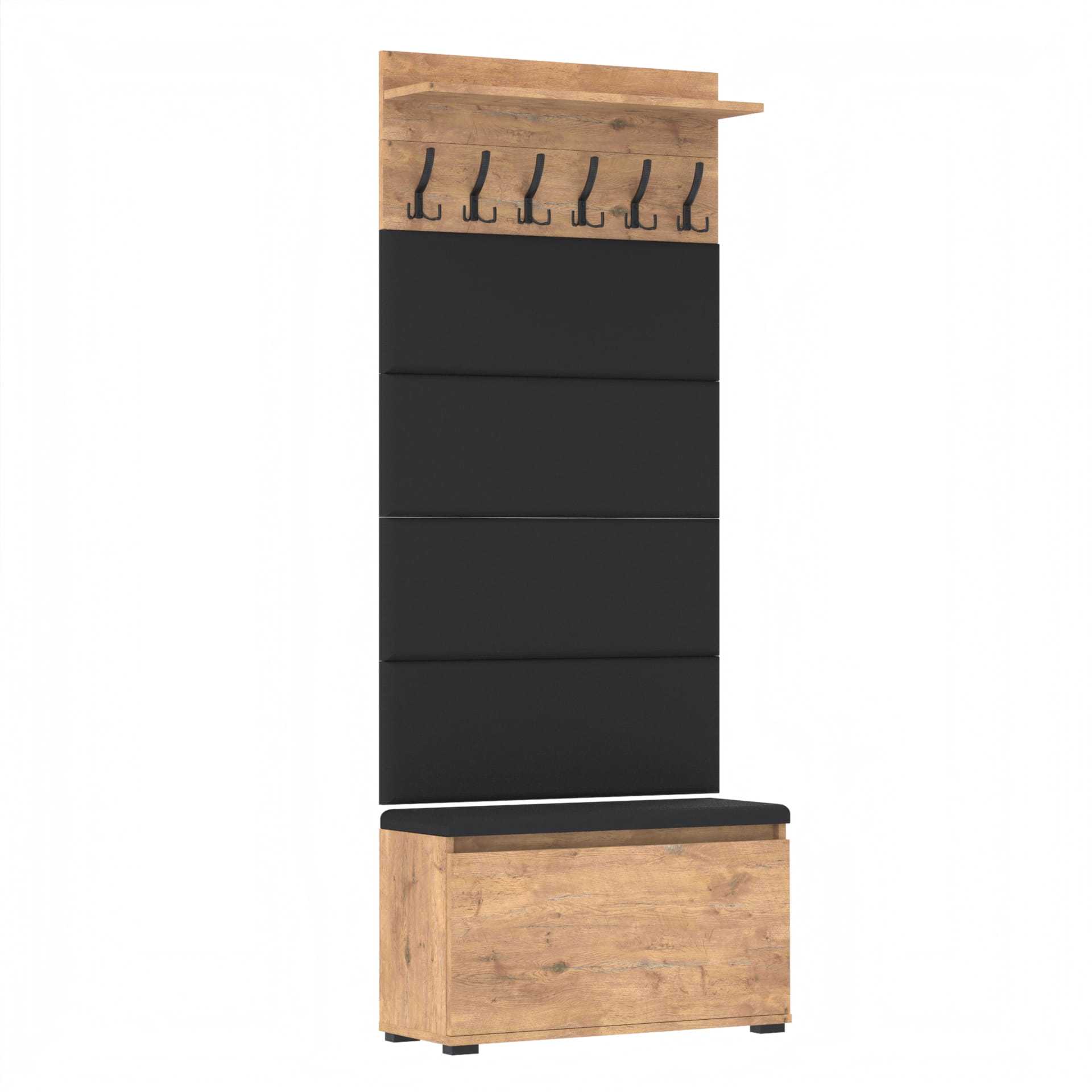 Materiał: Płyta meblowa 18mm, obrzeże ABS, okucia metalowe, stopki tworzywo sztuczne, haki wieszka metalowe.
