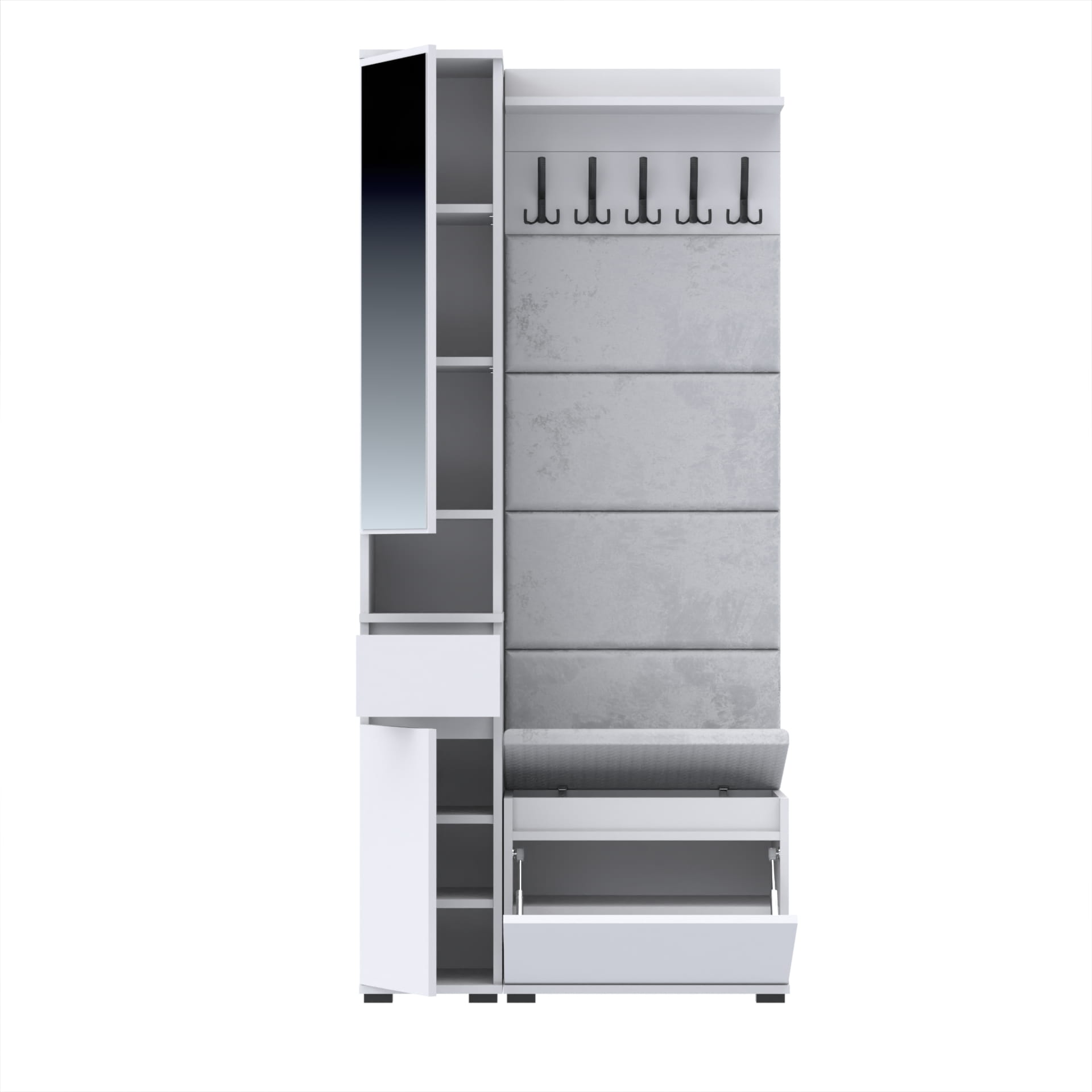 Oferujemy elegancką garderobę do przedpokoju, która łączy w sobie nowoczesny design i funkcjonalność. Nasza garderoba jest idealnym rozwiązaniem do każdego wnętrza, zapewniając nie tylko miejsce na odzież wierzchnią, ale także przestrzeń do przechowywania butów i innych akcesoriów.