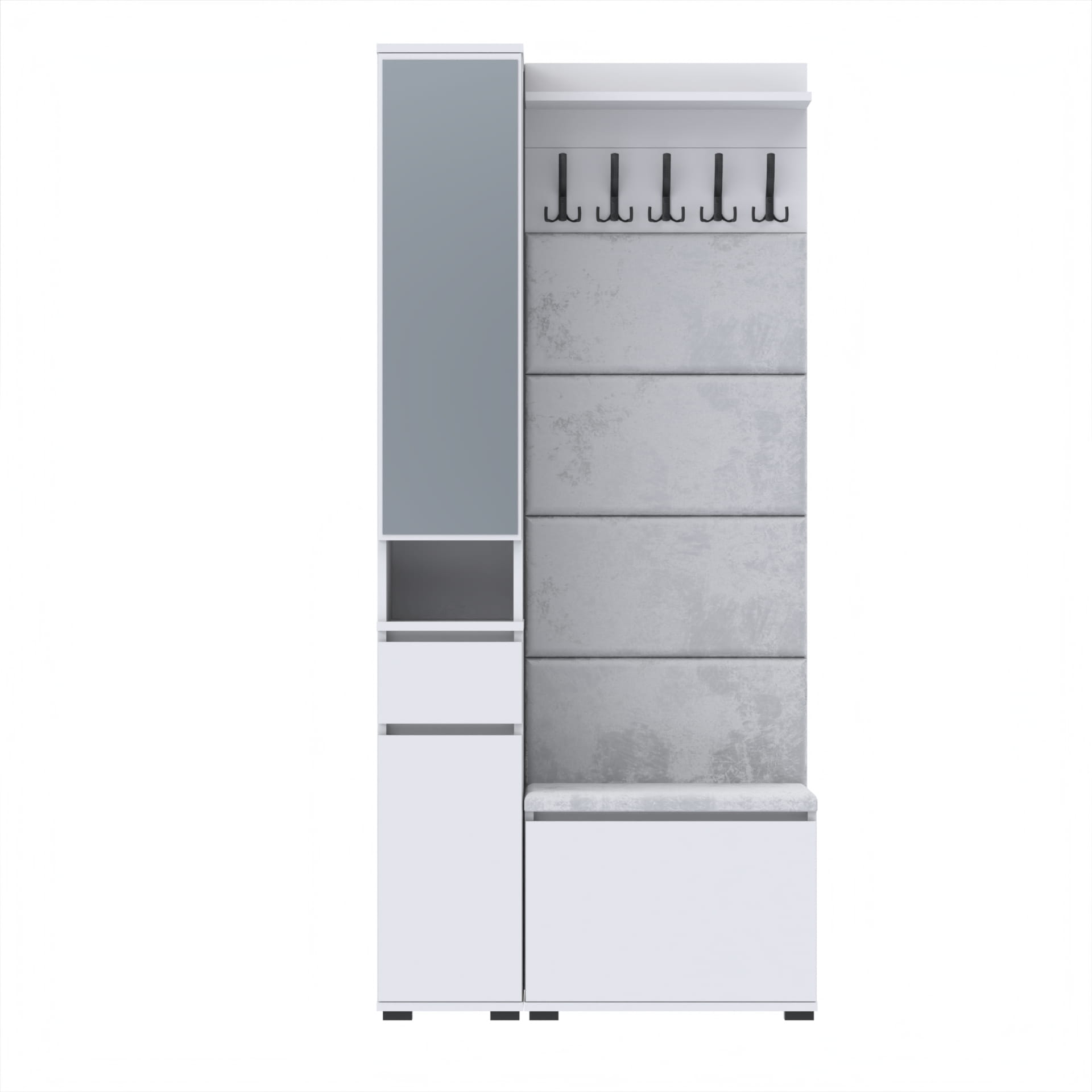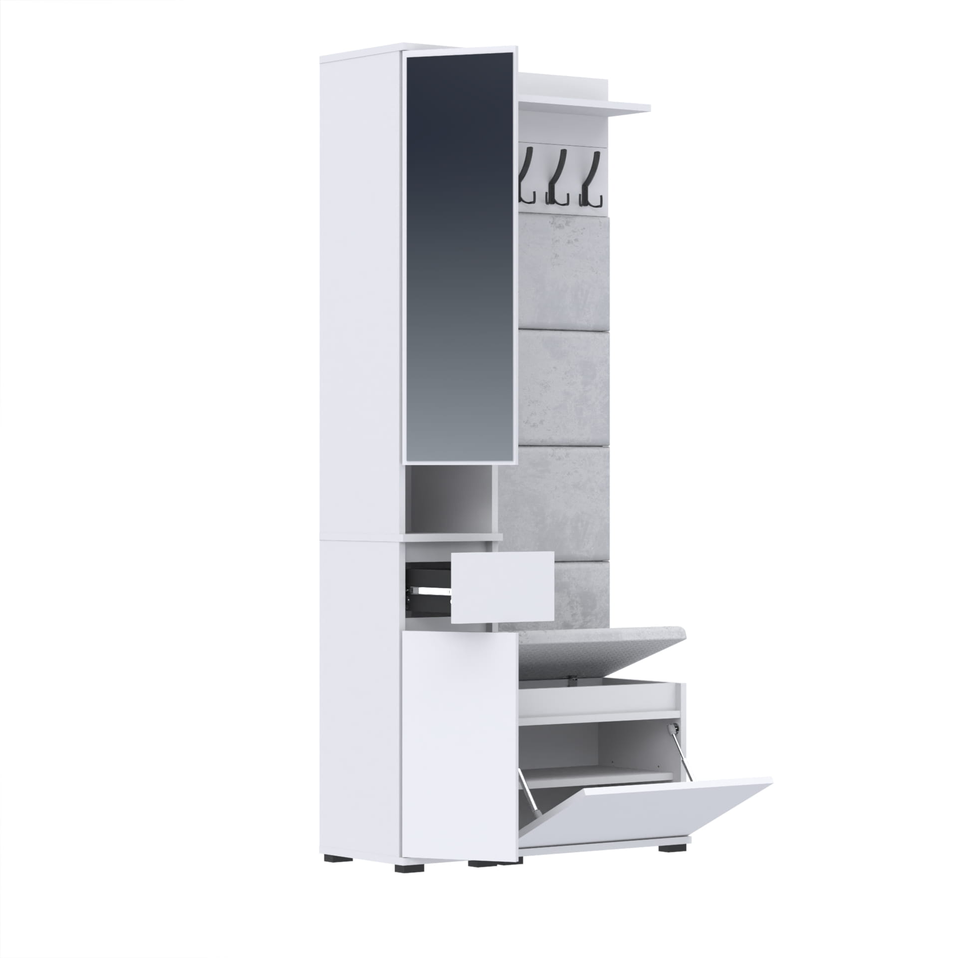 Oferujemy elegancką garderobę do przedpokoju, która łączy w sobie nowoczesny design i funkcjonalność. Nasza garderoba jest idealnym rozwiązaniem do każdego wnętrza, zapewniając nie tylko miejsce na odzież wierzchnią, ale także przestrzeń do przechowywania butów i innych akcesoriów.
